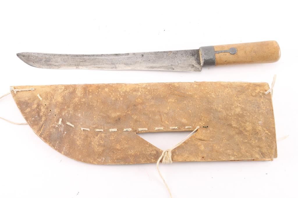 Leather scabbard with beaded design on one side includes a trade knife with wood handle 16" with a 11" blade.