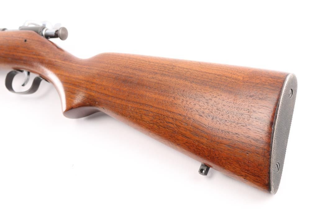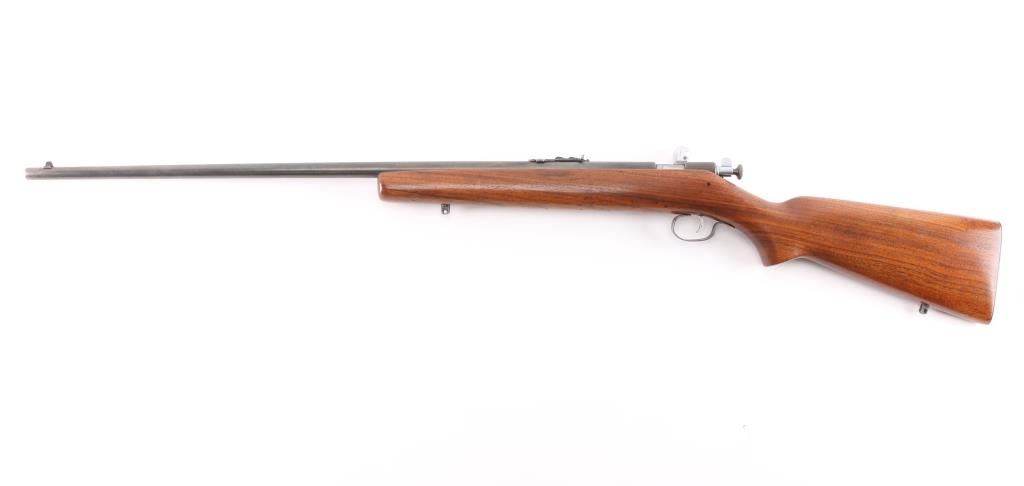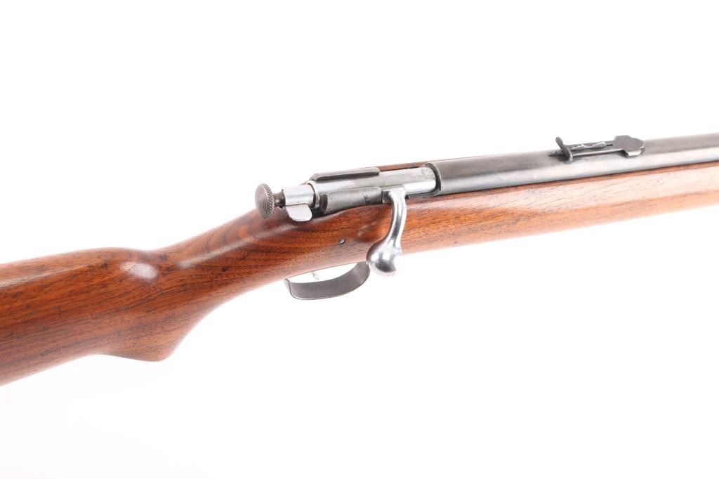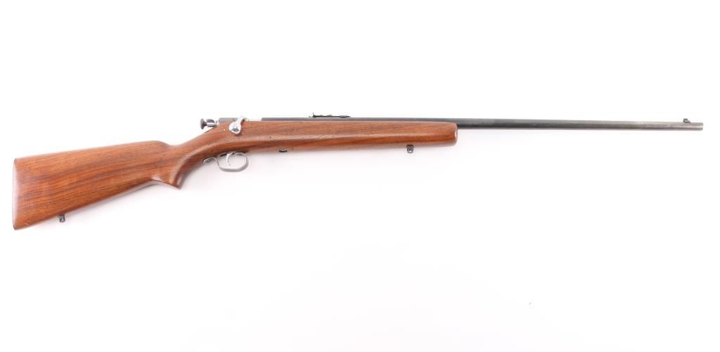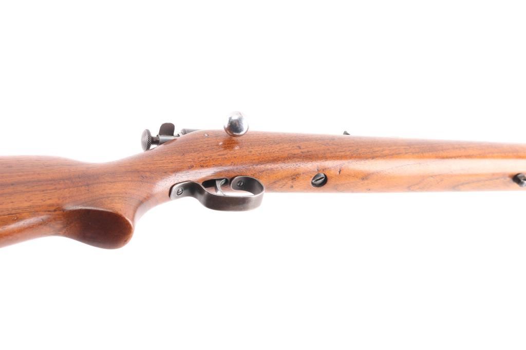 American made manual cocking single shot bolt action rifle manufactured circa 1934-1963. Features a blued finish, 27" barrel, dovetailed blade front sight with bead top, sporting rear sight, chromed trigger & bolt, metal trigger guard, knurled cocking piece, manual safety on the rear of the bolt, smooth walnut pistol grip shoulder stock, knurled steel buttplate, sling swivel studs. Bore is very good/bright condition. Retains most of the blue finish, dull and thinning Chrome finish on bolt is worn. Stock is very good condition with some minor scratches.NRA Condition-Very Good. C&R Firearm.