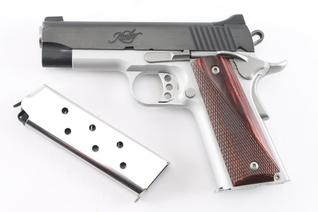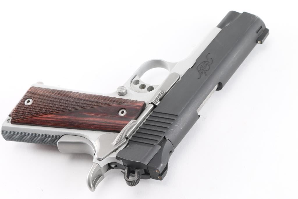 Premium quality 1911-A1 style single action semi-automatic compact pistol chambered in .45 Acp. Features a blued carbon steel slide, match grade 4" bushing less stainless steel barrel, full-length steel guide rod, dovetailed low-profile 3-dot sights, serrated adjustable trigger, skeletonized hammer, thumb safety, beavertail grip safety, satin silver finished aluminum frame, push button magazine release, knurled flat mainspring housing, factory 8 round magazine, and partially checkered rosewood grips. Includes spare factory magazine. (2) total. Pistol exhibits little visible wear, minor scratches/edge wear on the slide. Action is smooth, bore is excellent/bright and grips are fine. Condition is NRA Excellent. Modern Firearm