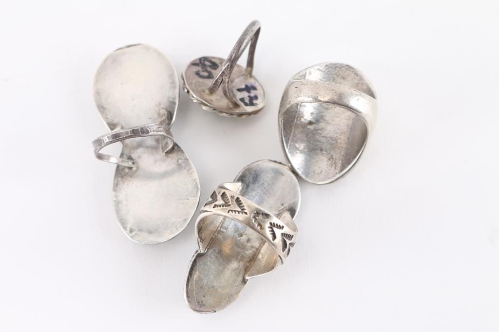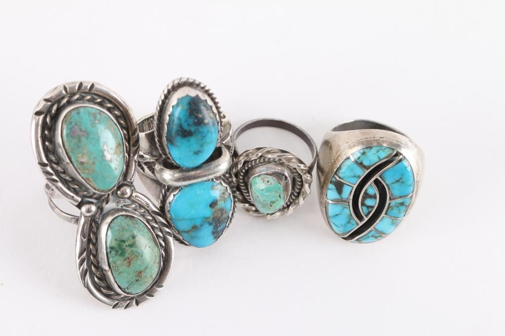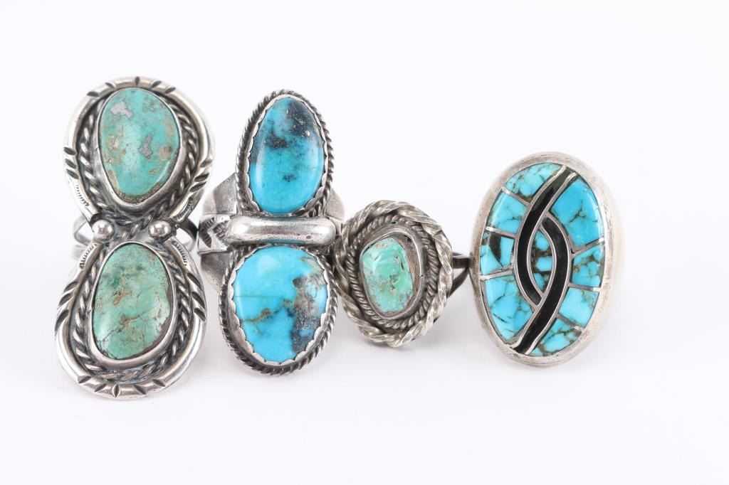 (1) Mens Inlaid ring with turquoise and onyx set in sterling; (1) Womens two-stone ring set in sterling; (1) Vintage Womens green turquoise ring set; (1) Single stone turquoise ring set in sterling.