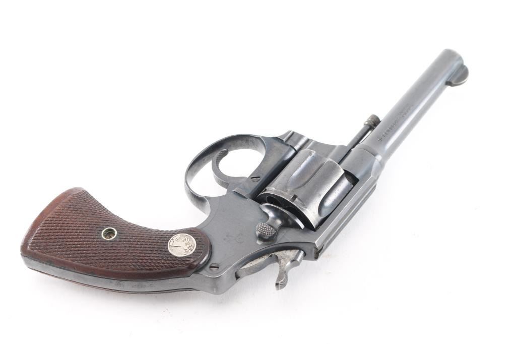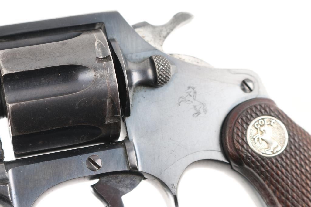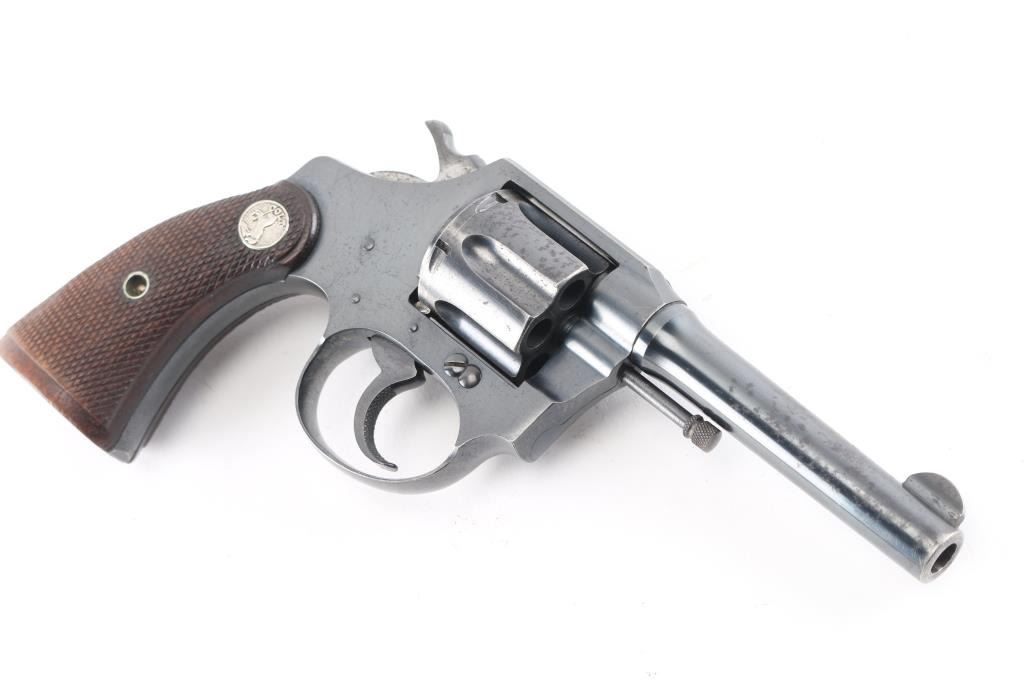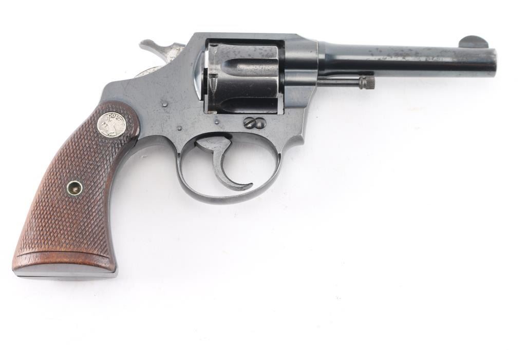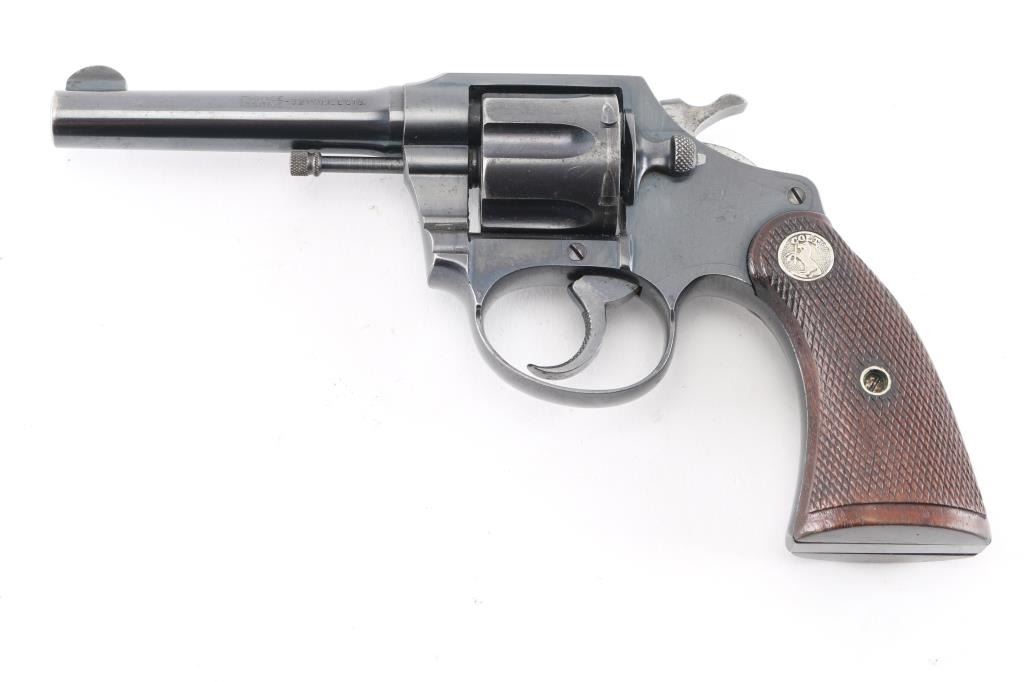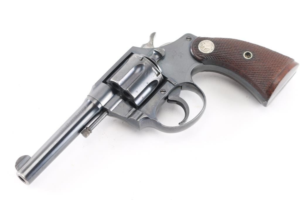 Double/single action revolver chambered in .32 S&W Long, features a blued finish, checkered brown wood grips with silver Colt medallions, 4" barrel, fixed sights. Bore is good/bright with strong rifling. Charge holes are very good. Retains approx. 80% finish with some scattered pin prick pitting and edge wear. Grips are very good. Action is smooth/crisp with solid lockup. Manufactured 1929.Condition is NRA Good. ***C&R Firearm***
