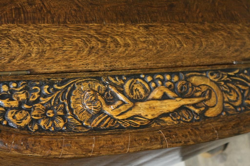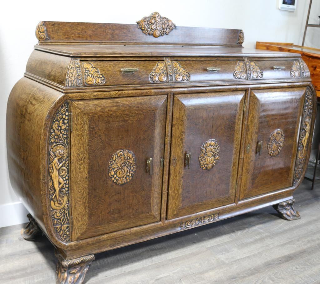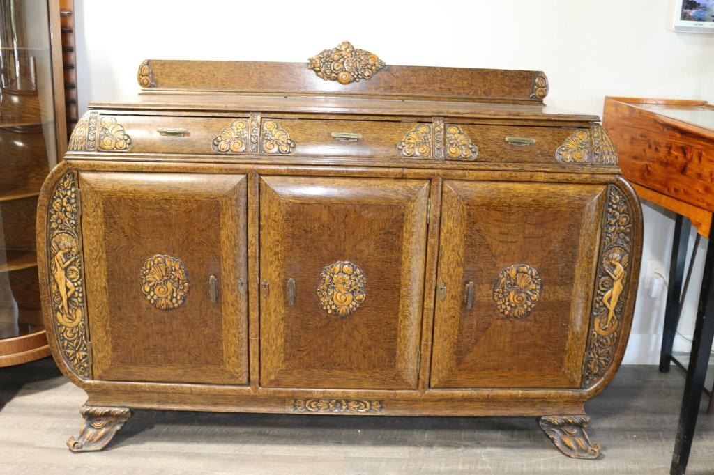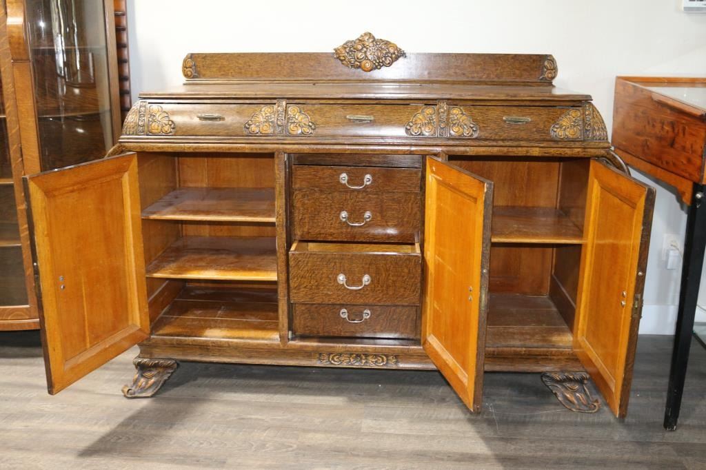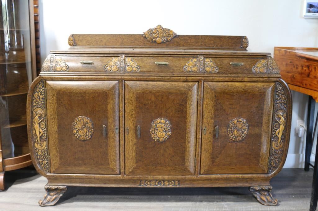Gorgeous antique carved tiger oak buffet, with rounded out sides, three top drawers and three lower cabinets, the center of which contains 4 drawers. This Victorian era piece is decorated with carvings of nymphs on the front, a womans profile on center cabinet, and a bird, butterflies, flowers and fruit in the other decorative carvings. Legs are carved devils heads. Some minor damage to wood on rear right foot. Handles are brass. Measures 6 across, 44" tall plus another 8 1/2" for backdrop, 23" deep. LOCAL PICK UP ONLY. CANNOT BE SHIPPED.