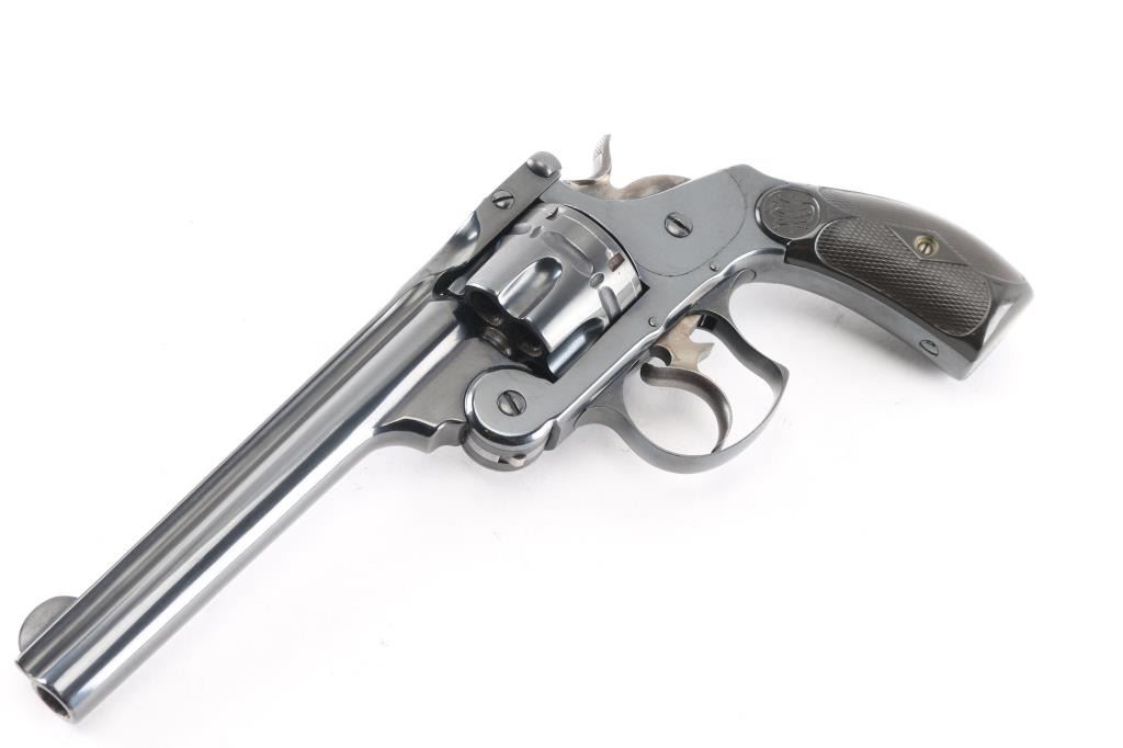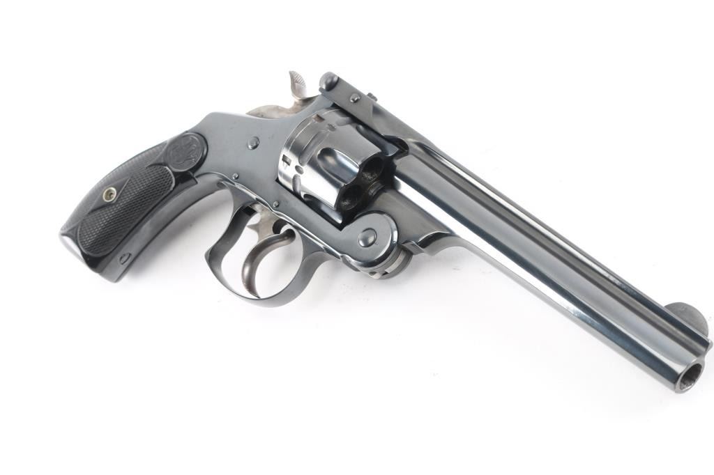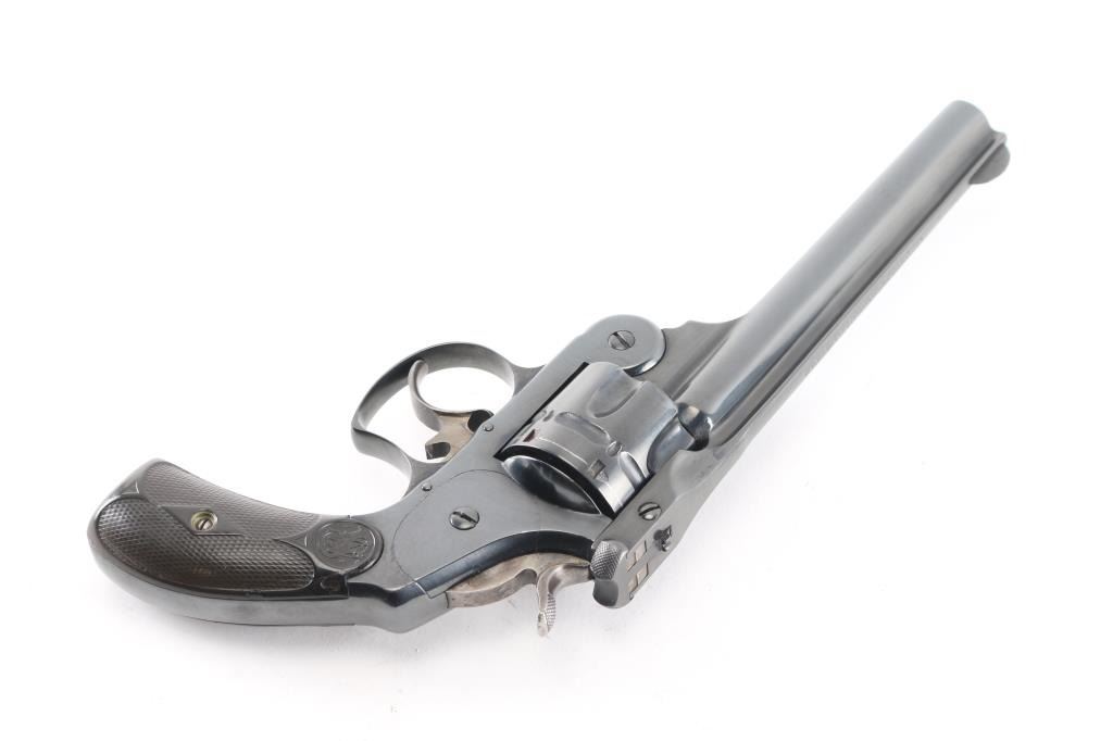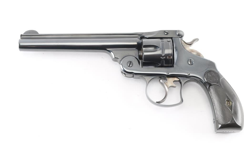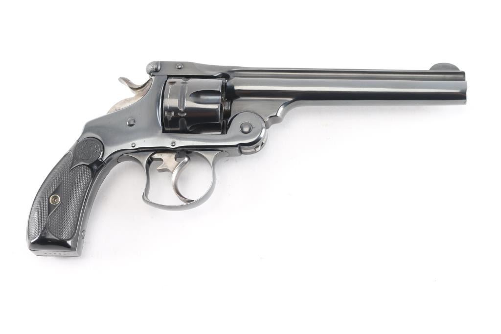 #37995. This revolver has been professionally restired. All frames of the .44 Double Action First Model Revolver were manufactured between 1881 and 1898, but this model was listed in the company catalogs and sold up until 1913. Break-top, 6-shot fluted cylinder, 6" ribbed barrel with round blade front sight, integral notch rear sight in the barrel latch, hammer & trigger are case colored, two line address/patent dates on barrel rib. Checkered hard rubber grips with S&W motifs. Serial numbers matched on heel, cylinder and barrel latch. The reblue finish is about 98% with feint tracking on the cylinder, minor scratches, traces of case color on the trigger, hammer, action is smooth, barrel locks-up tight, star ejector works well, bore is bright with good rifling. scattered light pitting. Grips are very good/sound.Comes with a box of 50240 Ga. RNFP black powder .44 Russian cartridges.NRA Condition-Very Good. Antique Firearm.
