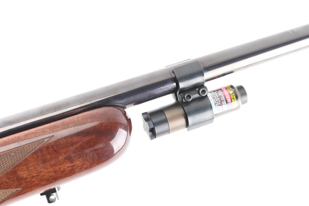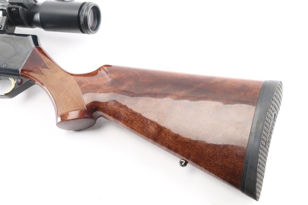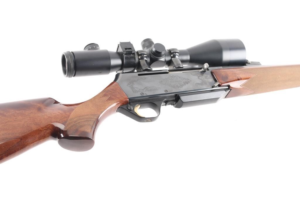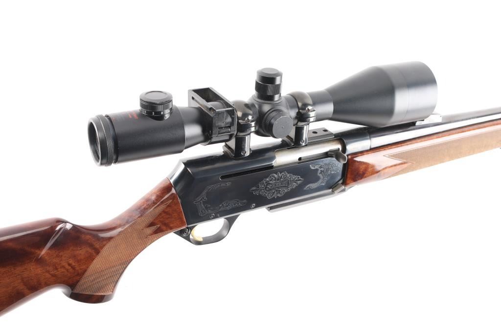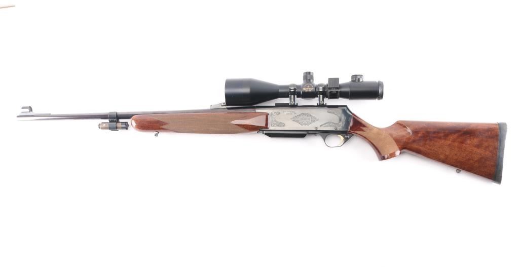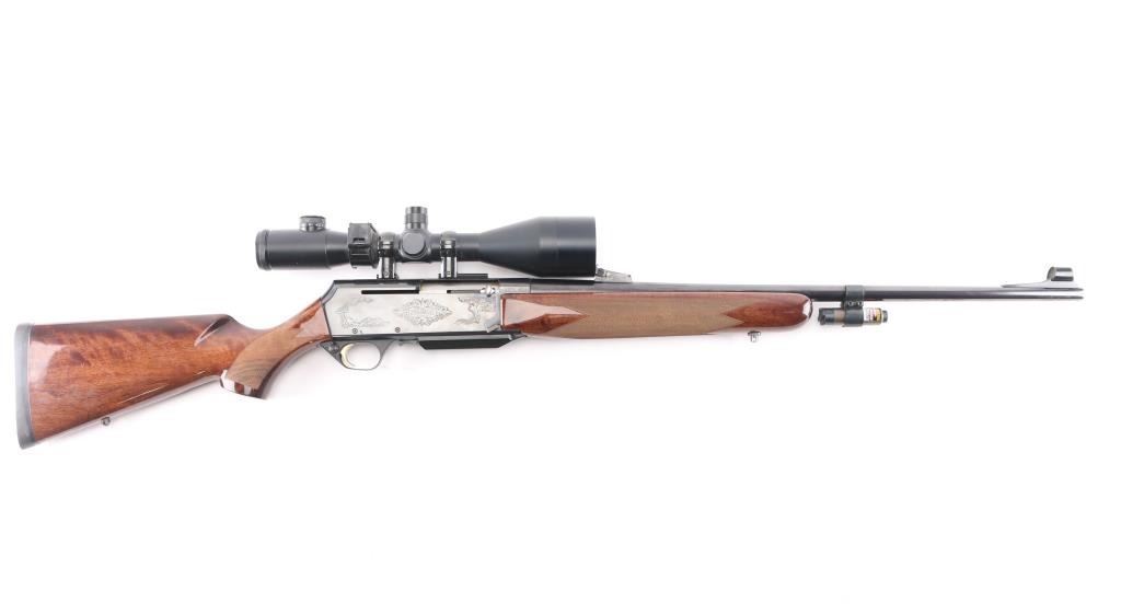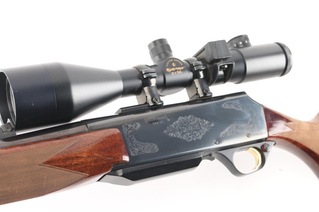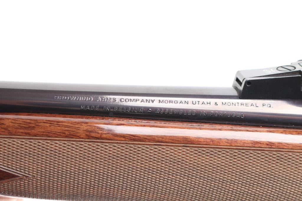 "Safari". Grade II. Semi-Automatic rifle. Belgium made by FN. Barrel stamped "Browning Arms Company Morgan Utah & Montreal P.Q." , "Made in Belgium-Assembled in Portugal". 24" hammer forged, high-polish barrel with hooded blade/bead front, adjustable u-notch rear sights. 10" twist. Short action. 13.3/4" pull. Polished blue steel receiver with 4-rd detachable box, hinged floorplate, magazine. Chrome plated chamber. Grade I Turkish Walnut checkered select gloss stock, and forearm. black rubber Browning recoil pad. Sling swivel studs. Smooth gold-toned trigger. Push safety on Buck marked triggerguard. Floral/scroll engraved with "Safari" on both sides of receiver. Bore is very good./bright, needs cleaning. Action is crisp/tight. Wood and blue finish are excellent. Mounted with Custom Superb Nightforce 8X56 Scope. Clear optics. Laser sight mounted on the underside of the barrel. Manufactured 1995.NRA Condition-Excellent. Modern firearm.