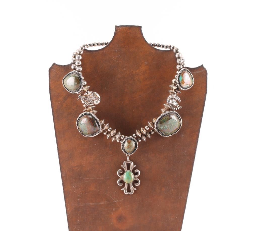 Choker length with 5 green turquoise stones with a hanging sand cast pendant in center all sterling.