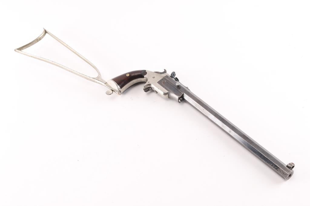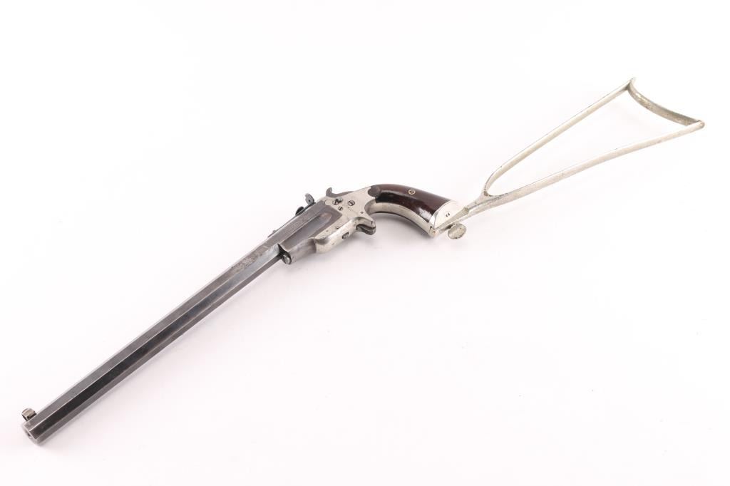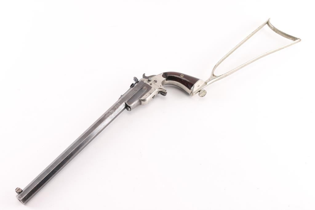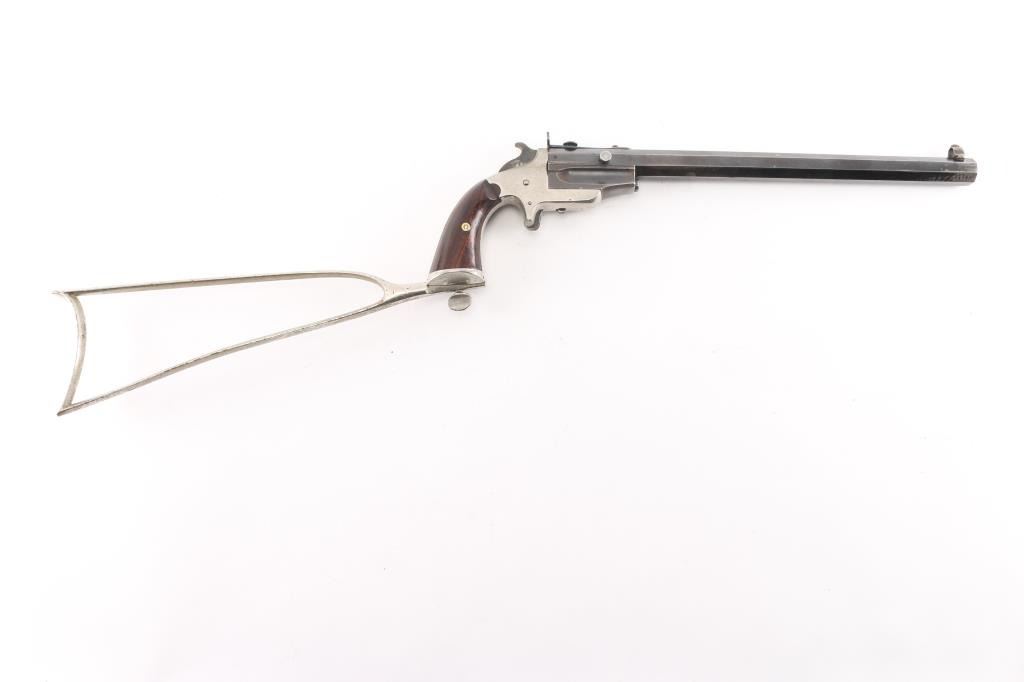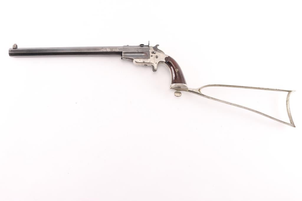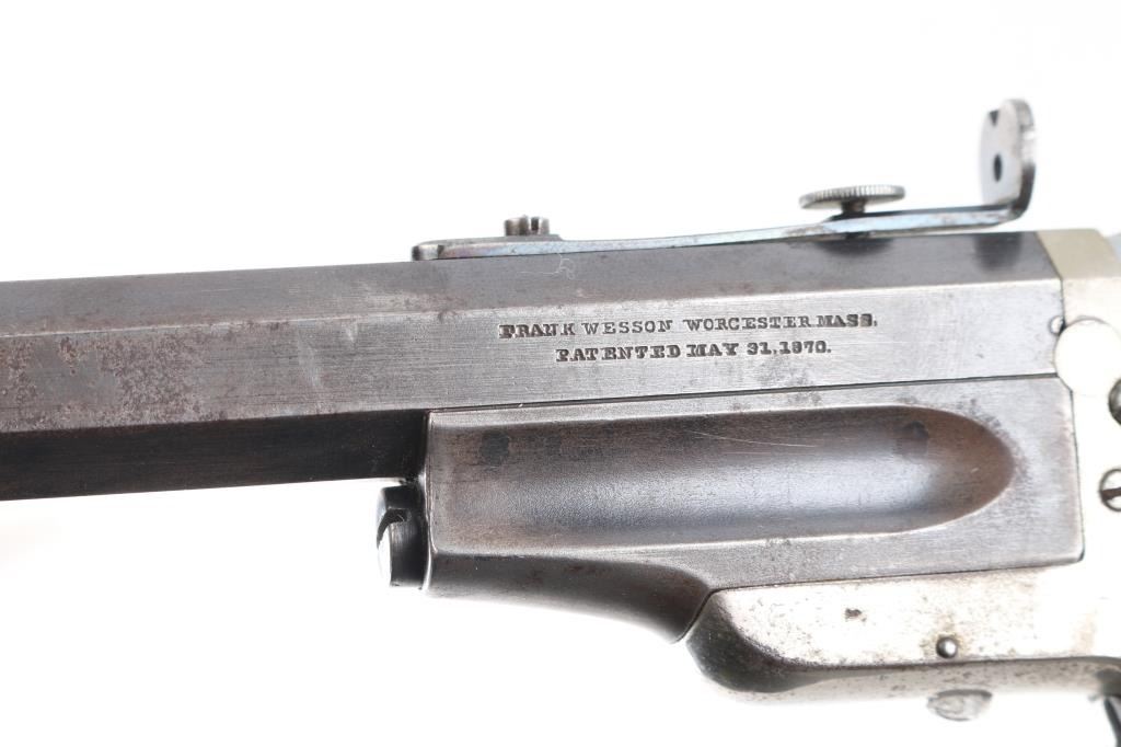 SN: 71. Sportsmans Jewel Medium frame, third type, right side loading, manufactured 1870-1893. The left of the barrel is marked “FRANK WESSON WORCESTER MASS. / PATENTED MAY 31, 1870.” The butt of the grip frame is marked with the serial number “71”. The bottom of the barrel assembly is marked “71”. Each grip panel is stamped with the serial number, 71” on the inside. Detachable shoulder stock is correct but unmarked. Nickel finished iron frame, blued barrel, 15" octagonal heavy barrel, globe/post front sight, elevation adjustable aperture rear sight, right frame push button hammer block, rosewood grips. Bore is good/bright, rifling is good with a couple of patches of light very pitting, barrel locks up tight, grips are near excellent with a few very minor scratches, nickel finish is about 96% with edge/handling wear. Blue is about 80% with handling/edge wear. Markings are crisp. Stock is good with minor flaking.NRA Condition-Near Excellent as Antique Firearm.