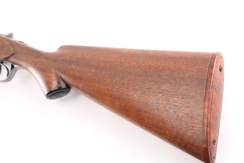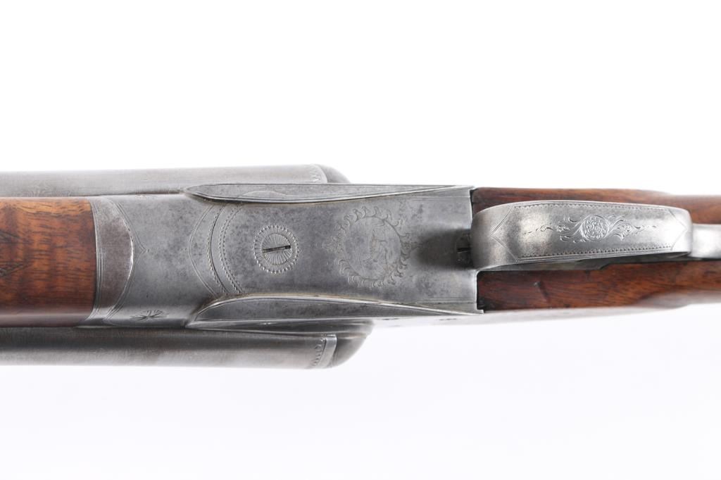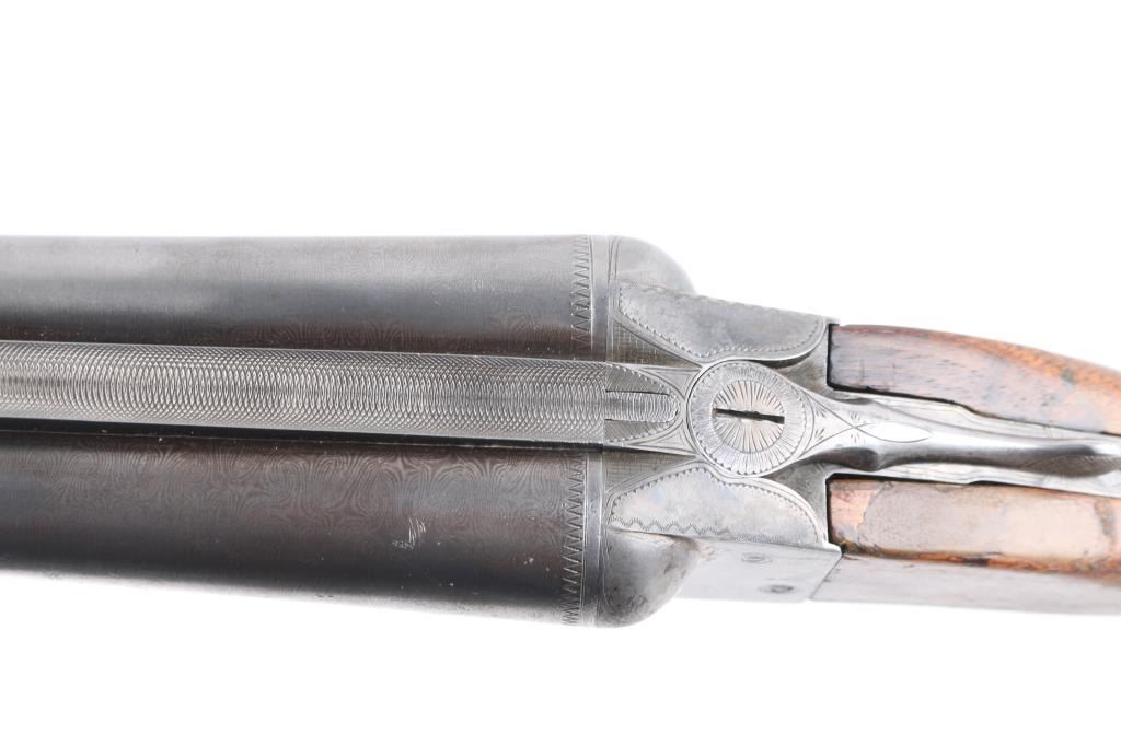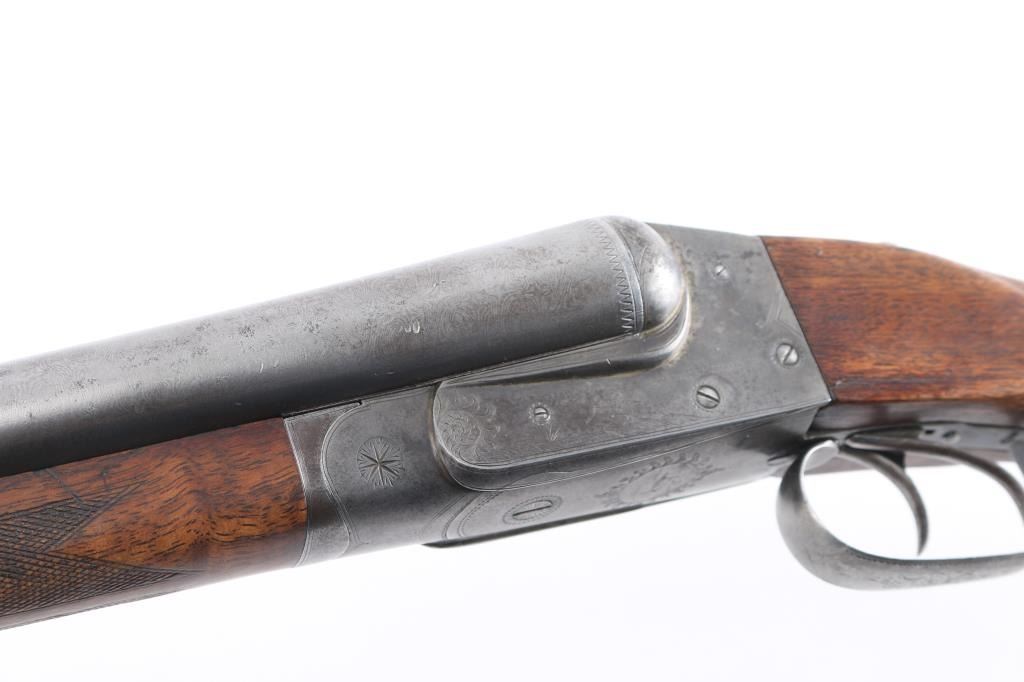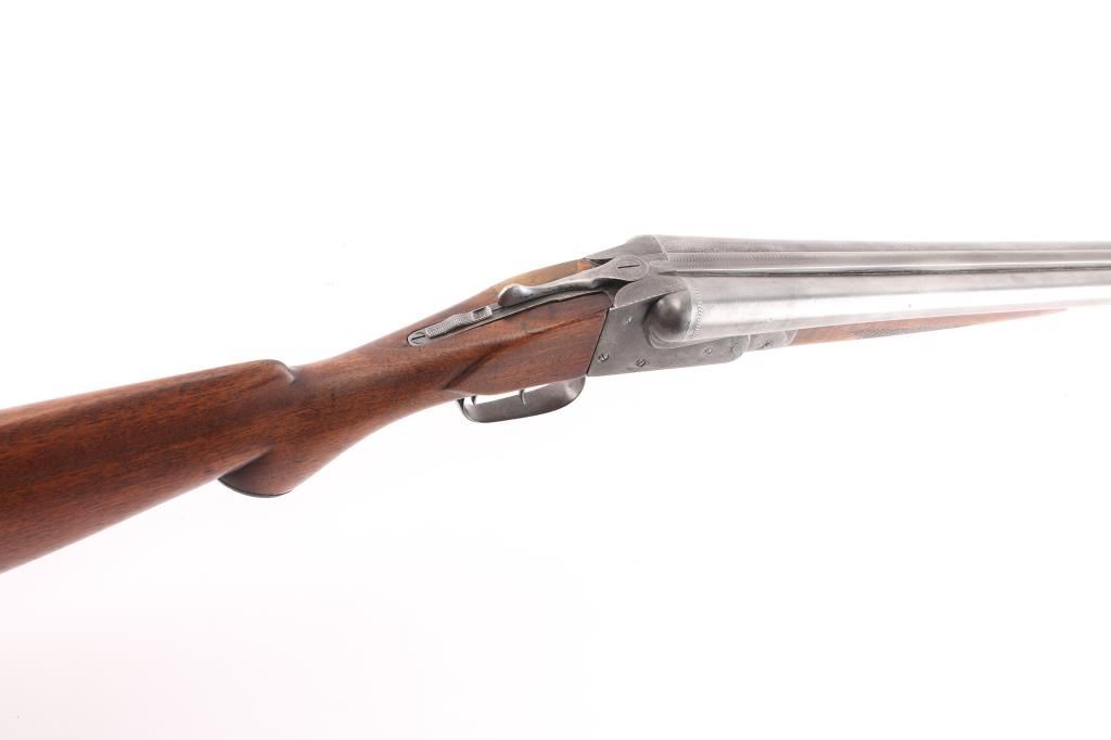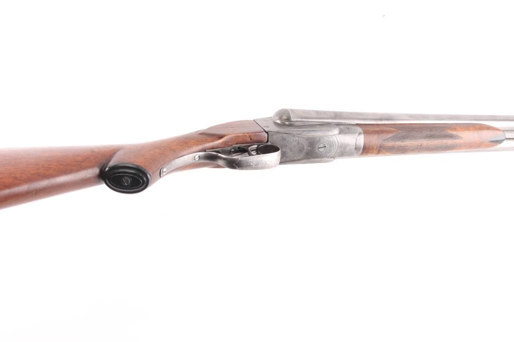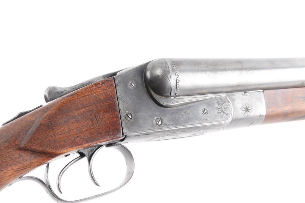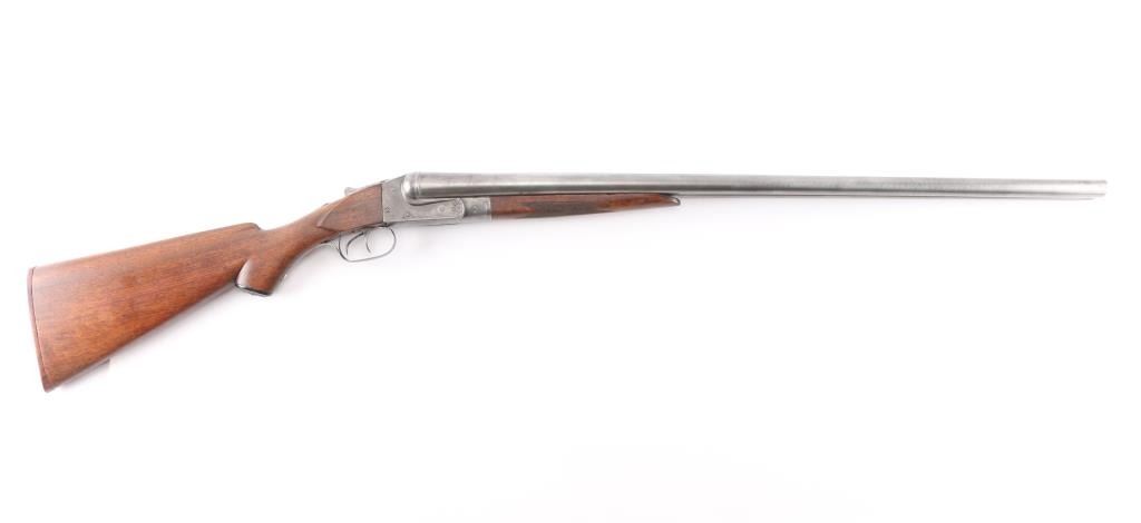 Grade 2, signifying a higher quality finish and materials. Hammerless boxlock. Manufactured 1903. 30 inch barrels with fine Chain Damascus pattern and very good/ bright bores. Fitted with a matted concave rib. Water table is stamped with serial number, matched on forearm wood/metal and barrel. Lewis style action retains traces of case color and has the Grade 2 style engraving of game birds. Top lever, double triggers, sliding tang safety, single extractor, assembly number 2457 matched on the extractor and underneath it. The buttstock is correct but a replacement as it is smooth and the original is checkered, the lower tang screws are replacements and the butt pad is wood. There is a couple of slight dings in the left bore towards the muzzle. LOP is 14 3/4 to front trigger. Both bores measure Full.NRA Condition-Fair to Good. C&R Firearm.