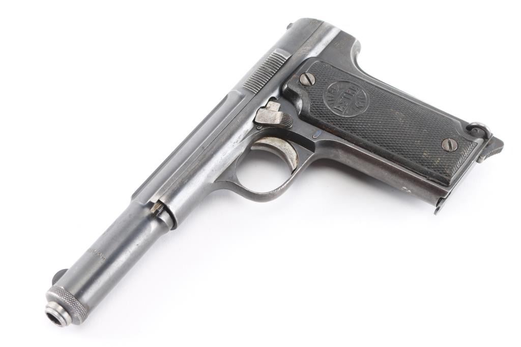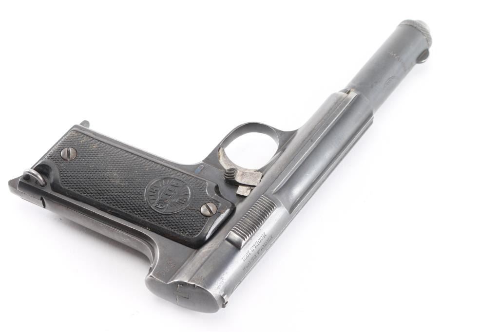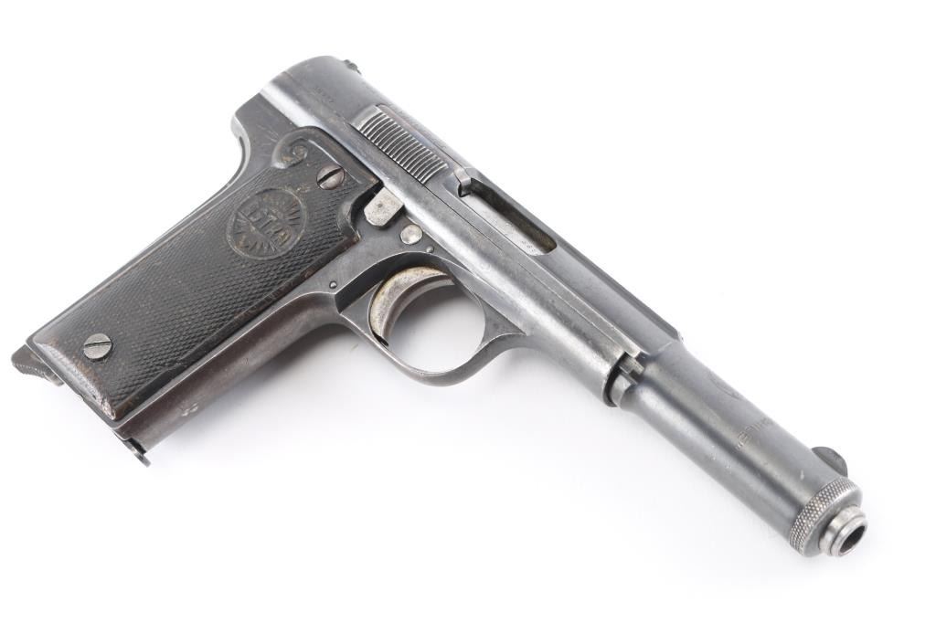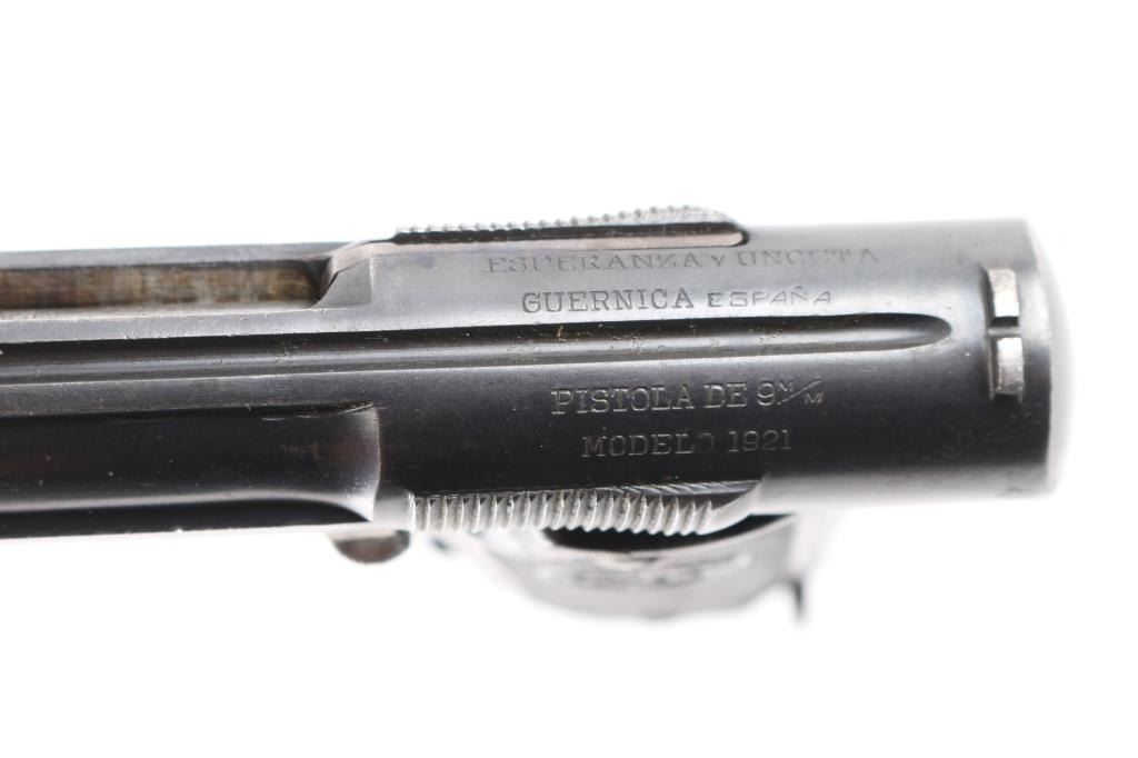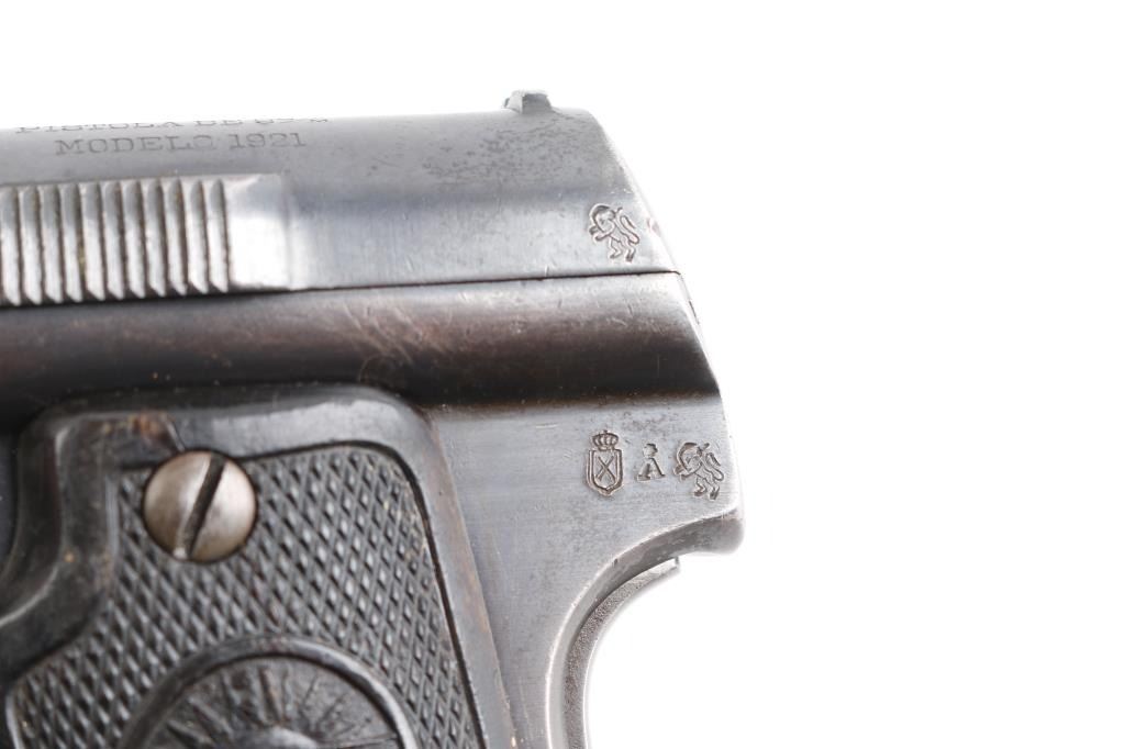 Spanish made single-action semi-automatic pistol, circa 1927. The Chilean Navy ordered only 842 of these pistols. Features an internal hammer with a 6 barrel and one magazine. Metal finish has heavy edge wear, especially on barrel cap with light patina on the grip straps. "MARINA DE CHILE stamped on top of slide. The bore has light rust with strong rifling. Grips have scrapes and some deterioration on right panel. Comes with spare metal magazine (2)total and box. NRA Condition is good. ***C&R Firearm***