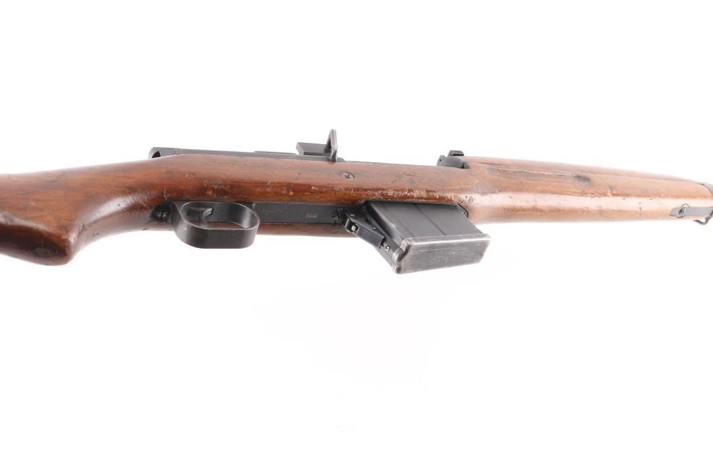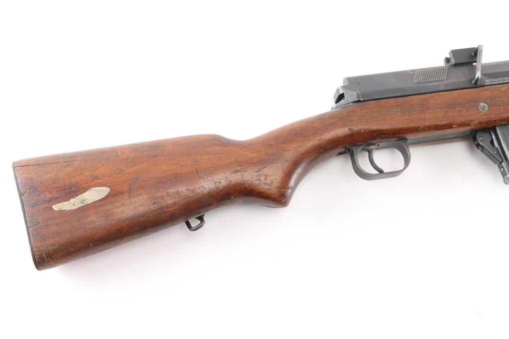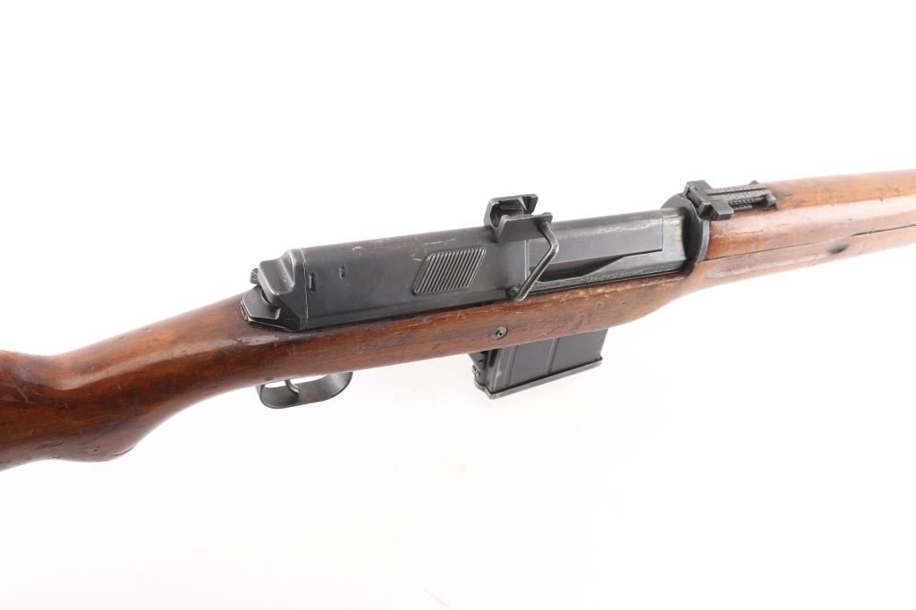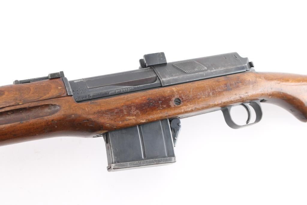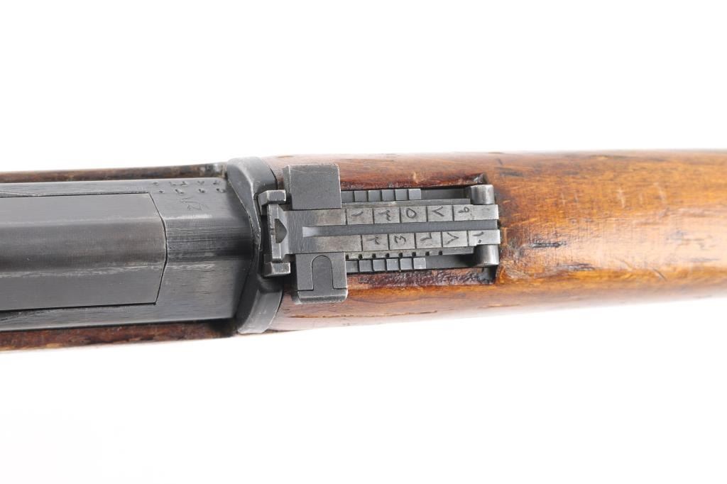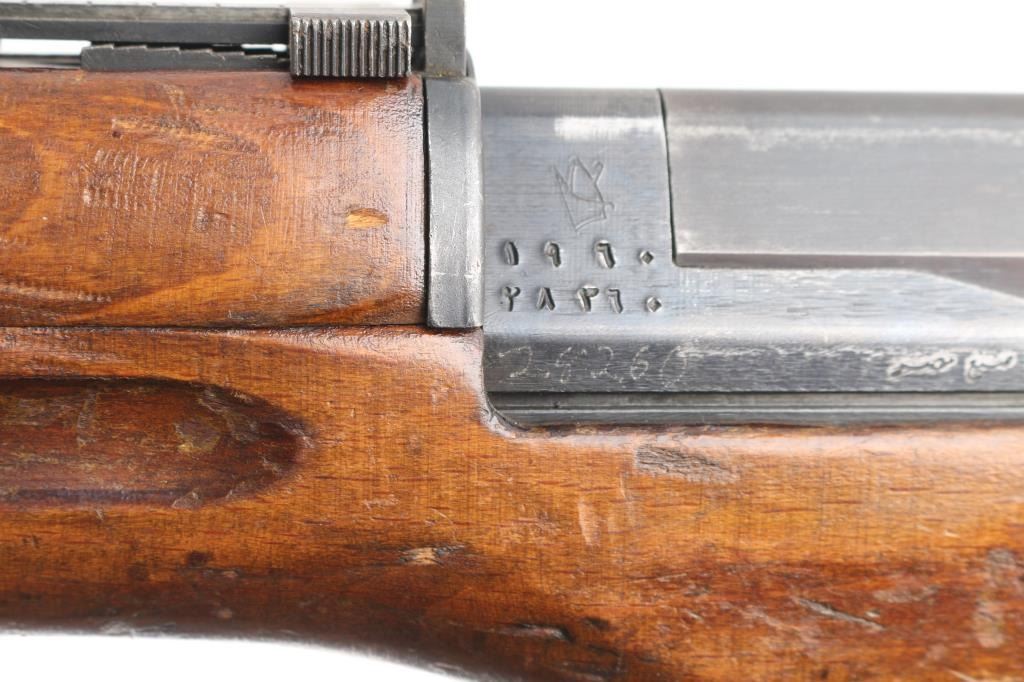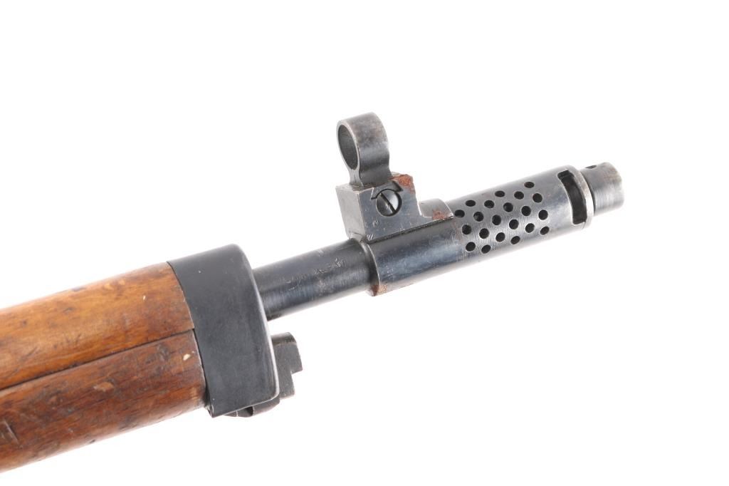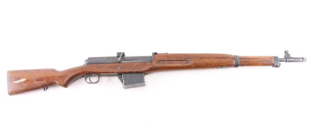 Egyptian military gas operated semi-automatic service rifle chambered in 7.92x57mm Mauser, manufactured by Maadi circa 1950s. Imported by C.A.I. St. Albans, VT. with import marks on the barrel. Features a blued finish, 24" barrel with integral compensator, hooded post front sight, tangent rear sight, bayonet lug, adjustable gas valve, detachable 10 round magazine, smooth trigger, manual safety, sling swivels, smooth wood handguard and a semi-pistol grip shoulder stock with smooth metal buttplate. Rifle exhibits approximately 80% of its blued finish showing scattered handling/edge wear, scratches. Action is strong, bore is dark/rough, rifling present and the wood stocks are overall good/sound with many dings/dents. Arabic symbols painted in white on the buttstock. Produced 1950s-1960s.Condition is NRA Fair to Good. C&R Firearm.