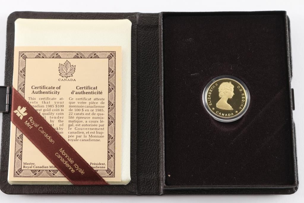 1985 - $100 Canadian Gold Proof Coin. 22k - 91.66% gold, 8.34% fine silver. Minted Royal Canadian Mint.