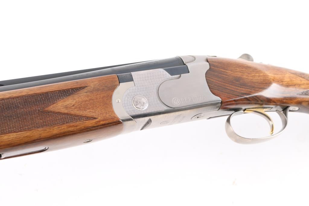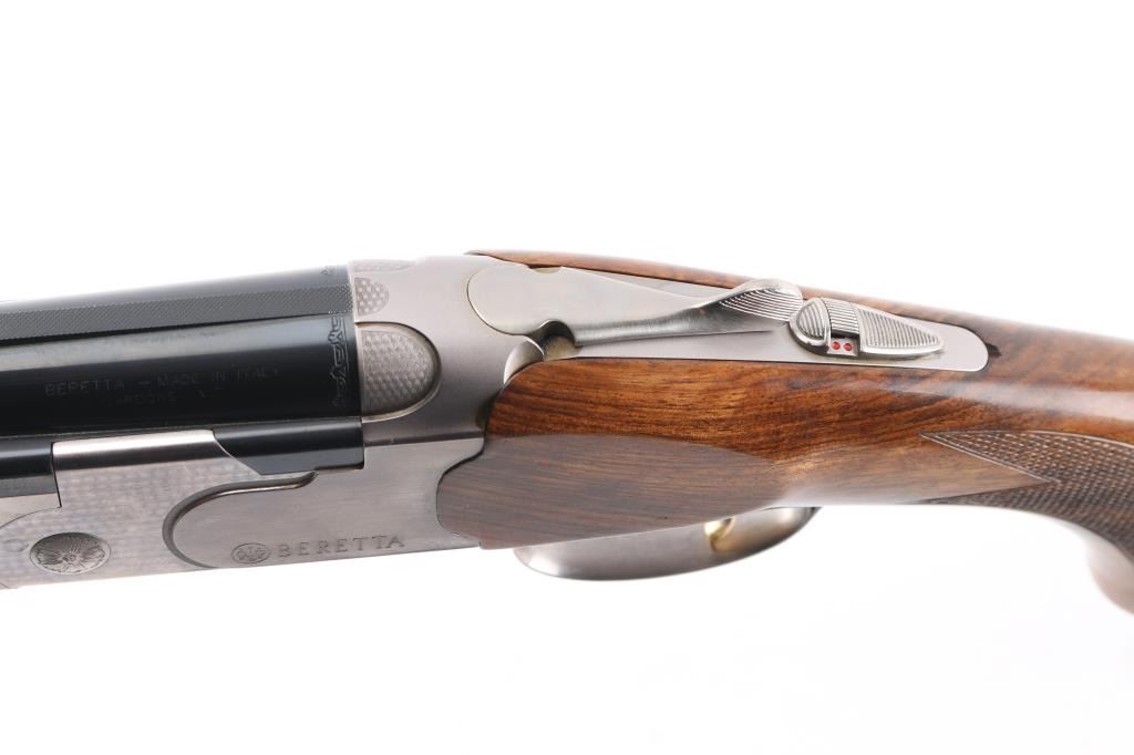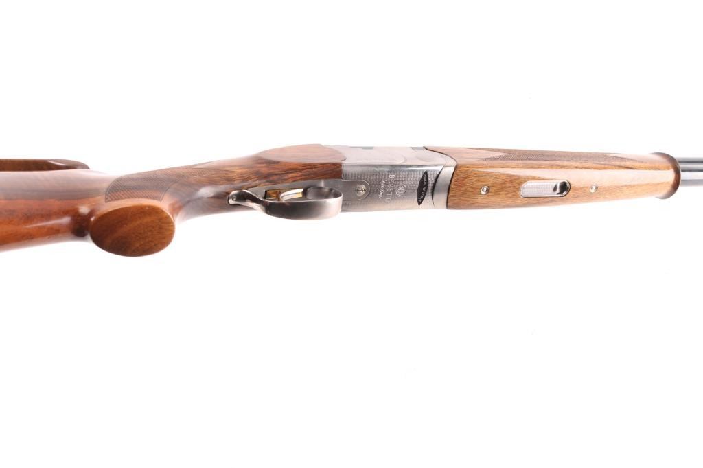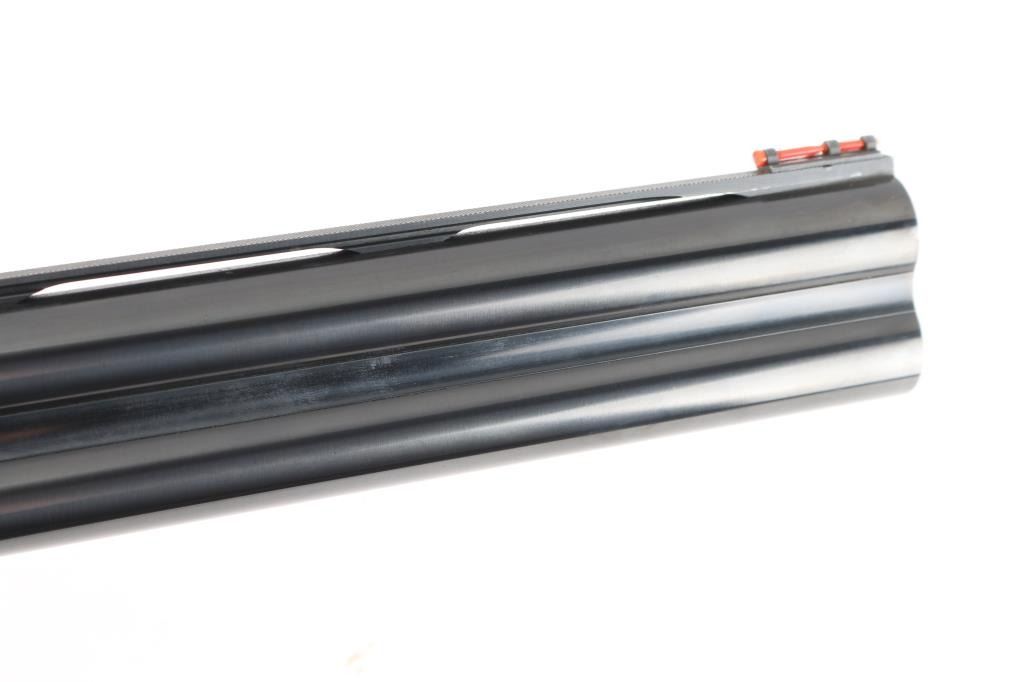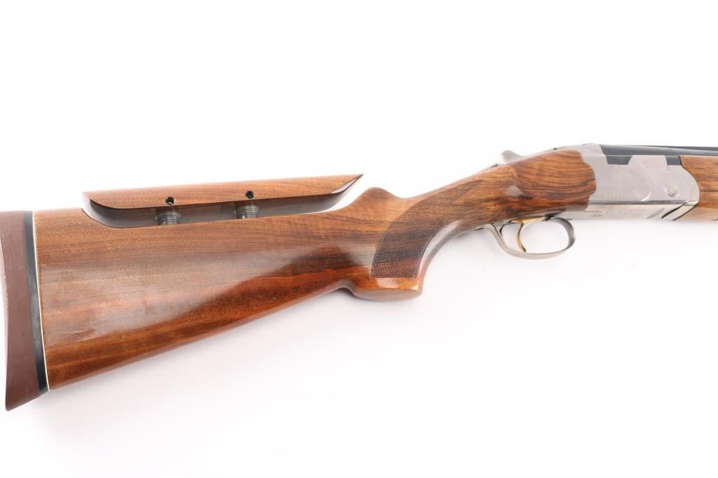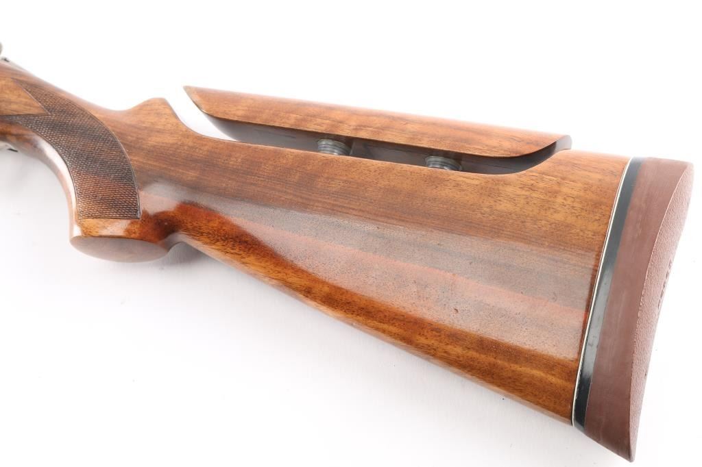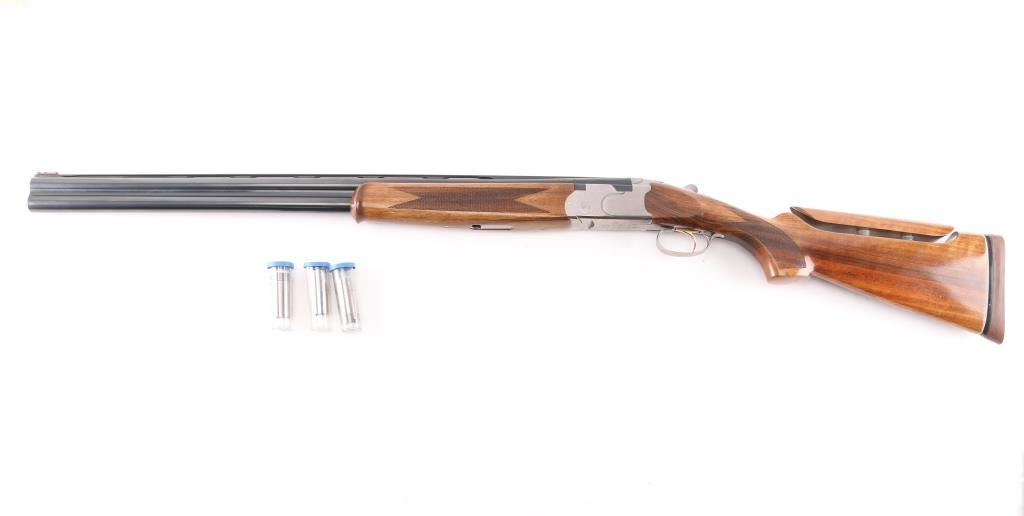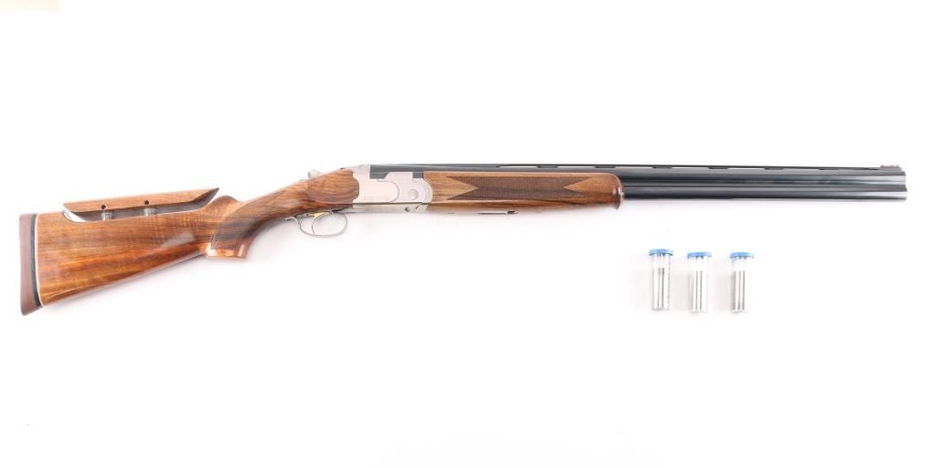 Fine Italian made over/under double barrel shotgun chambered for 2 3/4" 12 gauge shells, circa 1976. Features blued 28" barrels with ventilated sighting rib, red fiber optic sight, automatic ejectors, gold single selective trigger, Dura-Jewel finished receiver, sliding tang safety/barrel selector, checkered high gloss walnut forend and pistol grip shoulder stock with solid Hogue recoil pad and height adjustable comb. No chokes installed but comes with Full, IC and Modified chokes. LOP is 15".. Shotgun retains about 98% of metal finishes, shows no visible wear. Action is tight, bores are excellent/bright and wood stocks are fine with only a couple minor imperfections. NRA Condition is Excellent, Like New. Modern Firearm.