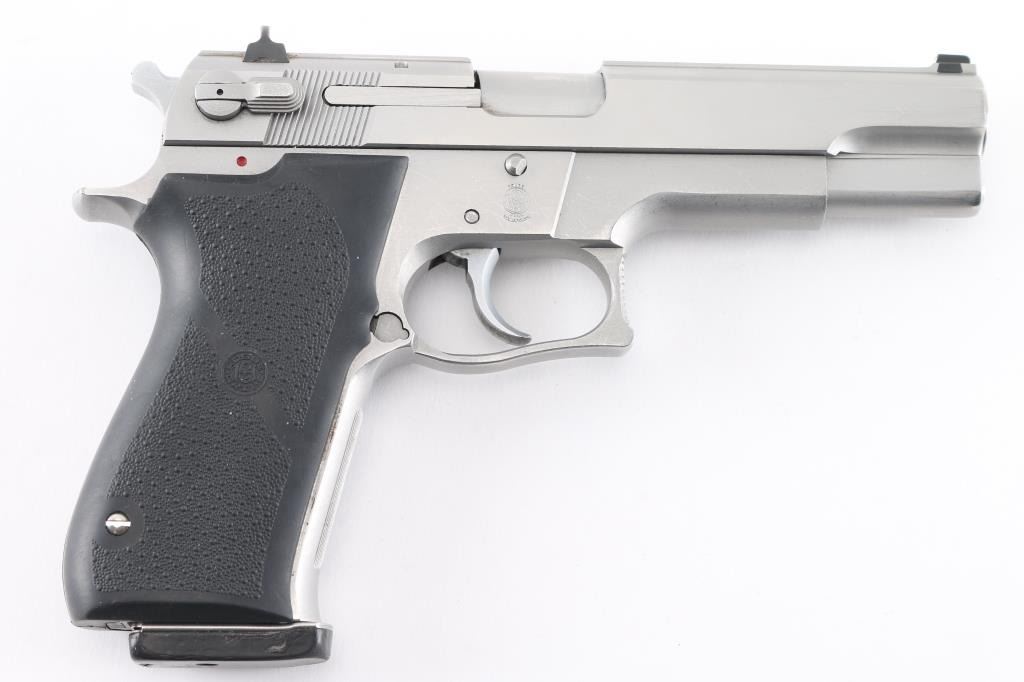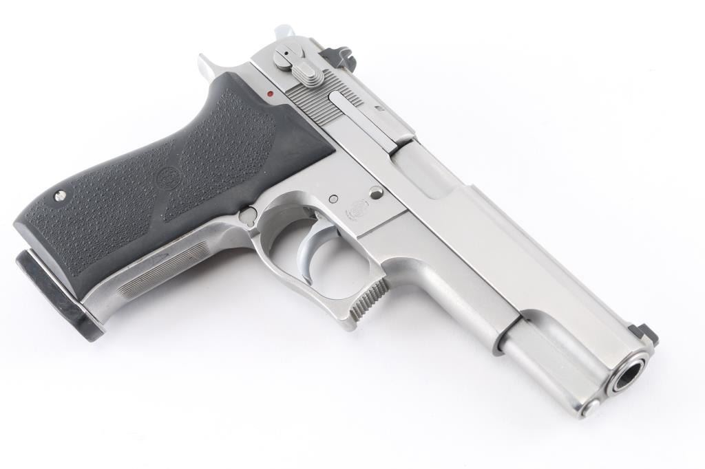Double/single action semiautomatic pistol. Features stainless steel construction, black rubber pebbled Hogue grips, three dot sights in dovetails, ambidextrous slide mounted safety/decocker, 5" barrel. Rear sight is rounded at outer corners to prevent snagging. Square trigger guard. Serrated fore strap. Bore is in excellent condition. Metal surfaces have many minor scratches Includes Two spare 8 rd magazines, one with extended floor plate. (3) total.Condition is NRA Very Good,. Modern Firearm.