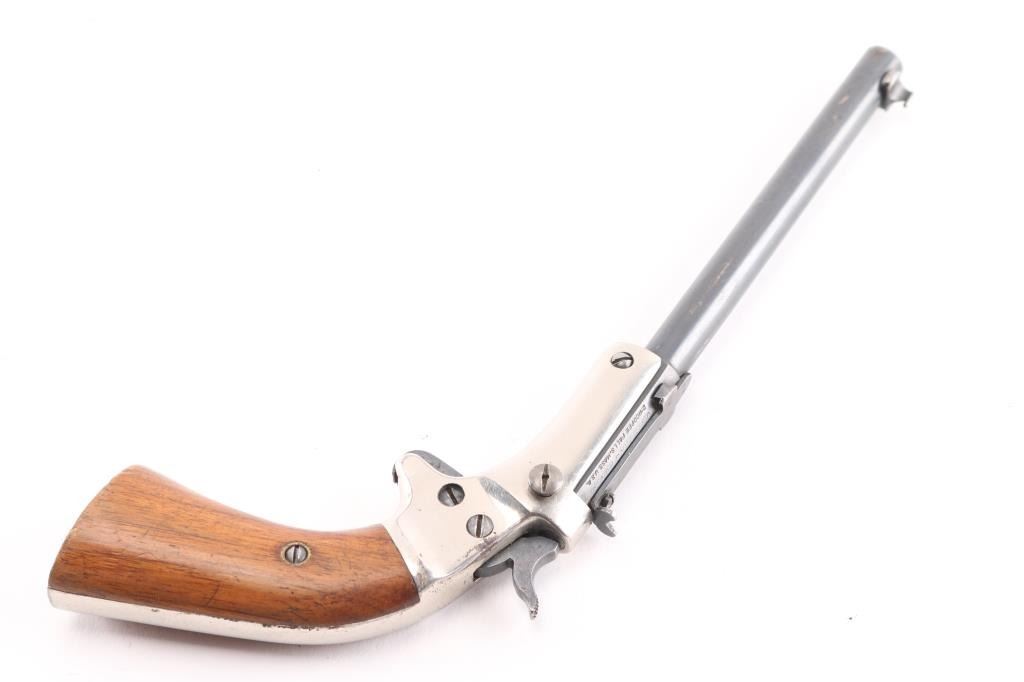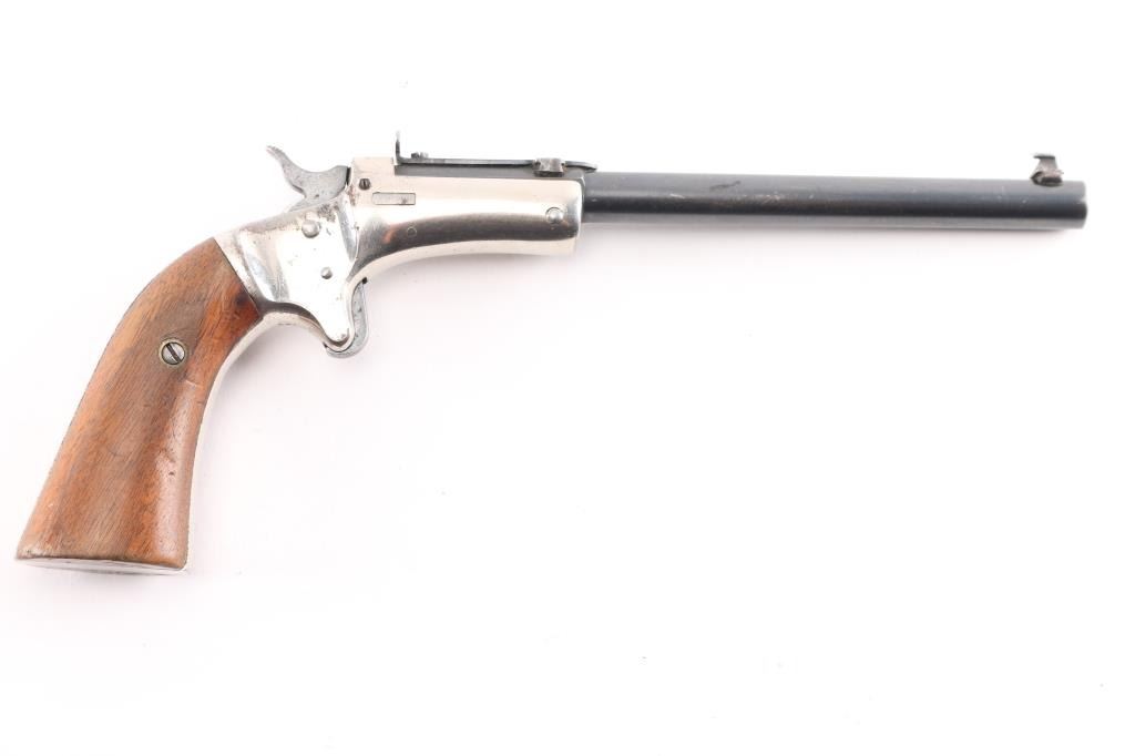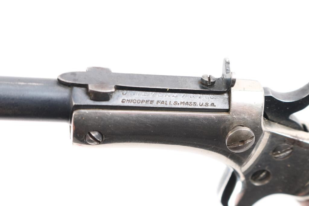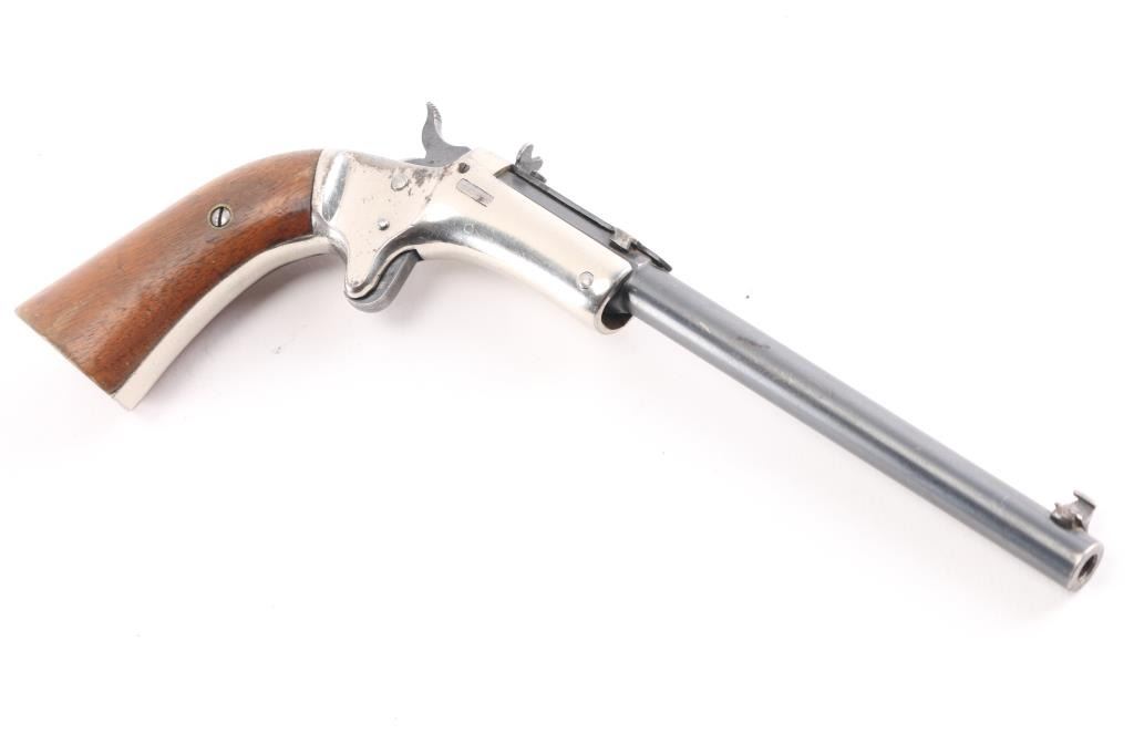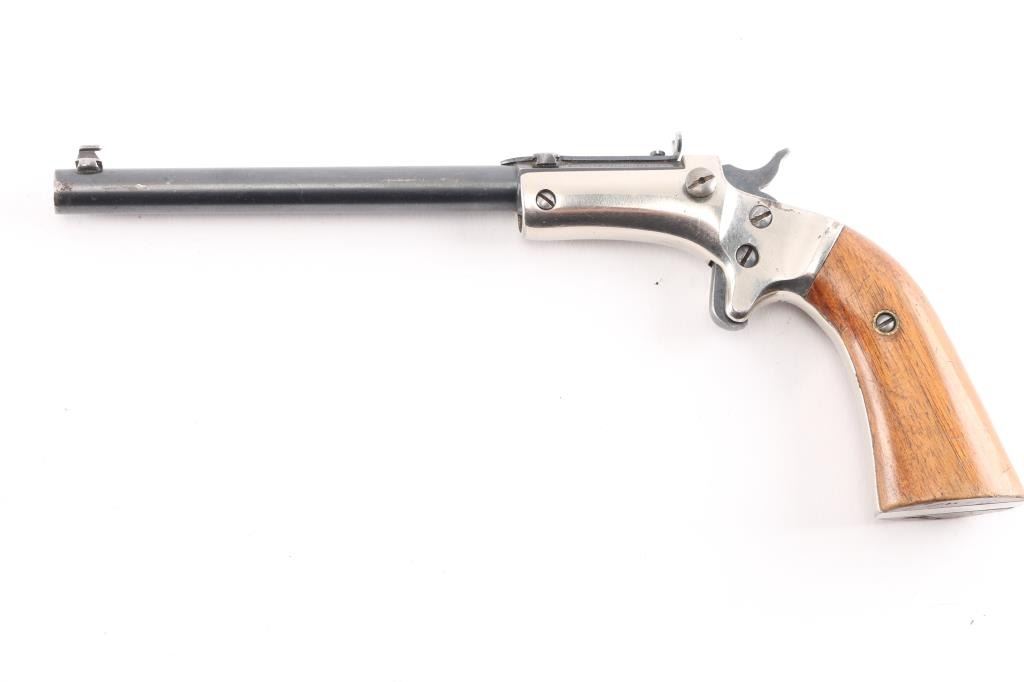 Single-Shot. "Tip-Up" 1896-1916. Nickel plated brass frame. Smooth walnut grips. 6" octagonal/round blued barrel with hooded post/bead front , and adjustable notch rear sight. J. Stevens markings on left barrel flat. Bore is very good/bright. Barrel locks up tight, hammer action is sound. Grips are very good. Blued barrel is about 90% with light scratches/muzzle wear, and nickel coated brass frame is about 94% with a couple of very small areas of light pin-prick pitting. Matching serial numbers on barrel and grip frame.NRA Condition-Good. C&R firearm.