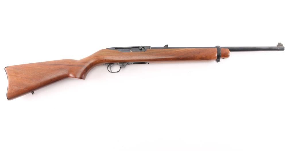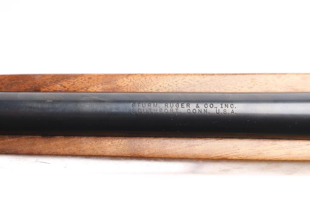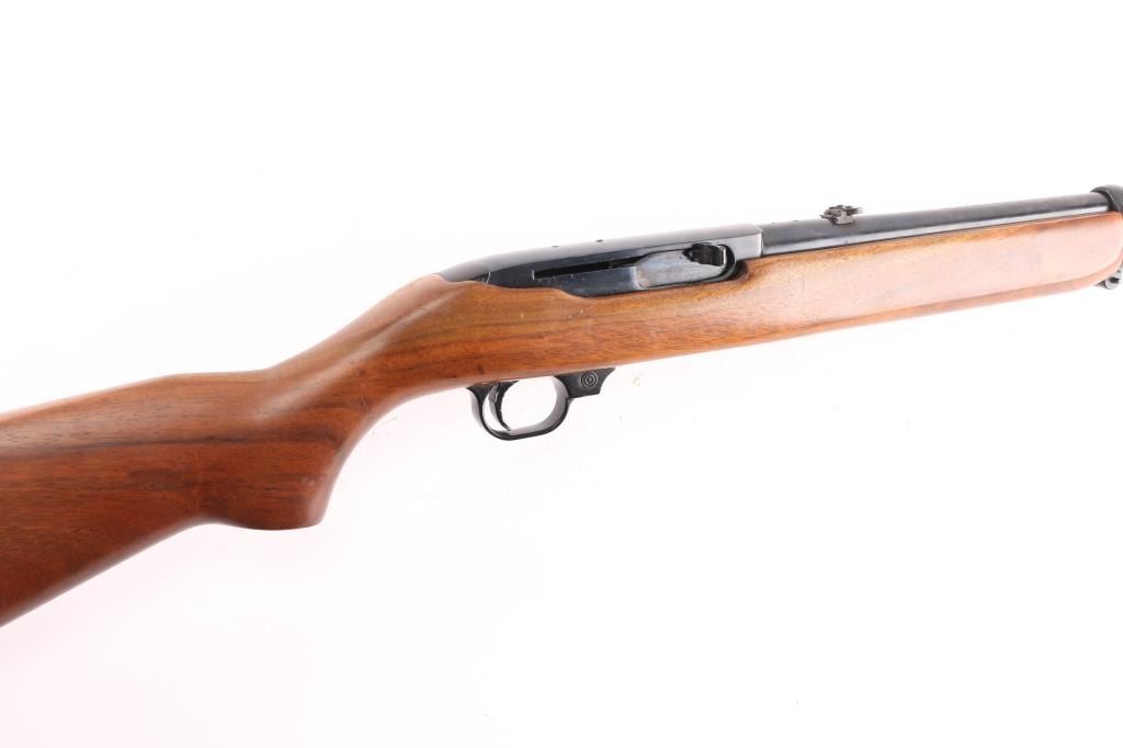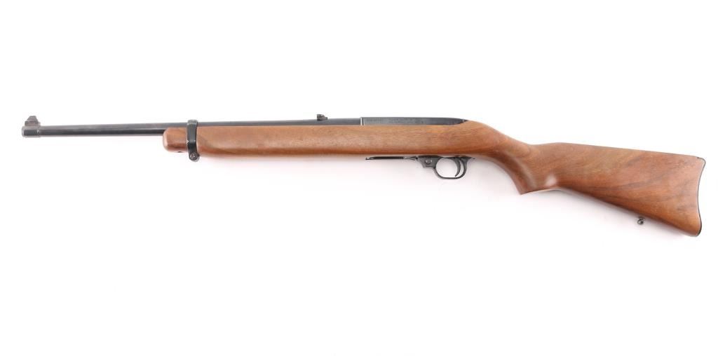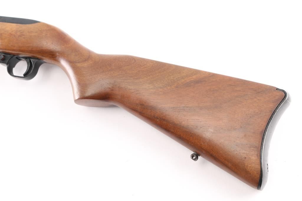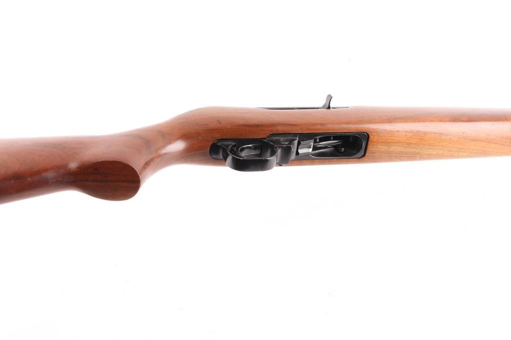 Semiautomatic carbine chambered in 44 Magnum, manufactured 1976. Features approx 18.5 inch barrel, push button safety, blade/brass bead front sight, adjustable flip/notch rear sight , rear sling stud, missing the front, fixed tube magazine that loads through the bottom of action. Receiver drilled/tapped for optics. Bore is excellent/bright action is smooth, wood stock is very good/sound with some minor scratches. Blue is about 90% with edge/handling wear, some loss on the steel buttplate and some friction wear on the bolt carrier.NRA Condition-Near Very Good. Modern Firearm.