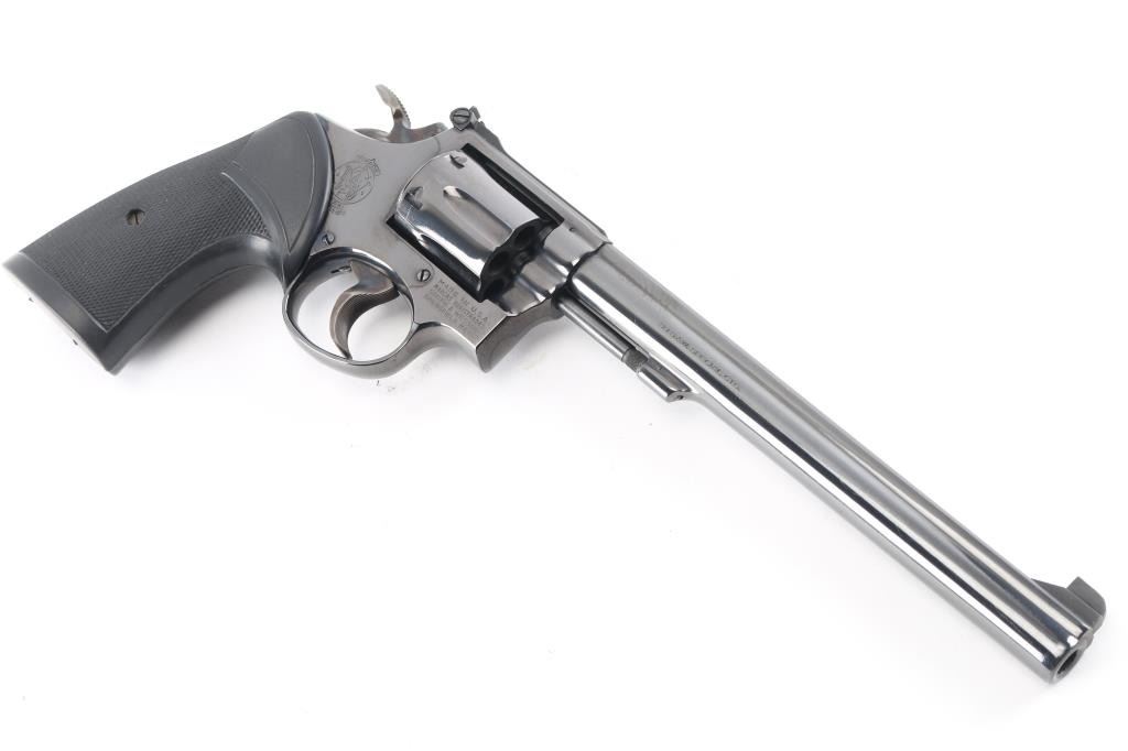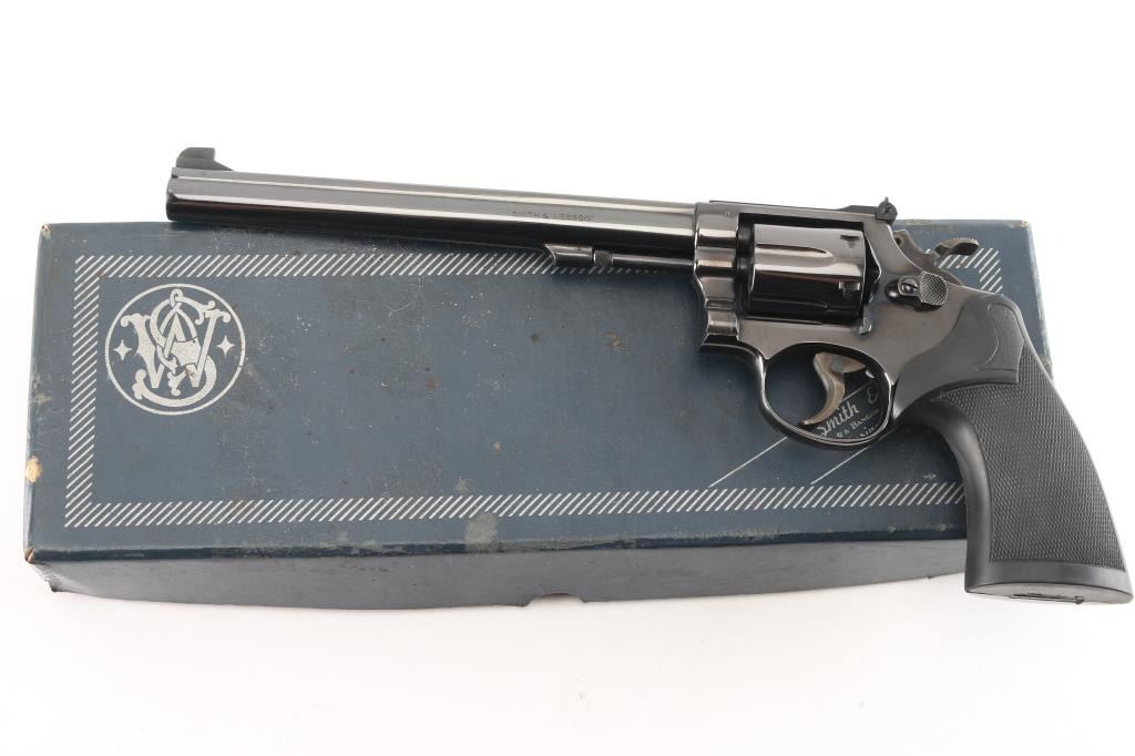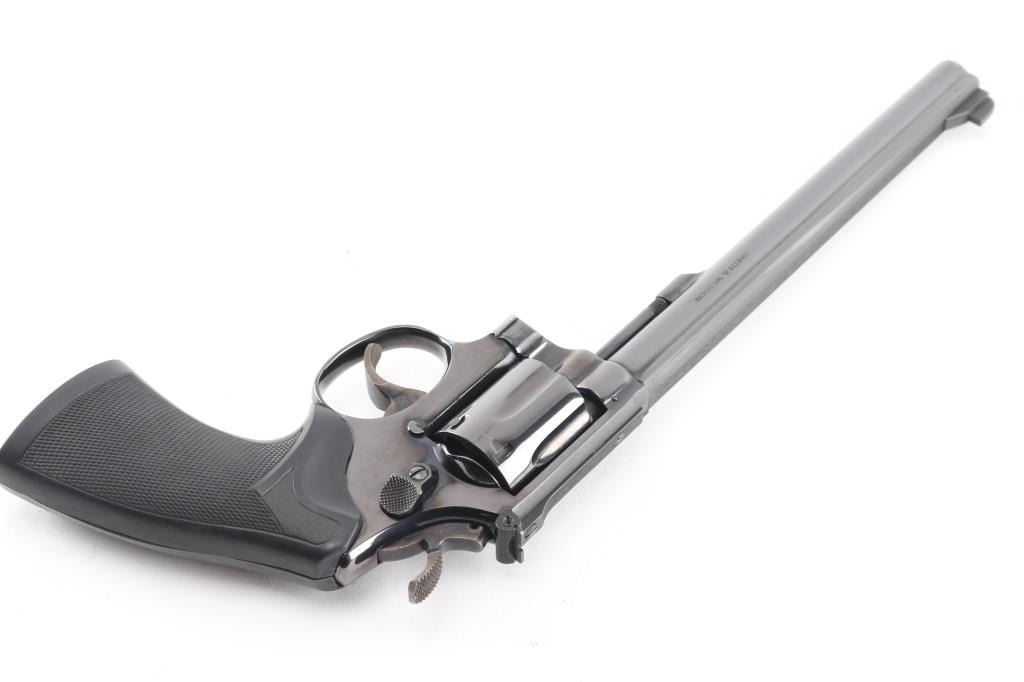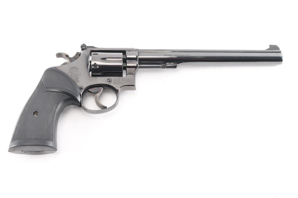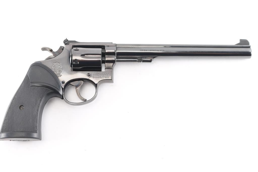 The K-38 Target Masterpiece Medium frame double action revolver chambered in .38 Special, manufactured circa 1972. Features a blued finish, pinned 8 1/2" barrel with serrated sighting rib, raised patridge front sight, adjustable notch rear sight, fluted six-shot cylinder, non-shrouded ejector rod, serrated .500" trigger, .500" checkered spur target hammer, three screw square butt K target frame with ten groove back strap, and two-piece Pachmyer checkered black rubber grips.. Bore is pristine. Retains 98% finish with very minor scratches/rubs. Grips are excellent condition. Action is smooth with tight lock-up. Comes in the original blue cardboard factory with matching label with manual.NRA Condition-Excellent. C&R Firearm.