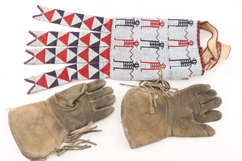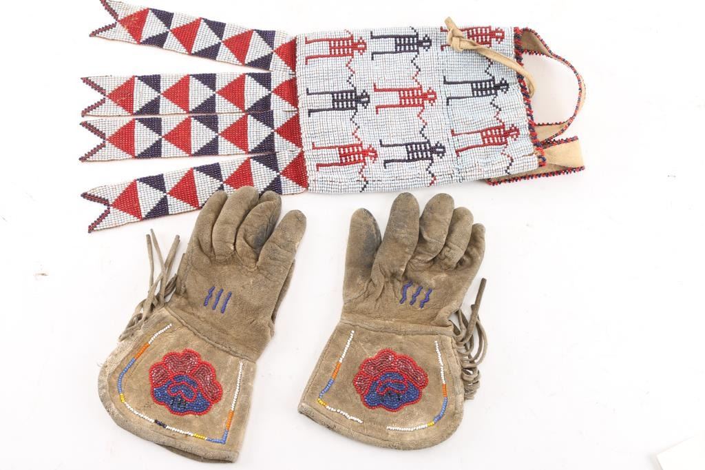 (1) Childrens beaded gauntlets w/ beaded rose; (1) Beaded bag w/red, white, and blue beads.