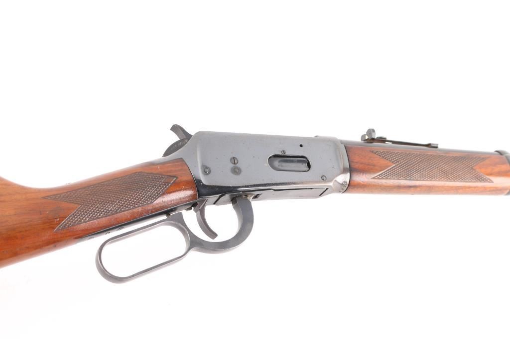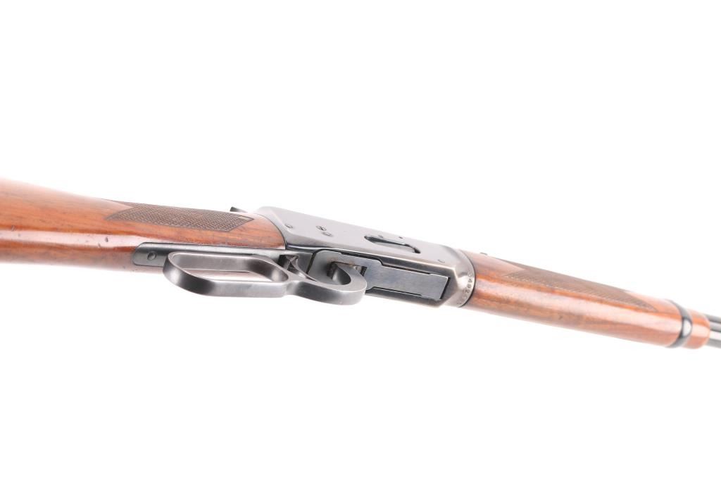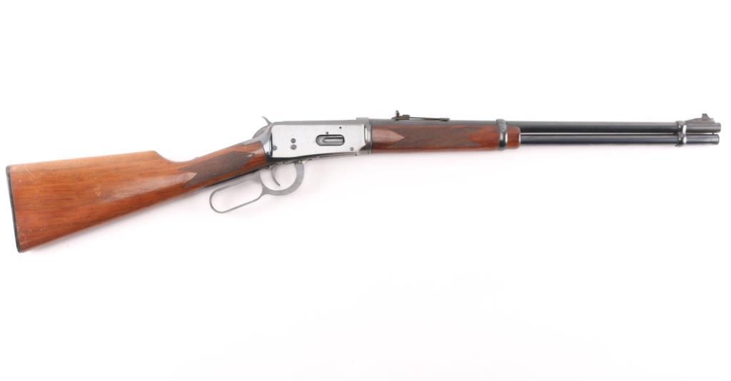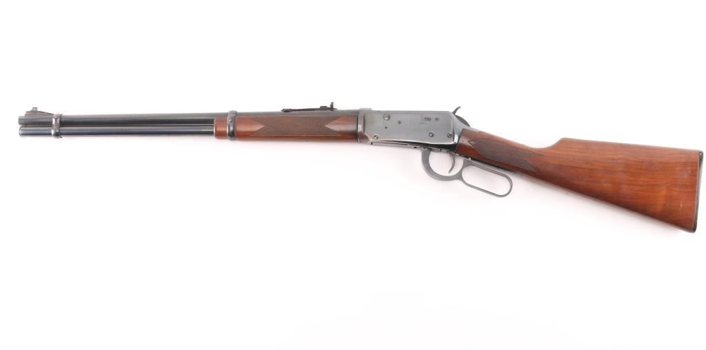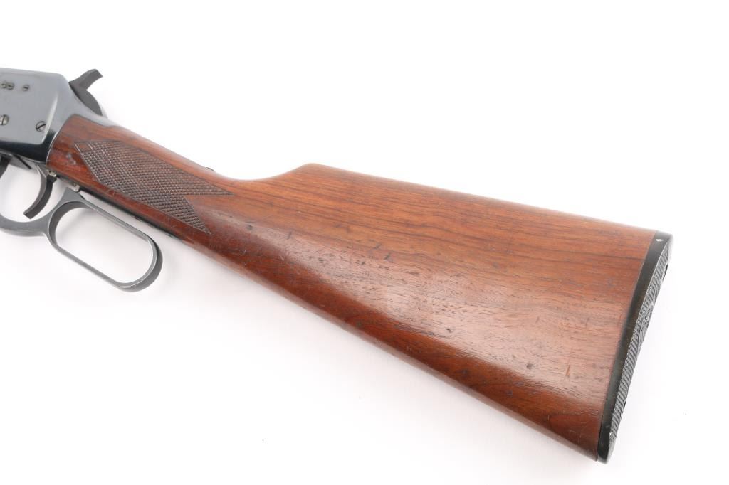 Eastern Carbine. Vintage lever action repeating rifle chambered in .30-30 Winchester. Manufactured 1970. Features a blued finish, 20" barrel, full-length tube magazine, ramped, blade/bead front sight , adjustable rear buckhorn sight. Smooth trigger, serrated hammer spur, steel receiver,walnut forend and straight wrist shoulder stock with factory black plastic buttplate, checkered wrist and forearm. Left receiver drilled/tapped for sights/optics, Bore is fair, some wear to the rifling, scattered light pitting. Retains about 85% blue finish with handling wear mostly on the bottom of receiver and tangs, scratches/edge wear. Wood is very good/sound with a couple of minor scratches. Markings are crisp. Action is smooth. NRA Condition-Good. C&R Firearm.