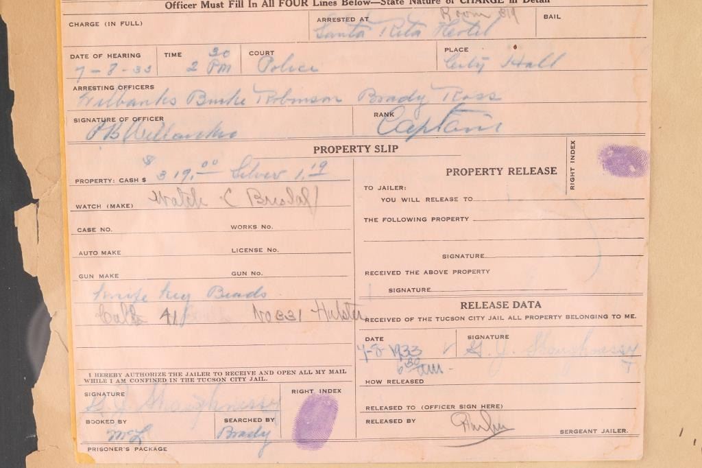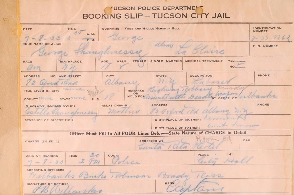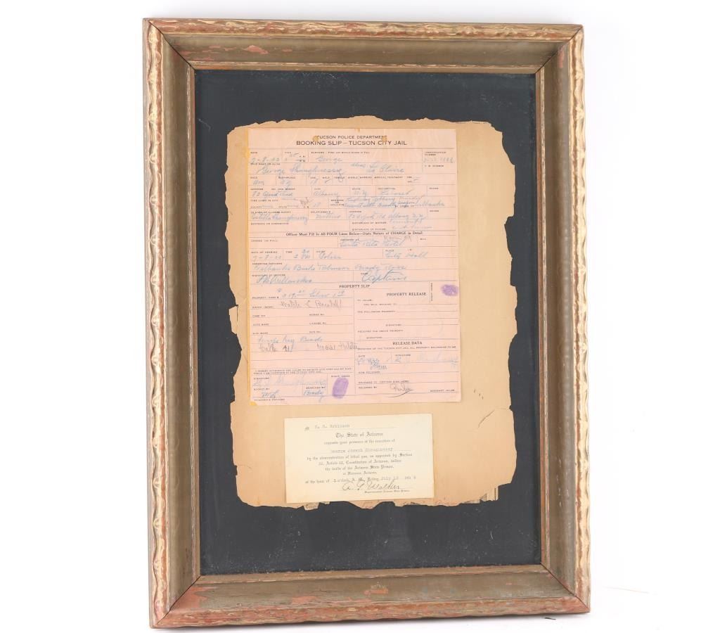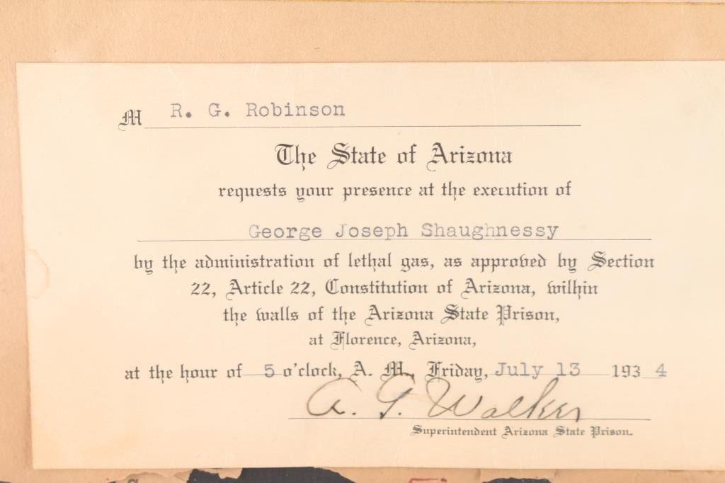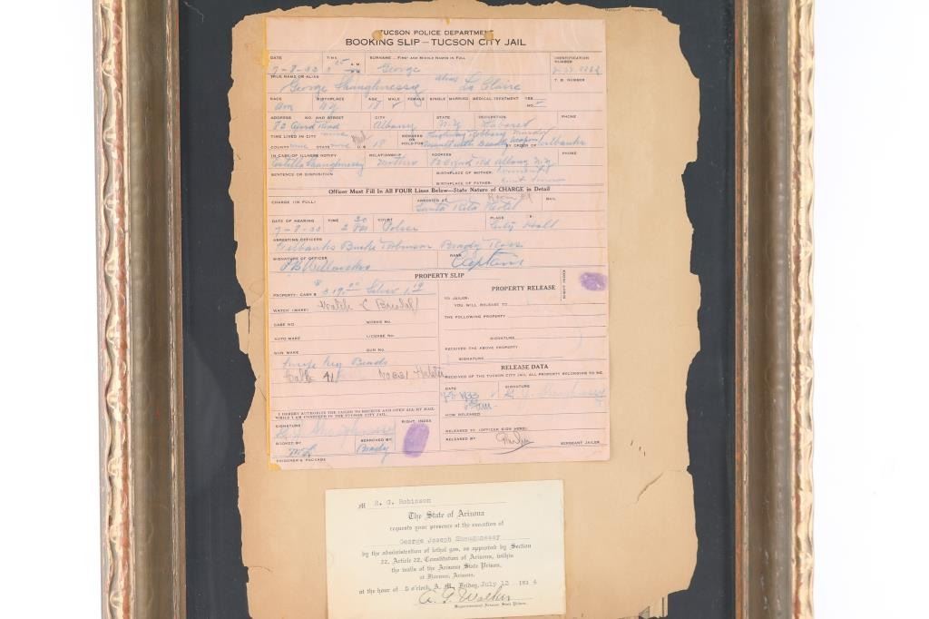 2 framed documents, Tucson Booking Slip for George Joesph Shaughnessy, dated July 8, 1933. Arrested for Highway Robbery and murder of Lon Blankenship, Tucson automobile dealer. On the outskirts of Nogales, Blankenship picked up Shaugnessy as a hitchhiker enroute to Tucson. About nine miles out of Tucson, Shaughnessy drew his stolen .41 army gun and ordered Blankenship to stick up his hands. The latter reached over and grasped the revolver instead of sticking up his hands. Shaughnessy fired two shots at him, inflicting an eventual mortal wound. After dumping off Blankenship in the desert to die, enroute to Tucson, Shaugnessy lost control of the car and crashed near a service station. He was picked up by a driver and dropped off at a Tucson hotel, arrested the following morning and convicted and sentenced to die in the gas chamber. The lot includes an invitation to his execution by lethal gas to be carried out at 5 p.m. on July 13, 1934, at the Arizona State Prison in Florence. A fascinating piece of Arizona crime history. Measures 20"x14".