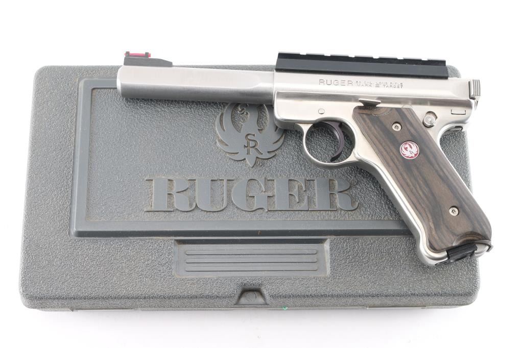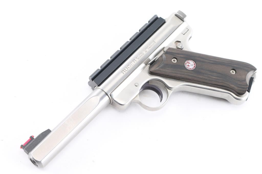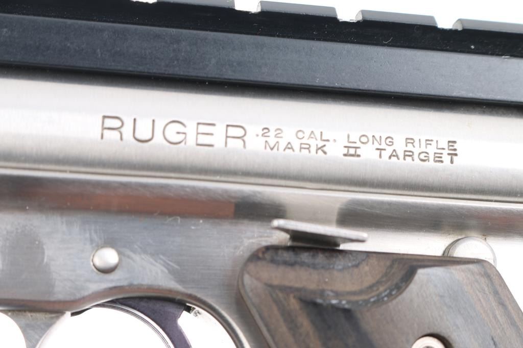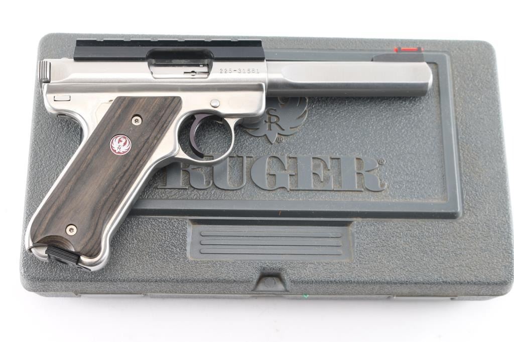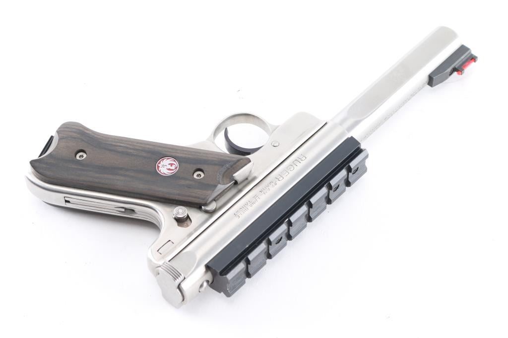 Target model semiautomatic rimfire pistol features stainless steel construction, 5 1/2" slab sided bull barrel with a red Hi-Viz front sight and removed adjustable square notch rear sight for installed 4 1/2" black scope rail, blued serrated curved trigger, manual safety, bolt release lever, heel magazine release, laminated wood grips with red & silver Ruger medallions. Bore is bright with strong rifling. Retains approx. 98% finish with some small scratches on barrel. Action is smooth. Includes original factory gray plastic case, one magazine, original rear sight, multiple Hi-Viz inserts, rubber back strap and manual. Condition is NRA Excellent.***Modern Firearm***