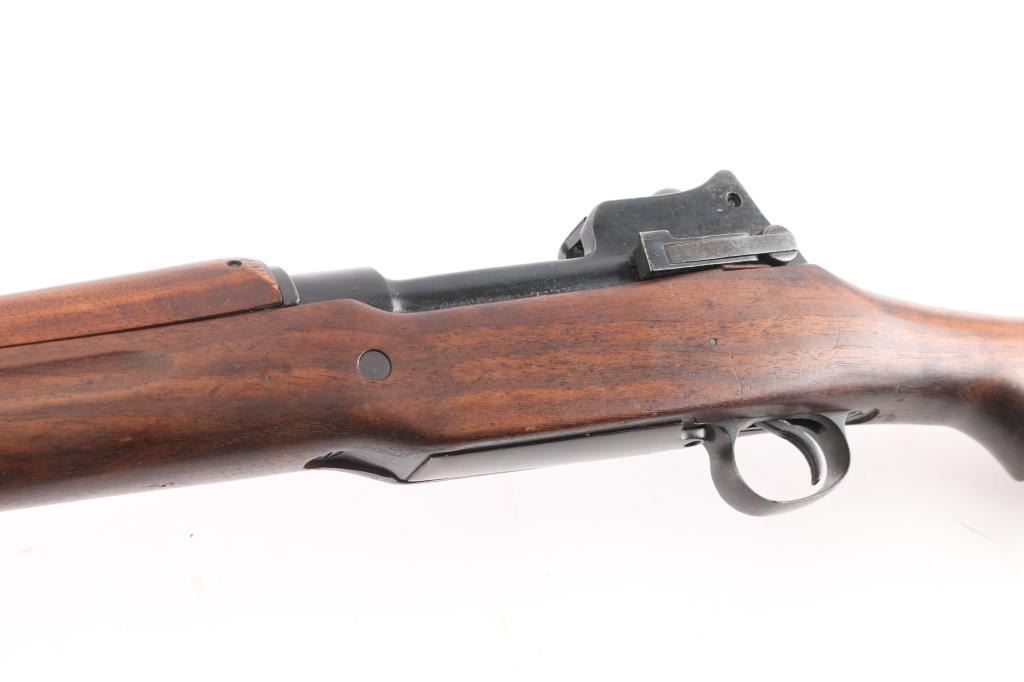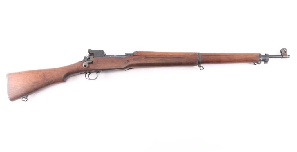 US military Mauser pattern bolt action rifle manufactured for use in WWI by the Eddystone division of Remington. Often referred to as "Enfield", due to British Enfield type rifling. Reblued, parkerized bolt, "dog leg" bolt handle. Features 26" barrel, blade front and peep rear ladder sights both protected by steel guards, manual safety, 6 round magazine, wood handguard & stock with grasping grooves, trap door in butt, sling swivels, stacking swivel. Bore is good, strong rifling, lightly frosted. Retains 94% reblue with minor scuffs, handling wear on the bottom metal, the chamber markings are feint. Wood is excellent. Metal fit to wood is very good. "3W" stamped behind the triggerguard. No other Cartouches observed "E" marked barrel dated "12-18".NRA Condition-Near very Good. C&R firearm.