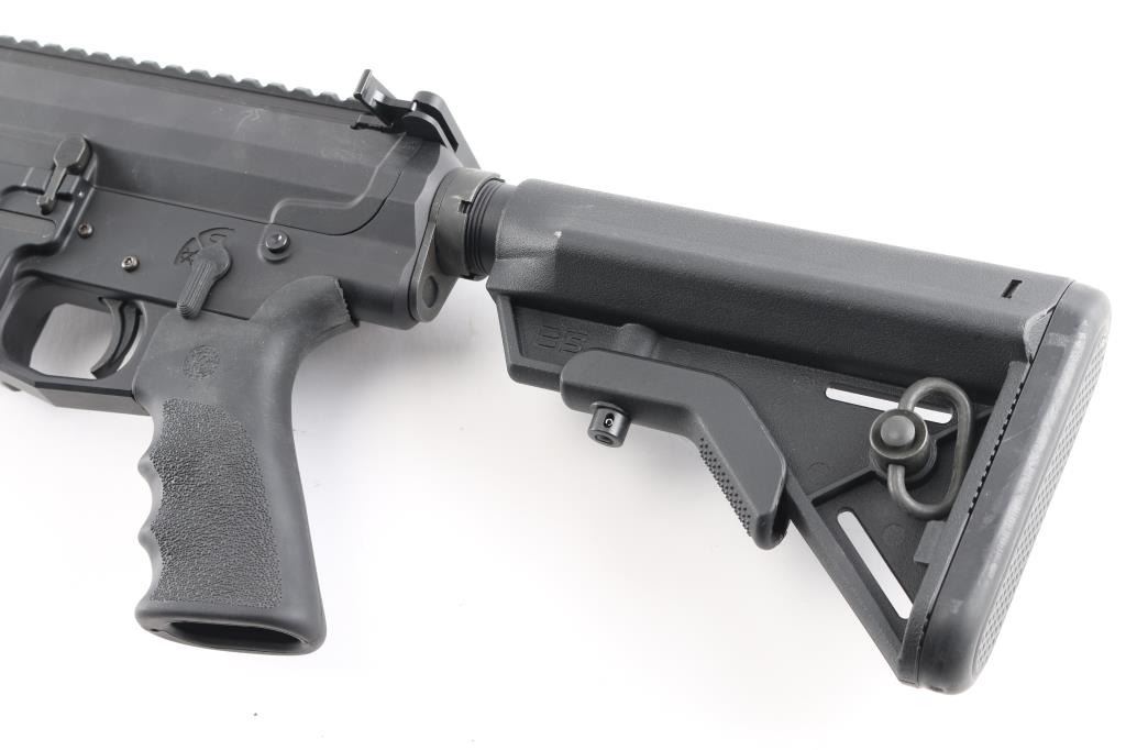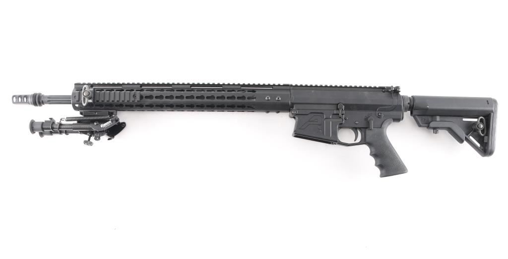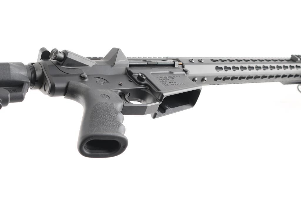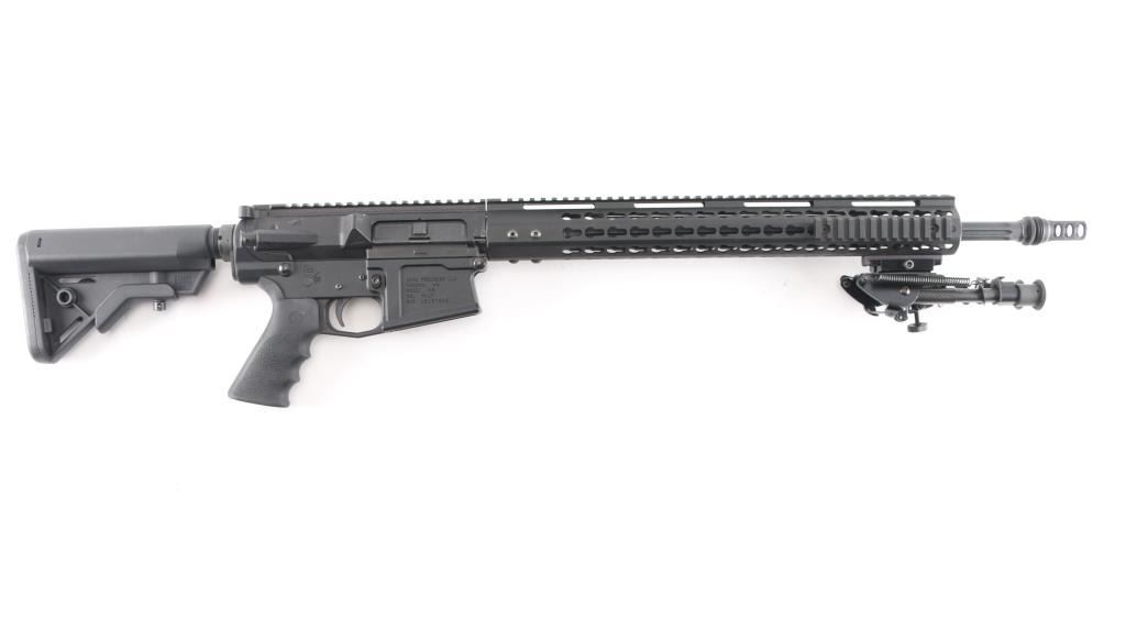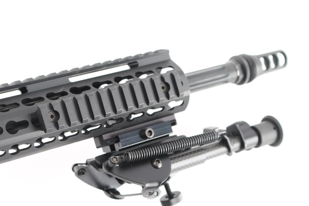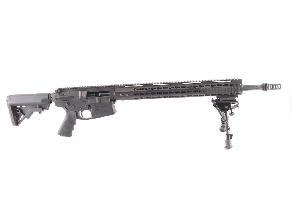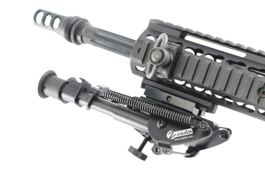 Quality, direct impingement operated semi-automatic long range rifle chambered in .308 Winchester. Features a Faxon Match Series 20" heavy fluted 416-R stainless barrel with black QPQ nitride finish, 5R rifling & 1-10 twist, SilencerCo ASR muzzle brake/suppressor mount, rifle-length gas system, 17” free-floating Keymod aluminum handguard with picatinny rail segments & continuous top rail, Daniel Defense QD mount, Zeadio carbon fiber 6”-9” bipod, Aero T-marked flat-top upper receiver with forward assist, shell deflector & dust cover, extended latch charging handle, black nitride finish BCG, CMC drop-in single stage trigger, manual two-position safety, Hogue rubber overmolded pistol grip and B5 Systems Bravo telescoping shoulder stock. Rifle retains approximately 98% of its black finishes showing minor scratches & scuffs. The action is sound, the bore is excellent, and the stock is excellent.Condition is NRA Excellent.***Modern Firearm***
