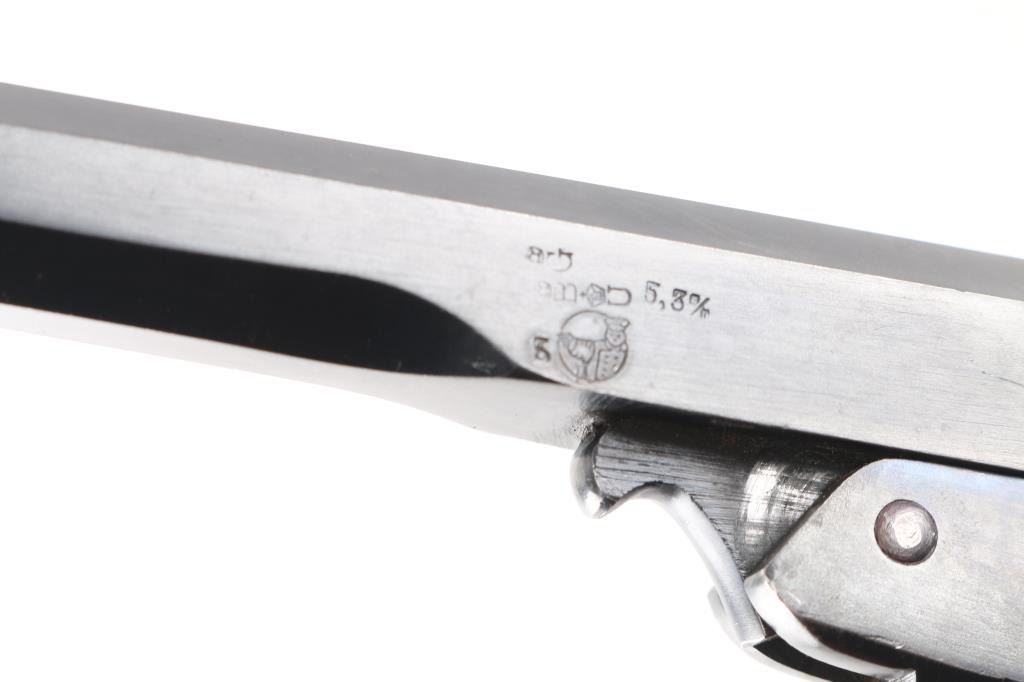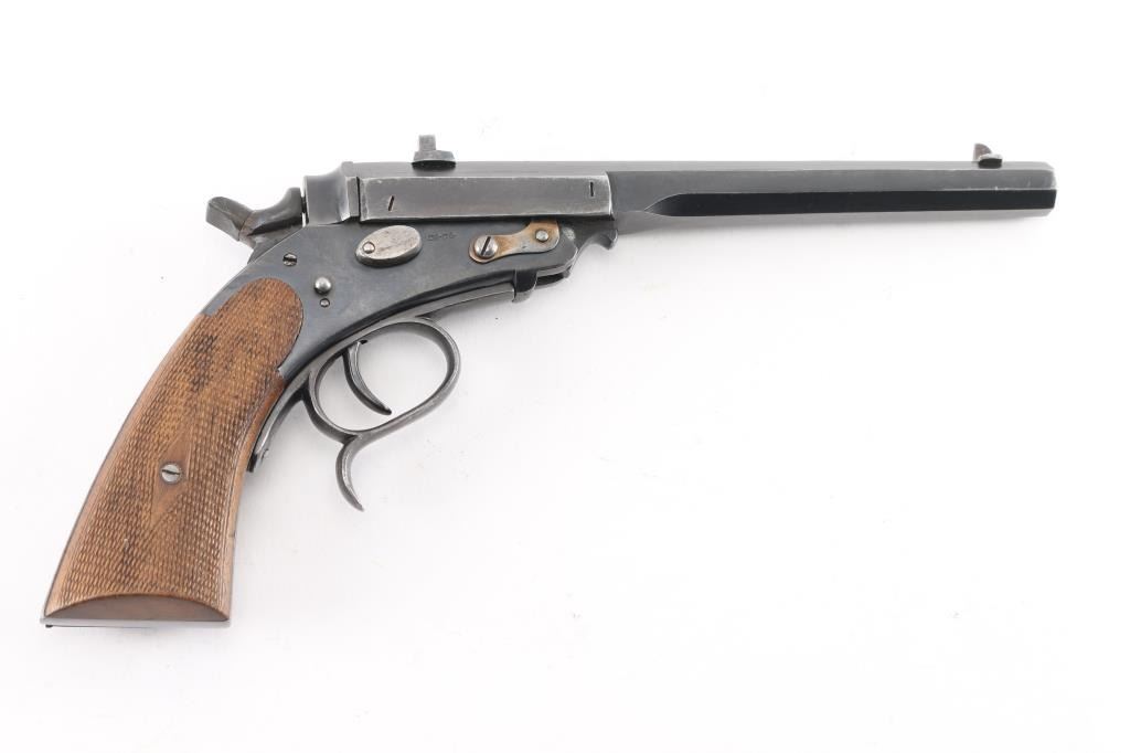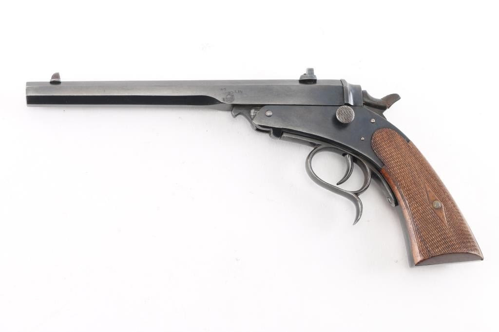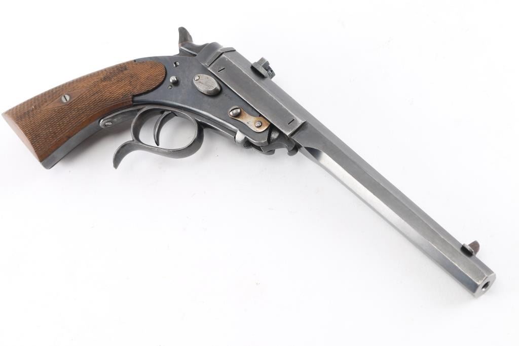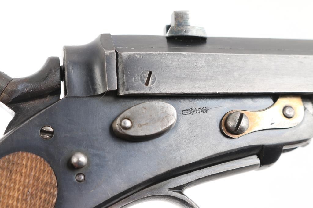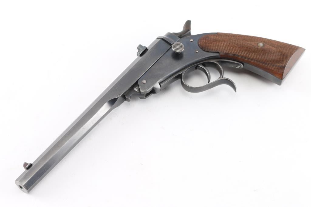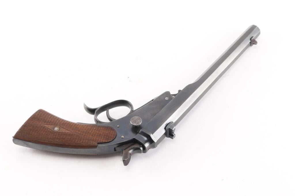 German made tip-up single shot parlor pistol chambered for .22 Cal. Cartridges, circa 1920's. Scharfenberg style pistol. Blue finish. Features a 8” octagonal barrel, dovetailed blade front sight, dovetailed rear sight with 'u' notch, rounded straight bow trigger, finger rest trigger guard, hammer with grooved spur and two-piece finely checkered walnut grips. Push button barrel release on left frame. The frame is marked with [crown]/"U", & [crown]/"B". The barrel is proofed 5,3 m/m, [crown]/"B", [crown]/"G", [crown]/"U", & "5"and "Shooting Man" in circle trademark. Retailer marked “AKAH” for Albrecht Kind GMBH, Germany’s oldest sporting goods retailer since 1853. Pistol retains approximately 90% of its original finish showing edge wear, minor scratches and handling wear to the triggerguard. Action is sound, barrel locks-up tight and the bore is very good/bright, slight frosting in the grooves and the wood grips are excellent.