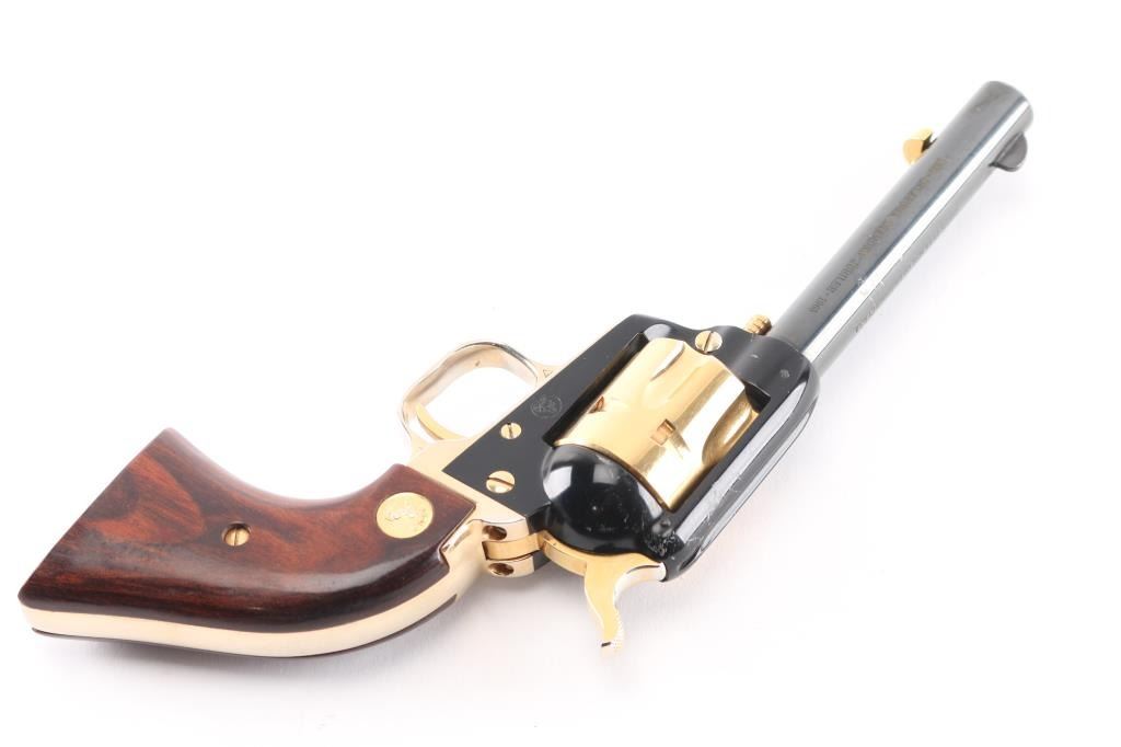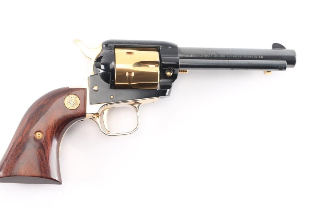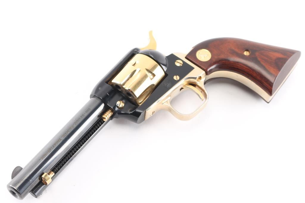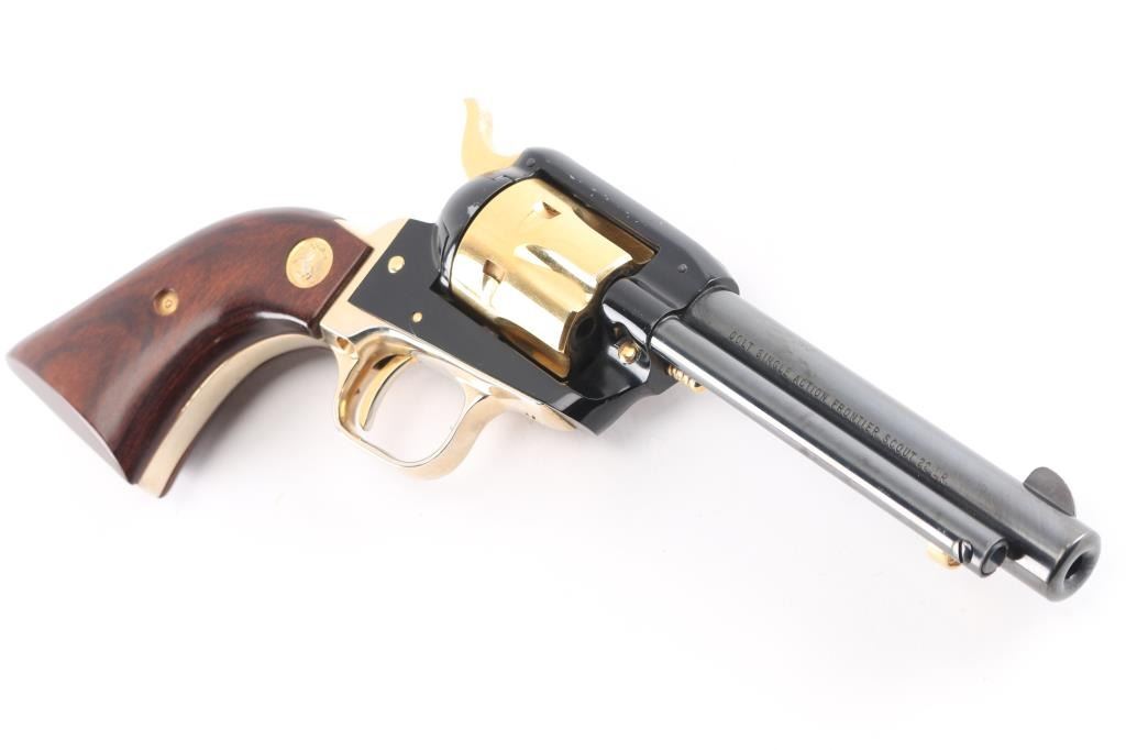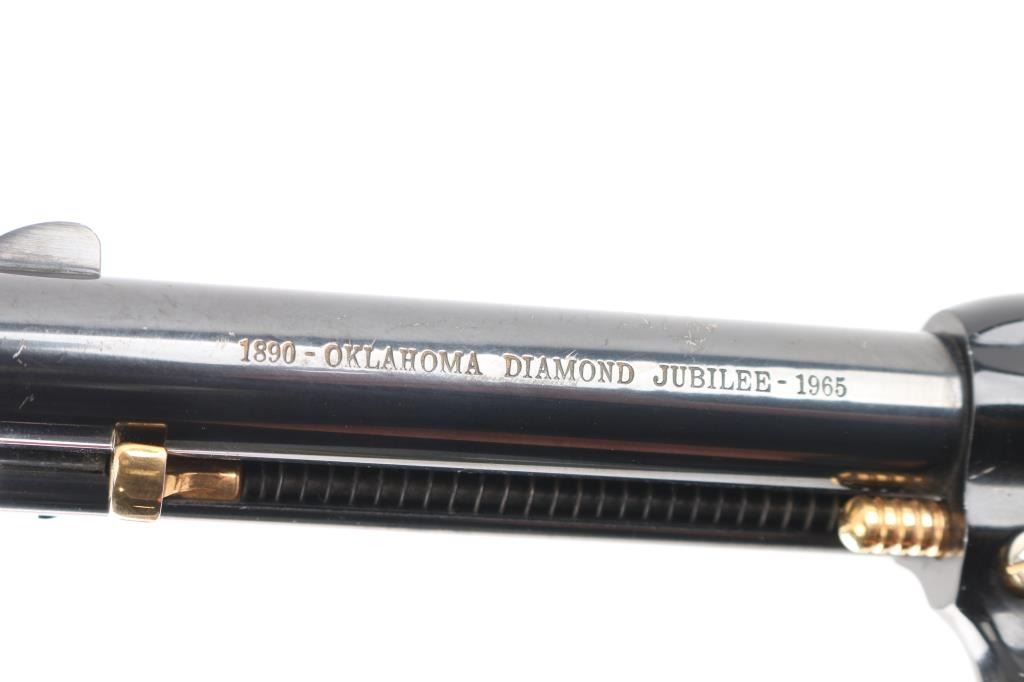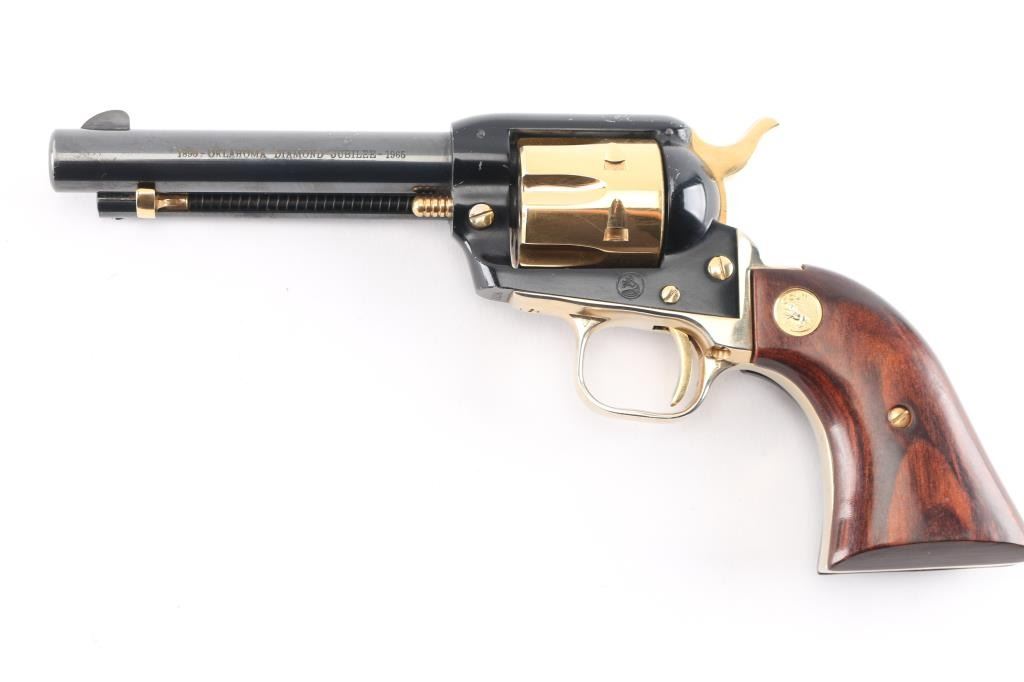 Colt Frontier Scout Oklahoma Diamond Jubilee Commemorative Single Action Revolver. A scarce model, only 1343 made. 4 5/8 inch barrel with a bright, excellent bore. This is the 1890-1965 Oklahoma Diamond Jubilee Frontier Scout 22 Single Action Army revolver manufactured by Colt in 1965. The commemorative is marked “1890 – Oklahoma Diamond Jubilee – 1965” on the barrel featuring a high polished blue barrel and frame with contrasting gold plated cylinder, trigger guard, screws, ejector lug, cylinder pin and hammer. The metal surfaces retain about 90% original finish with scratches on the barrel and the frame, the loading gate has a small rub. The grips which feature gold rampant Colt medallions are excellent. Action is crisp/smooth and the bore excellent/bright.NRA Condition-Very Good. C&R Firearm.