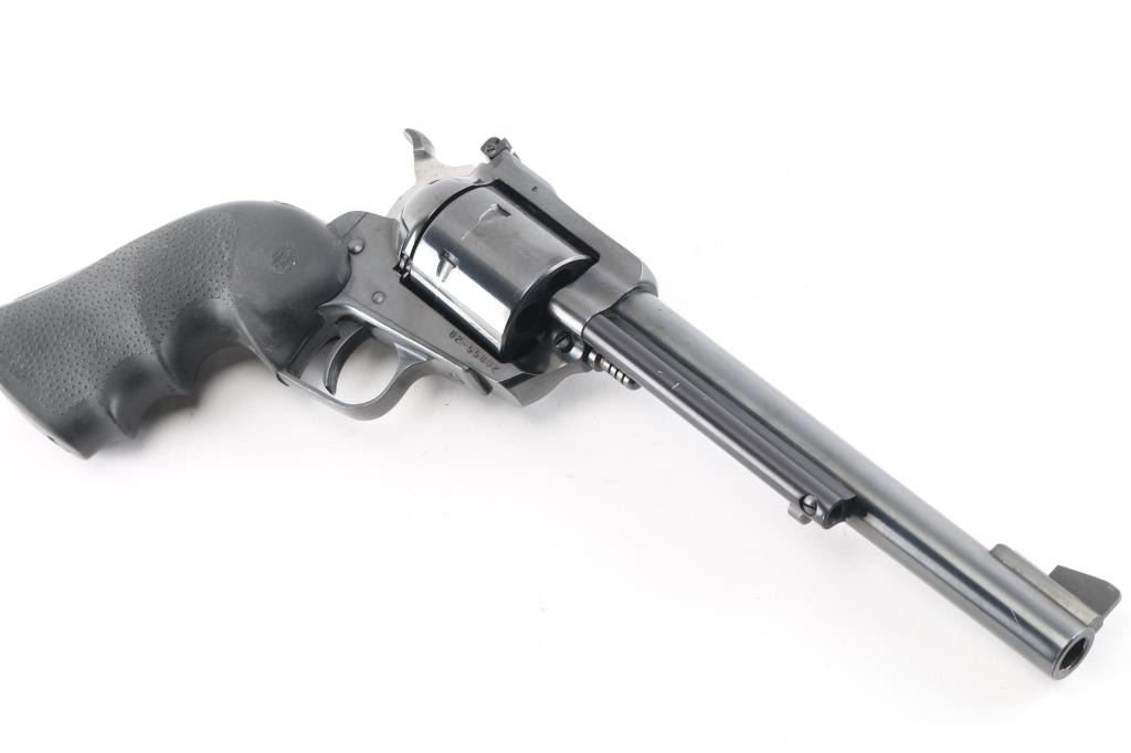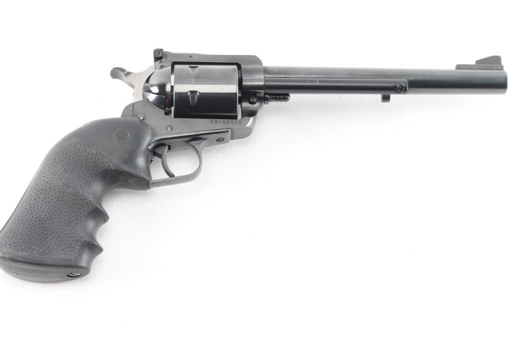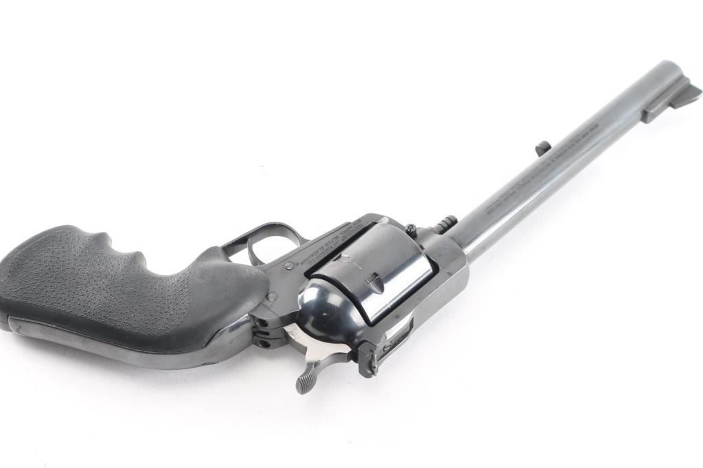 Sn:82-55802. Single-action revolver manufactured circa 1978. Features blued finish, 7 1/2" barrel, serrated ramp front sight, pinned and adjustable square notch rear sight, non-fluted 6 shot cylinder, serrated wide hammer spur and serrated trigger. Bore is bright with strong rifling. Textured black rubber finger groove Hogue Monogrip. Bore is bright with strong rifling. Retains approx. 98% finish with one scratch on the extractor rod shroud, slight edge wear and drag line on cylinder. Action is smooth with strong rifling. Grip is good with some wear. NRA Condition is Very Good to excellent. ***Modern Firearm***