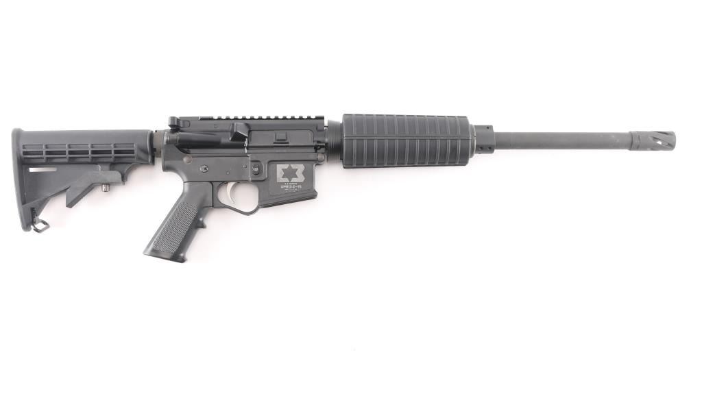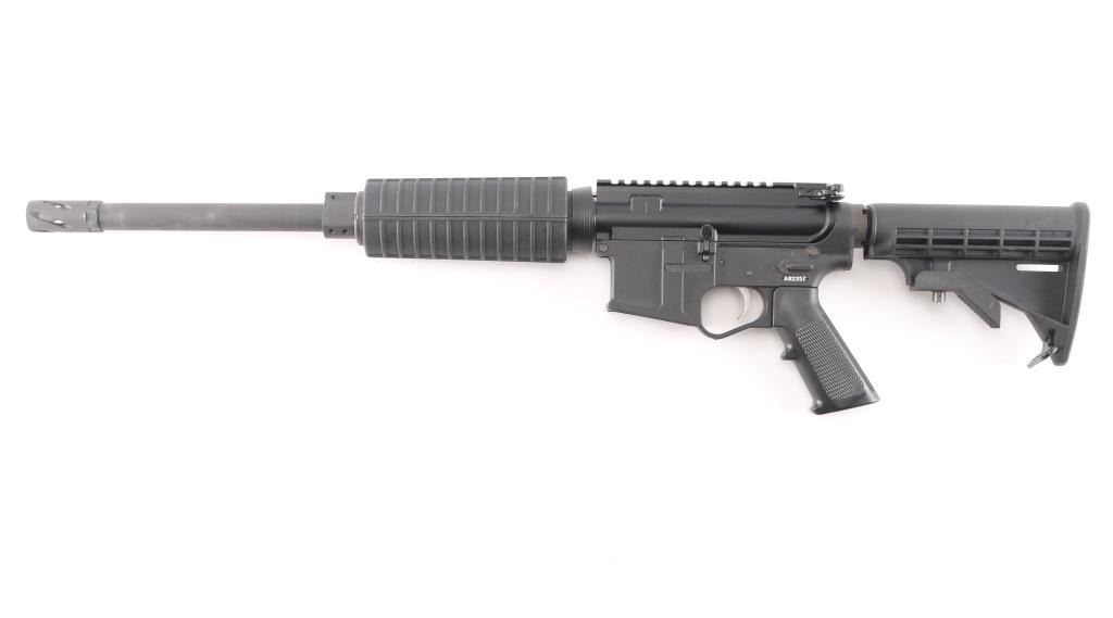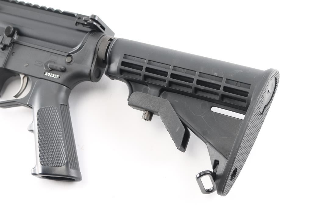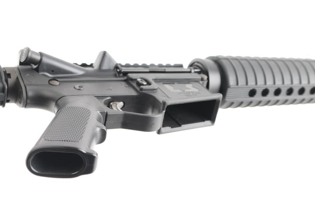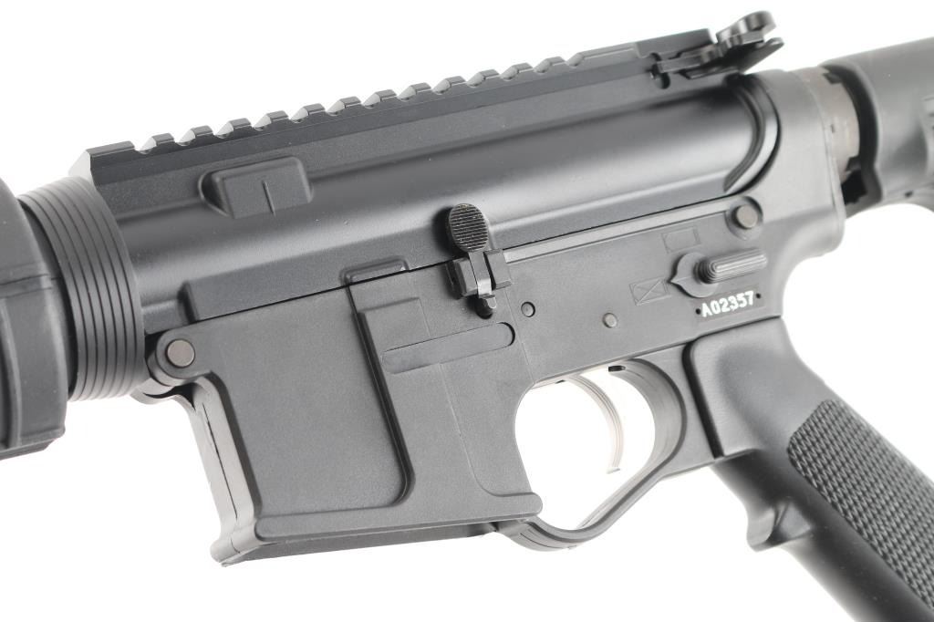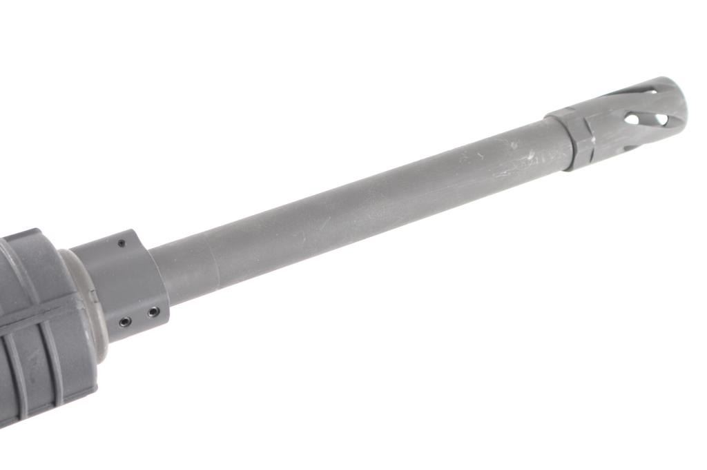 Semiautomatic rifle chambered in .458 Socom. Features a parkerized finished 16" 1:14 twist barrel, black plastic furniture, five position collapsing stock with sling swivel, round carbine hand guards, spiral fluted flash suppressor, no sights, upper receiver with forward assist, spring loaded ejection port cover and forward assist, manual safety, lower receiver is polymer. Optics ready upper receiver. Bore is very good condition. Overall external appearance is very good with few blemishes, retains 99% finish. Polymer is excellent. No magazine. Like new condition.NRA Condition-Excellent. Modern Firearm.