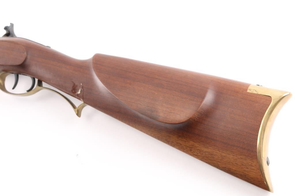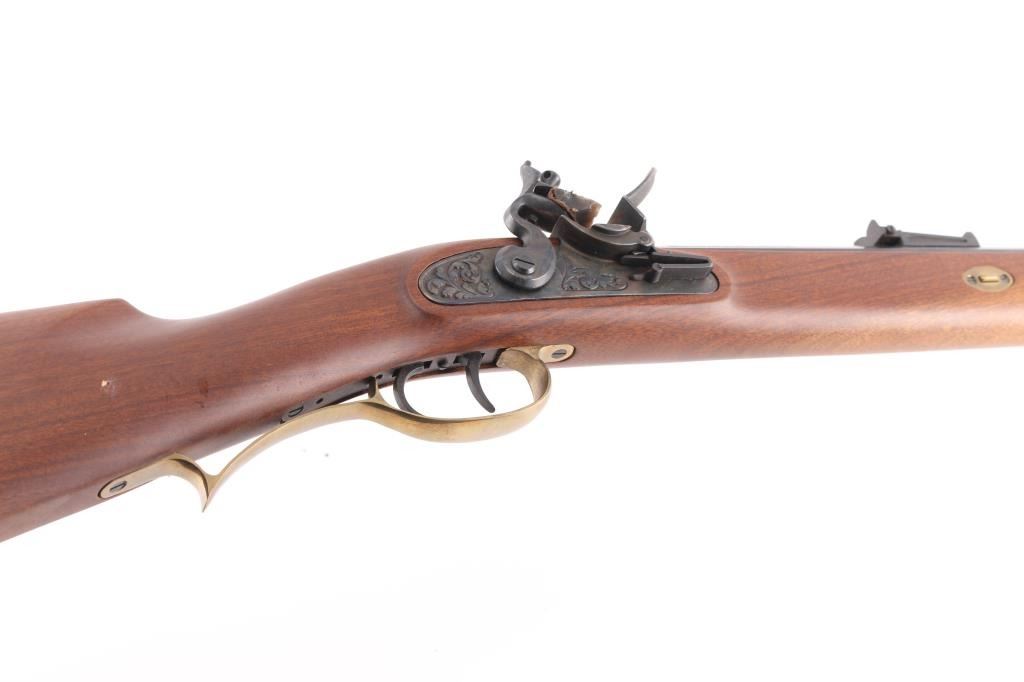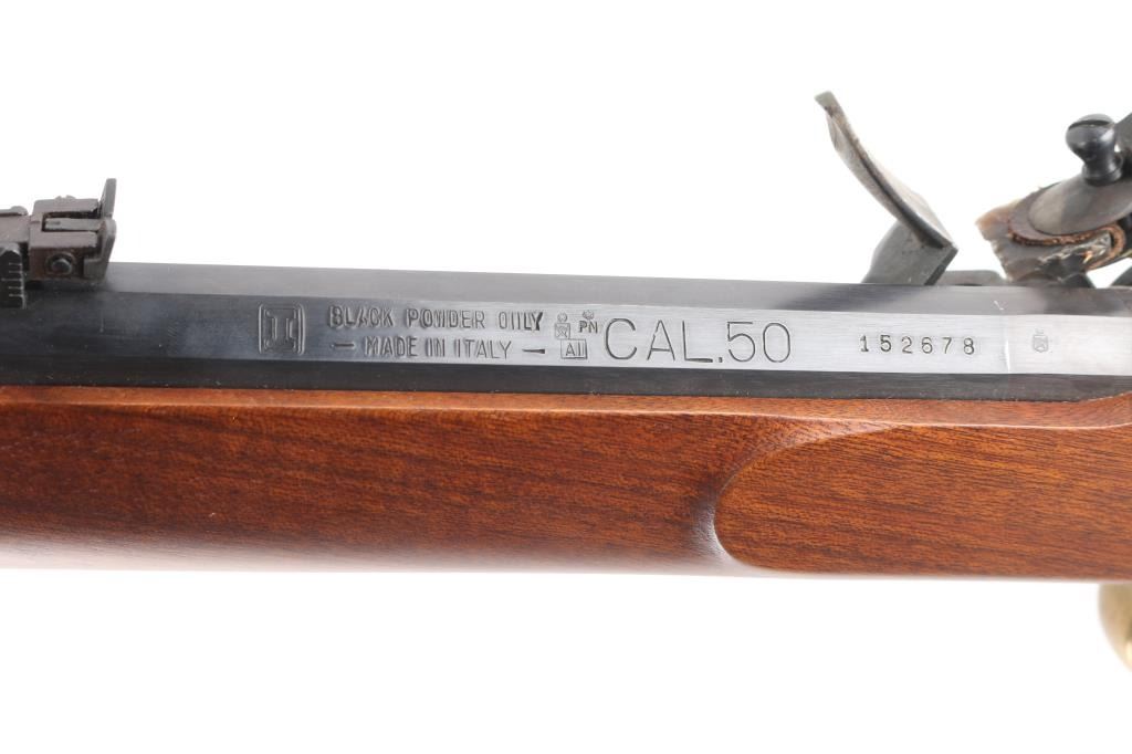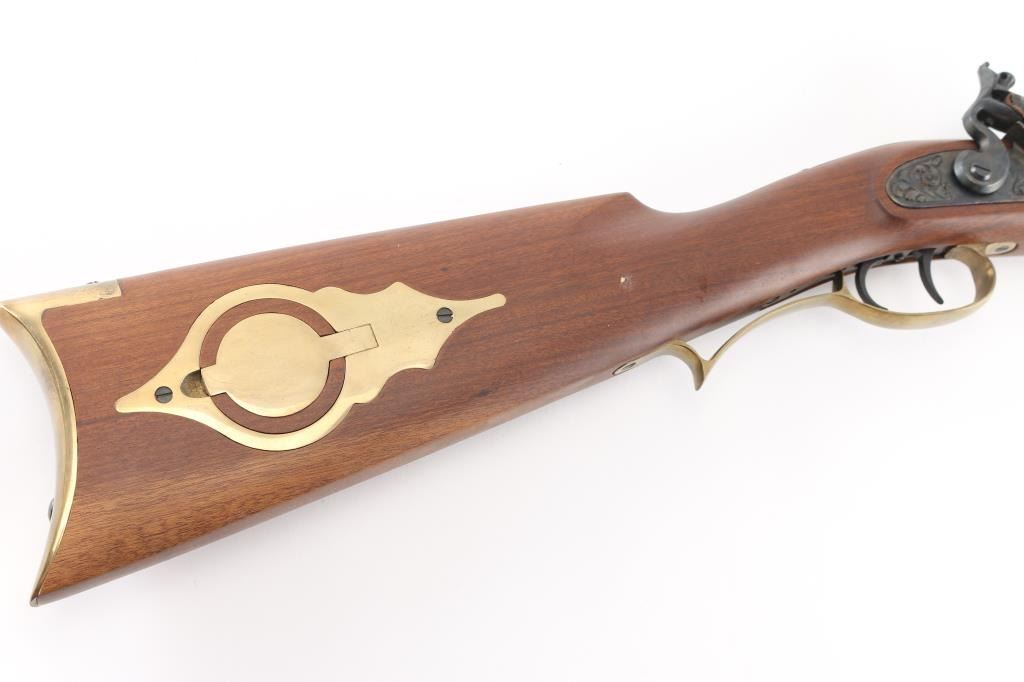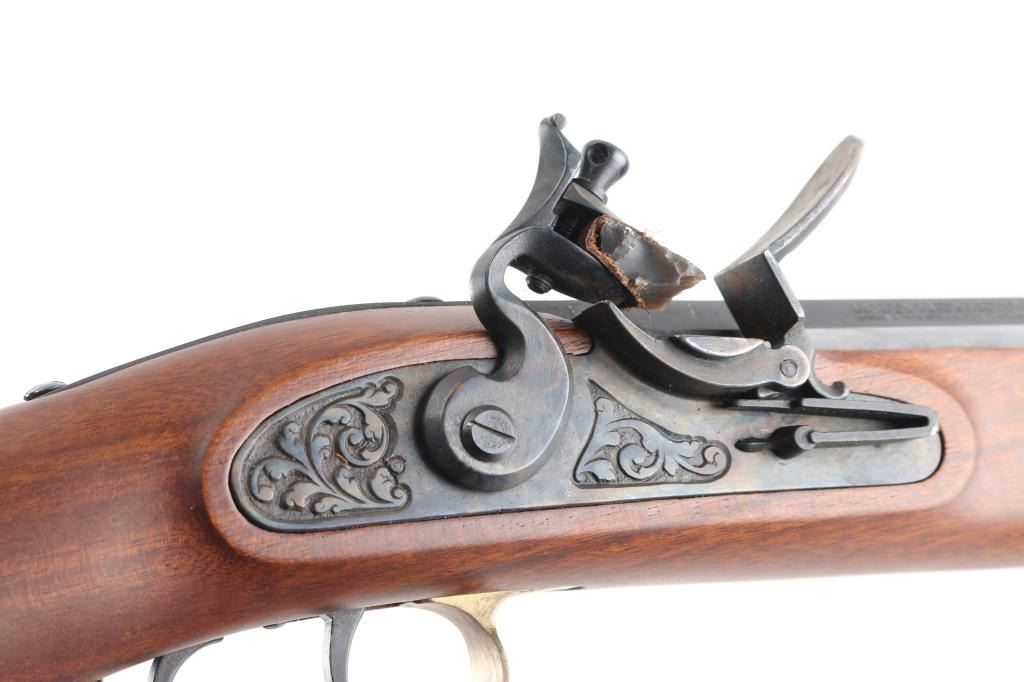 Manufactured in Italy by the Salvinelli brothers in 1982. Flintlock Bridger Hawken Rifle , 28" octagonal barrel with 1 in 48" twist rate for patched ball hunting loads, dovetailed blade/bead front , fully adjustable u-notch rear sights, one piece walnut stock with brass plated fittings, right hand cheek rest, patch box, ramrod, double set triggers. Blue barrel, case color lock. Rifle is in like new condition, two-cock hammer action is smooth/, crisp, bore is Excellent, strong rifling.NRA Condition-Excellent. Antique Firearm.