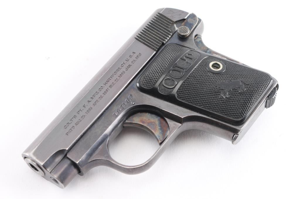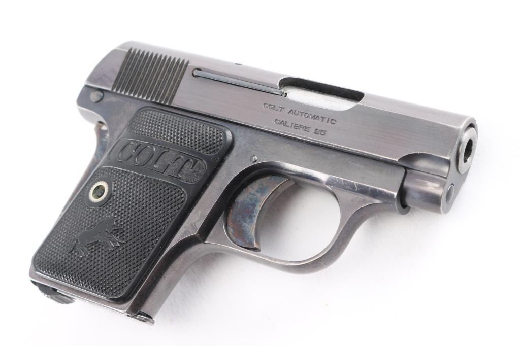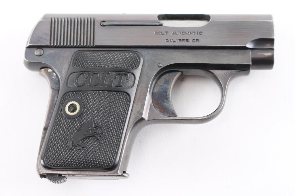 Colt 1908, 25 caliber "pocket auto" c.1918. High polish blue finish, hard rubber grips, case colored small parts. 90-95% plus original blue and case colors remaining. Grips show slight wear. Some small scratches and loss of finish at the muzzle and grip safety mostly. Two-tone Colt magazine in well matched condition. An 8-1/2 to 9 on 1-10 scale.Condition is NRA Excellent.*** C&R Firearm ***