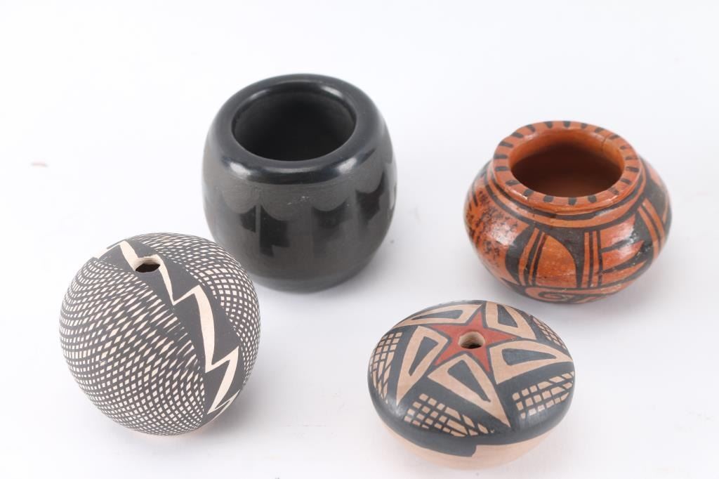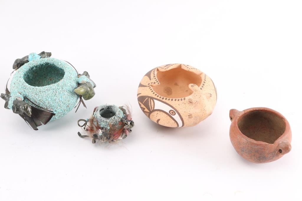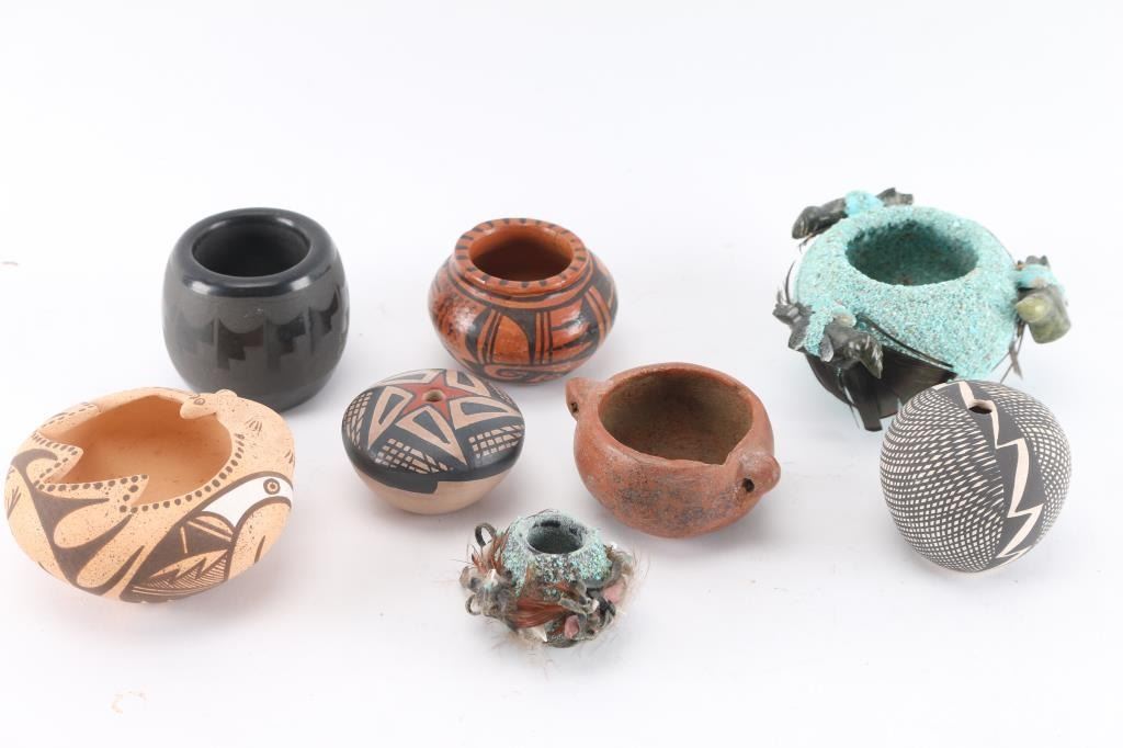 (2) Turquoise encrusted fetish pots, good condition. One measures 3" x 2", the other 1 1/2" x 1 1/2". (1) Santa Clara pot signed on bottom by J. R. Padilla, measures 2" x 1 3/4", good condition. (1) Zuni lizard pot signed on bottom by N. Simplicio, circa 6/88. (2) Seed pots, one is Acoma signed P.C. and measures 3" x 1 1/2", the other unsigned painted with star design, measures 1" x 2". (1) Polychrome Hopi pot signed on bottom with corn symbol, has 1" crack at rim, measures 1 1/2" x 2 1/4". (1) pre-Columbian pot with chip at rim, measures 1 1/4" by 2 1/2".