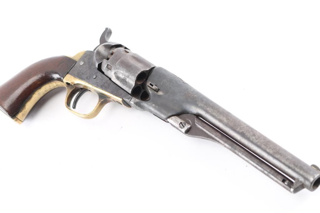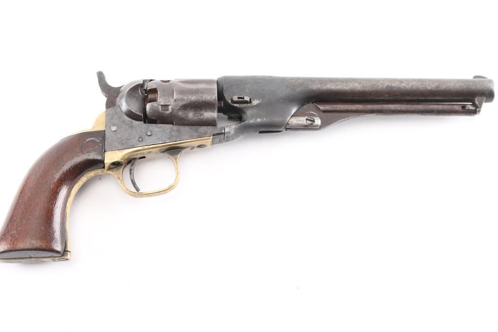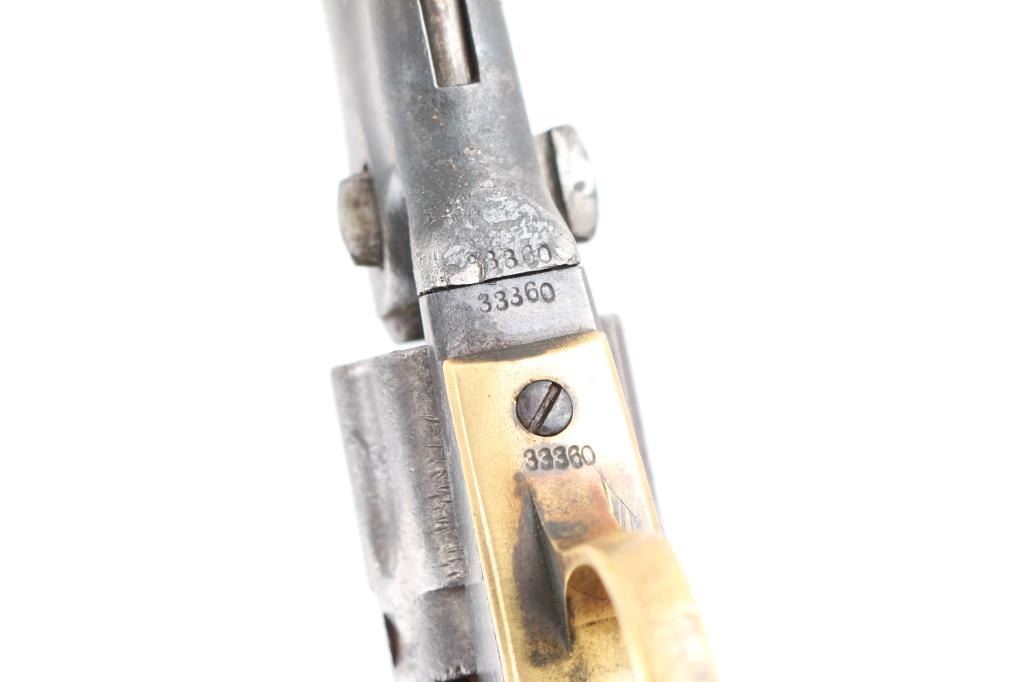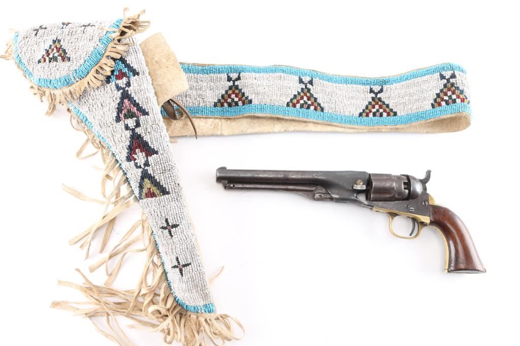 SN: 33360. Post Civil War era revolver manufactured 1866. Blue finish with case hardened frame, 4.5 round barrel, half fluted cylinder, brass triggerguard and backstrap, one line Address on barrel, Colts Patent" on left frame and 36 Cal on left triggerguard. All matching serial numbers, the wedge is unmarked. Marking are feint but mostly readable. Hammer action is very stiff, cocks but the cylinder does not rotate, the finish has turned a brown/gray patina, there are tool marks on the backstrap and there is a 1 1/2" crack on the top barrel where it meets the cylinder. (Someone put too much powder in) Grips are very good, have been varnished. The wedge screw and one of the frame screws appear to be later replacements. Revolver has seen very hard use, which indicates possible native American usage. Comes with a beautiful vintage fringed Sioux beaded holster and belt. It features a fully-beaded front with sinew-sewn Venetian glass beads on smoke tanned elk hide with evidence of scraping. This style of beadwork is called Paha stitch or Hill stitch- formerly called lazy stitch. The designs used by the Plains Indian tribes were multicolored geometric, that is, they were made up of squares, triangles and other straight-sided figures. the designs are triangles built up of a number of small squares in a triangle shape often is interpreted as a hill. Nearly all of the Lakota (Sioux) designs are done on a white back-ground. Very good condition, bead work is intact.Condition-Relic. Antique Firearm.