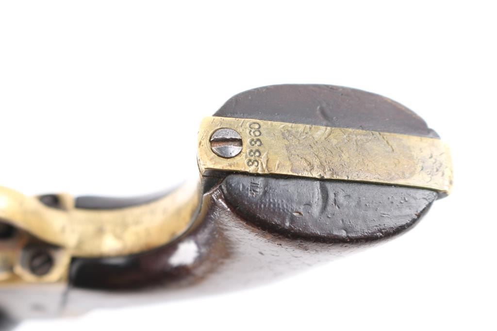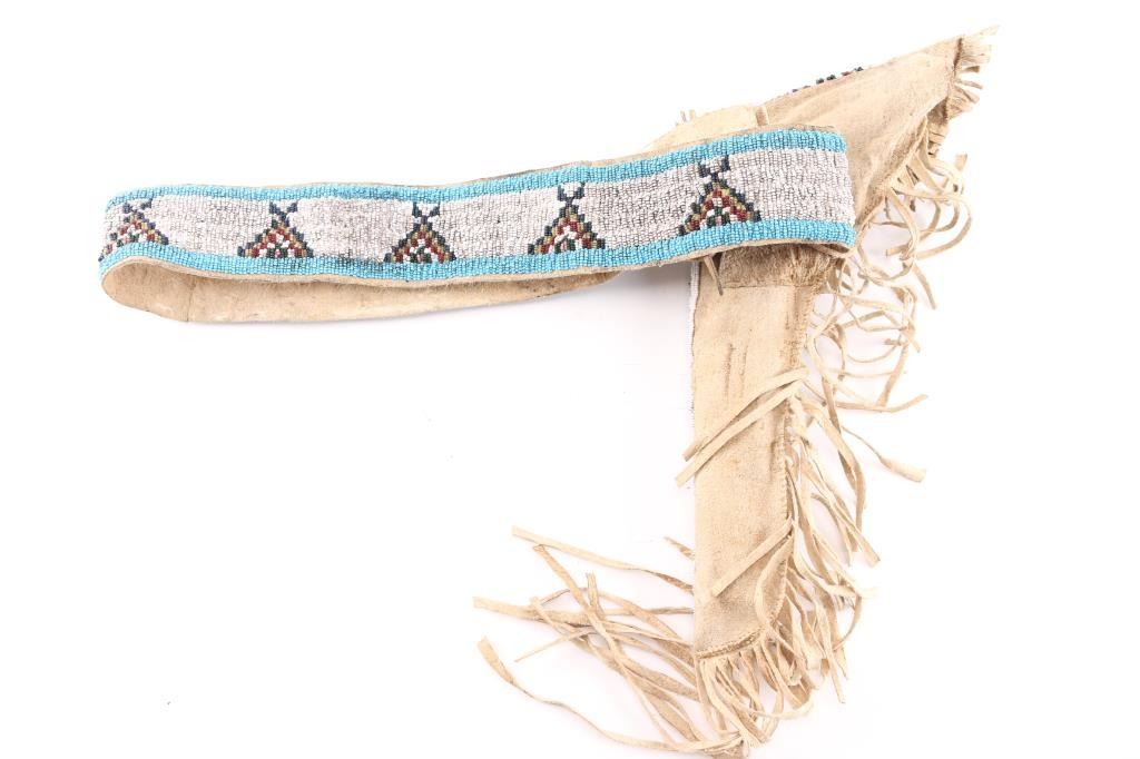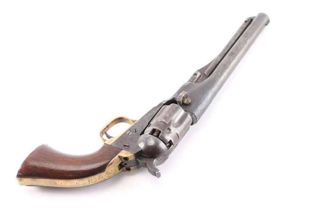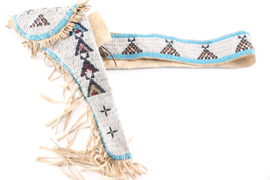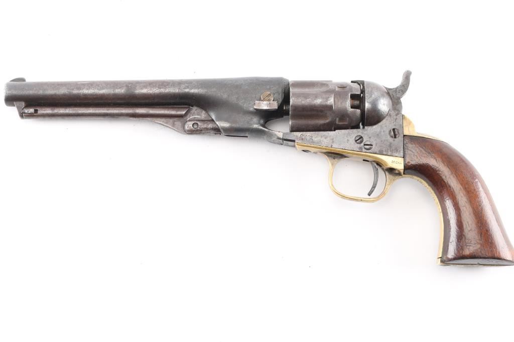 SN: 33360. Post Civil War era revolver manufactured 1866. Blue finish with case hardened frame, 4.5 round barrel, half fluted cylinder, brass triggerguard and backstrap, one line Address on barrel, Colts Patent" on left frame and 36 Cal on left triggerguard. All matching serial numbers, the wedge is unmarked. Marking are feint but mostly readable. Hammer action is very stiff, cocks but the cylinder does not rotate, the finish has turned a brown/gray patina, there are tool marks on the backstrap and there is a 1 1/2" crack on the top barrel where it meets the cylinder. (Someone put too much powder in) Grips are very good, have been varnished. The wedge screw and one of the frame screws appear to be later replacements. Revolver has seen very hard use, which indicates possible native American usage. Comes with a beautiful vintage fringed Sioux beaded holster and belt. It features a fully-beaded front with sinew-sewn Venetian glass beads on smoke tanned elk hide with evidence of scraping. This style of beadwork is called Paha stitch or Hill stitch- formerly called lazy stitch. The designs used by the Plains Indian tribes were multicolored geometric, that is, they were made up of squares, triangles and other straight-sided figures. the designs are triangles built up of a number of small squares in a triangle shape often is interpreted as a hill. Nearly all of the Lakota (Sioux) designs are done on a white back-ground. Very good condition, bead work is intact.Condition-Relic. Antique Firearm.