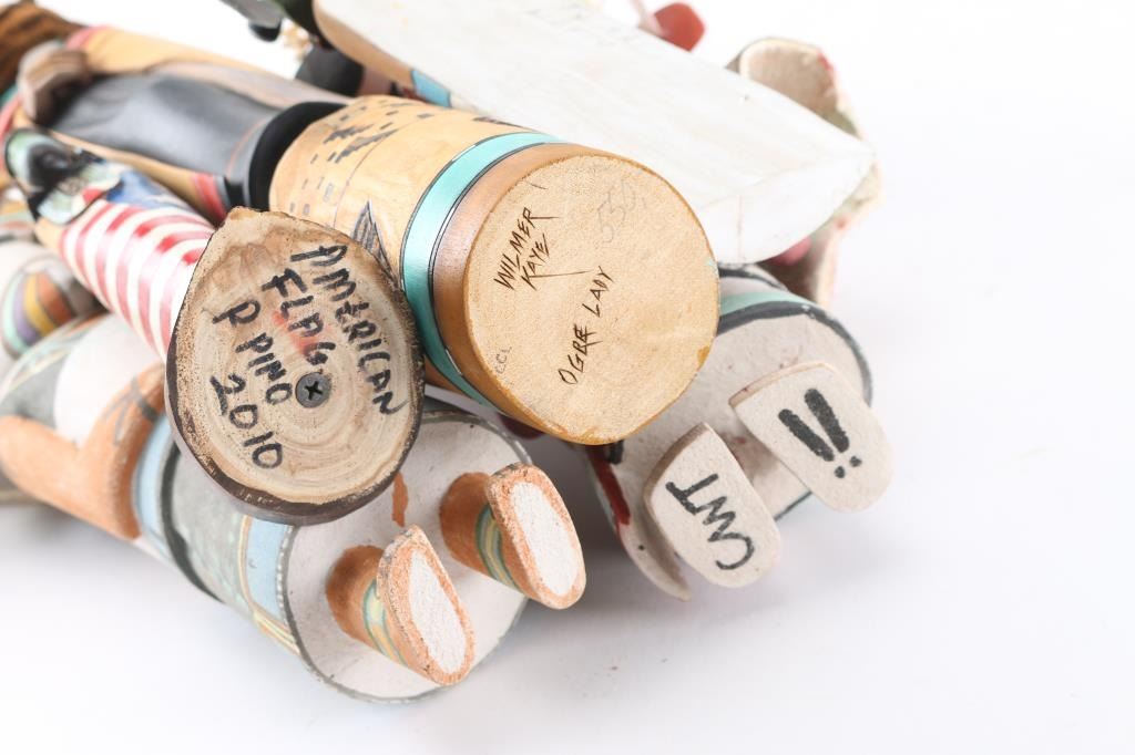 (1) Ogre kachina by CWT!! signed on bottom, measures 18" tall, in good condition. (1) Butterfly maiden kachina, measures 17" tall, in good condition but missing one arrow at top of headdress. (1) Ogre Lady kachina by Wilmer Kaye, signed on bottom, measures 16 1/2" tall, in good condition with one carved feather missing from top of head. (1) Flatback ogre kachina measuring 8", signed on back. (1) American flag kachina by P. Pino, 2010, measures 8 3/4" tall.