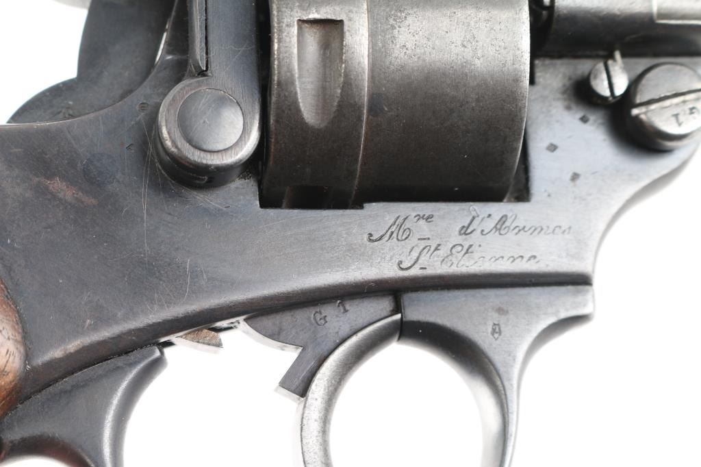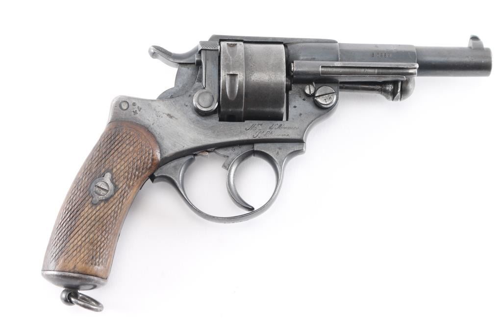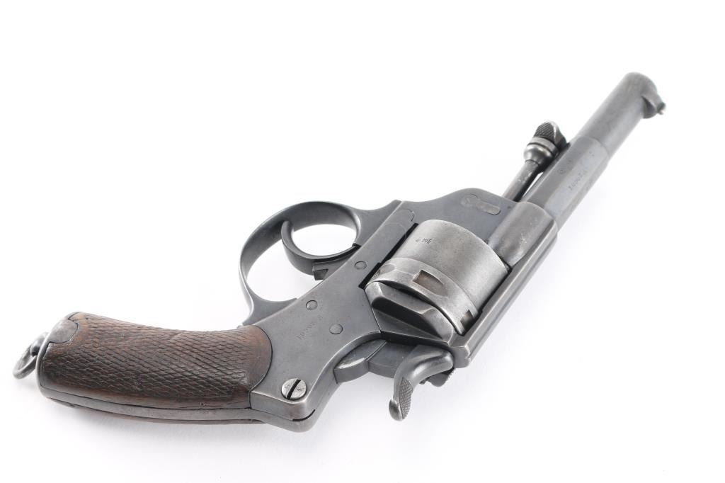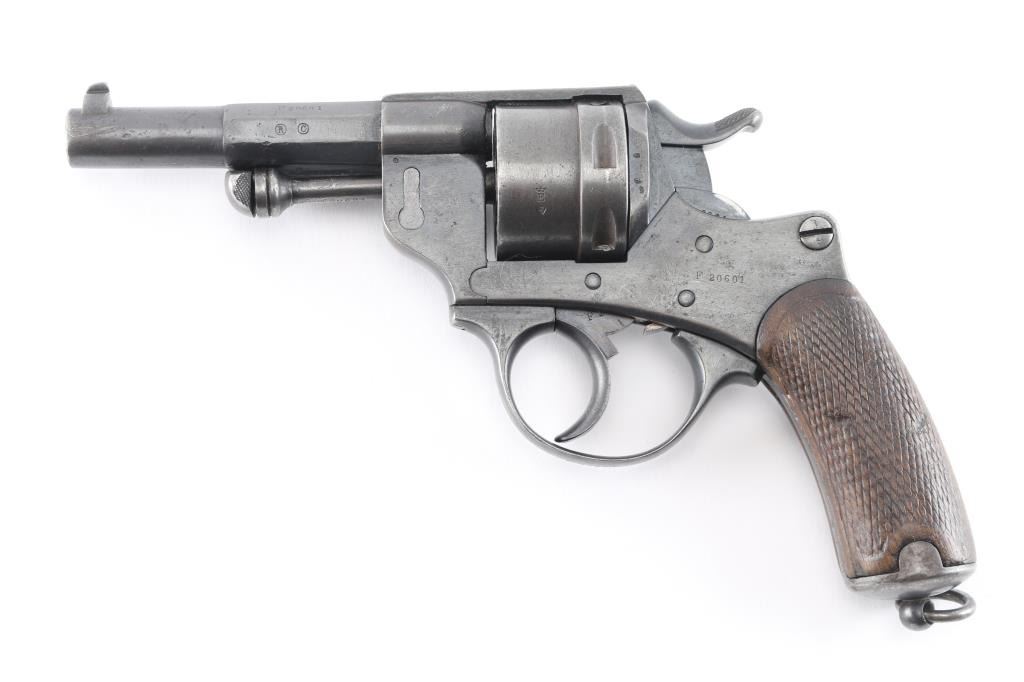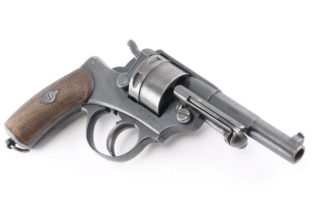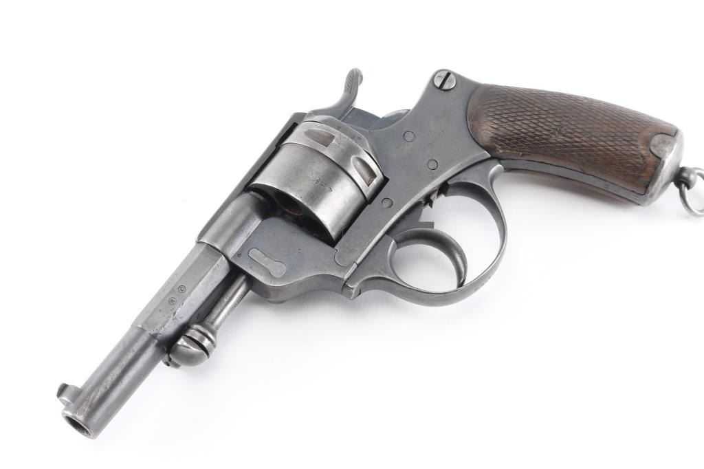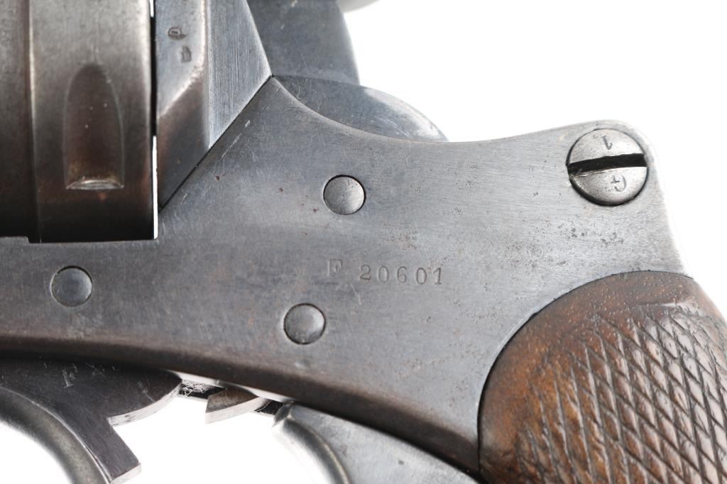 French military revolver dated 1889. Features double/single action, solid frame side loading, 4.5" half-round half-octagon barrel, fixed sights, 6 shot unfluted cylinder, checkered wood grips. Lanyard ring at butt, ejector rod. All matching serial numbers. Bore is fair, slightly dark, patches pitting, rifling present. Charge holes are overall good. Original dull blue finish is about 75% with holster, handling and edge. Grips are good solid condition, minor dents & scrapes, some wear to the checkering. Action is smooth, with good lock-up. Many French proofs. Markings are generally crisp, readable. NRA Condition-Near Fine as Antique Firearm.