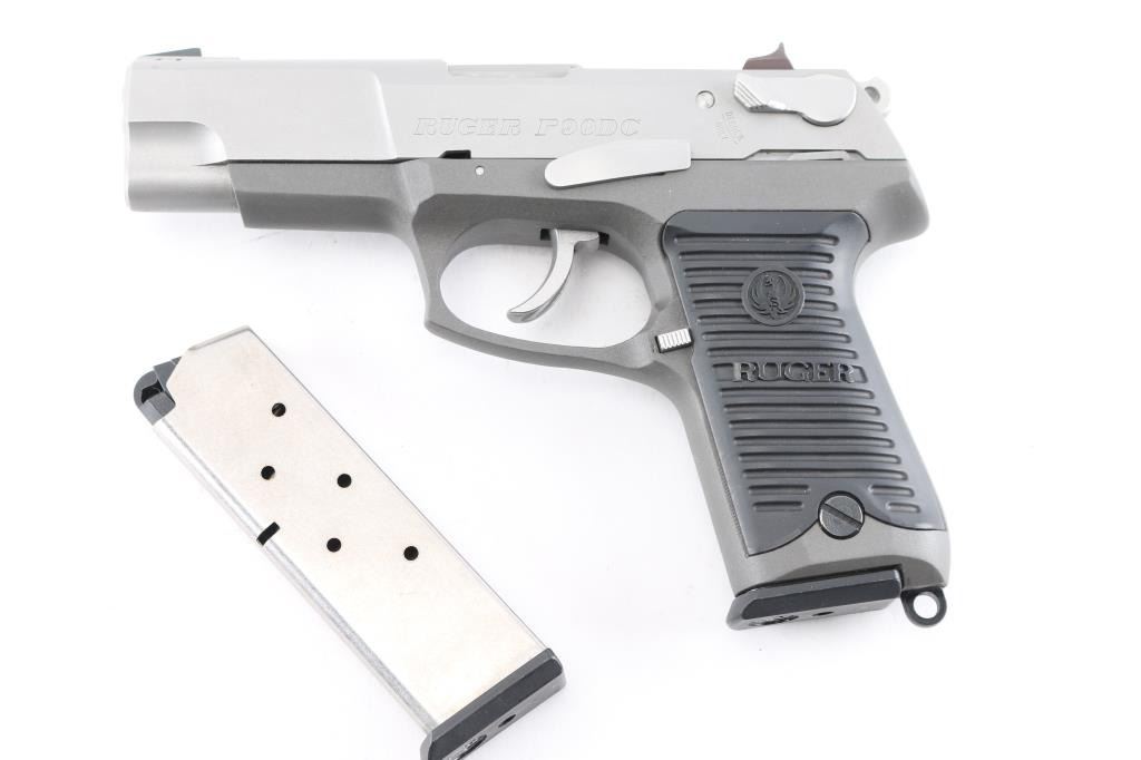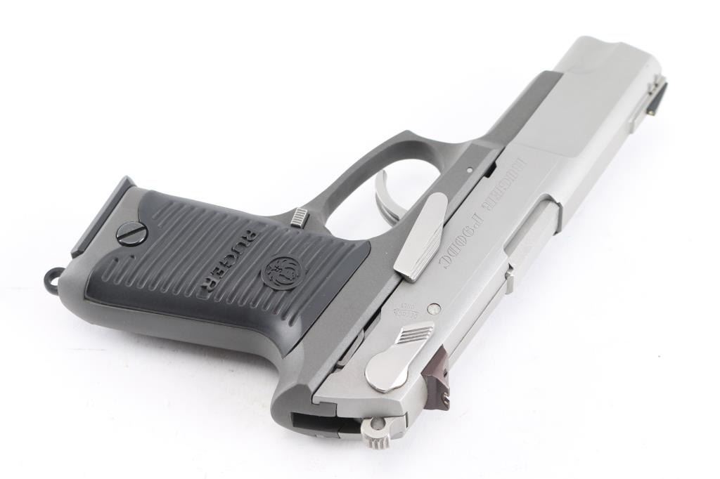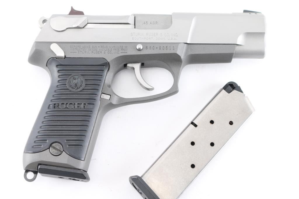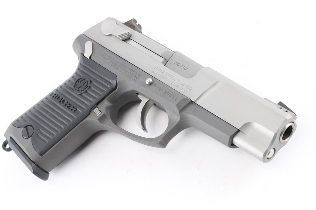 American made semi-auto pistol chambered for .45 ACP ammunition, circa 1996. It has a 4.25" barrel, matte stainless slide, grey alloy frame, black serrated Ruger plastic grips, pinned front sight, dovetailed rear sight, 3 white dots, ambidextrous thumb safety/Decocker, smooth trigger and serrated round hammer spur. Metal finish is excellent. Grips are fine. Bore is pristine. Comes with a spare factory magazine, (2) totalCondition is NRA Excellent. Modern Firearm.