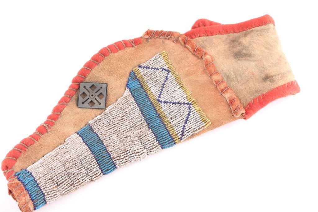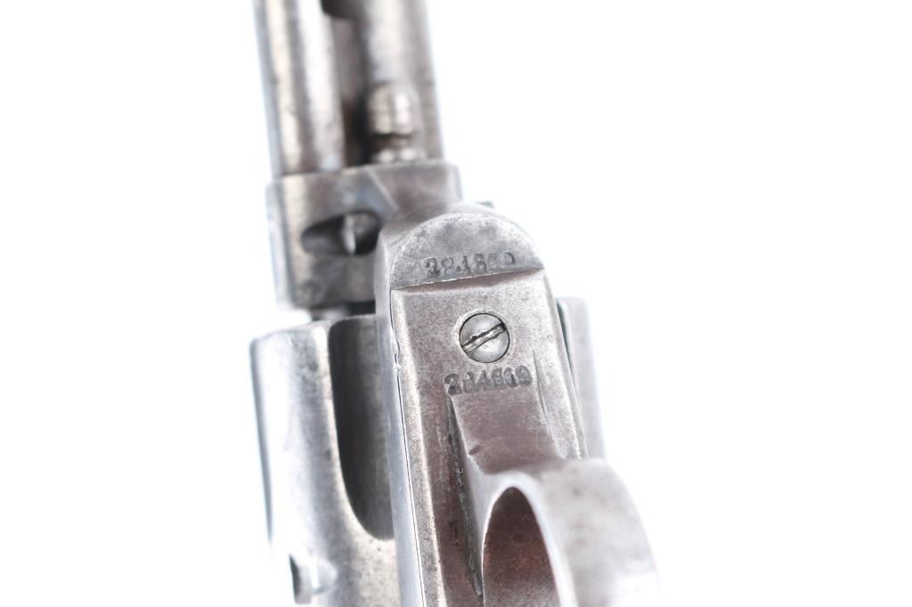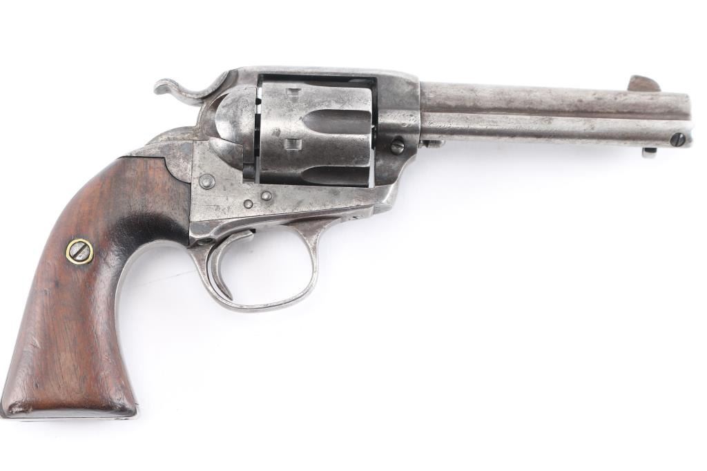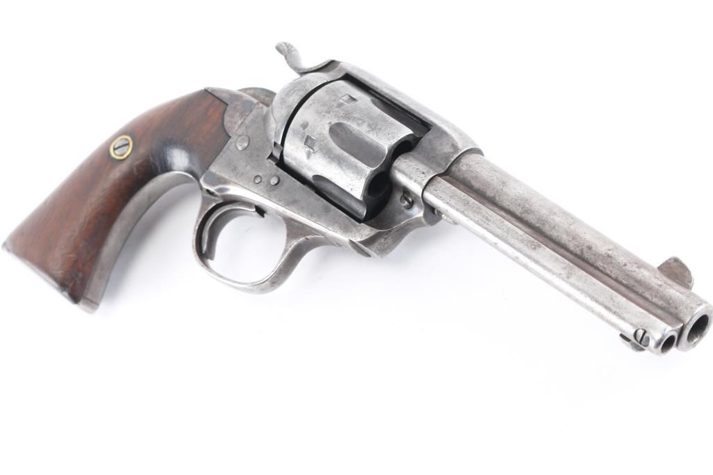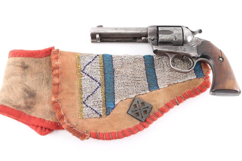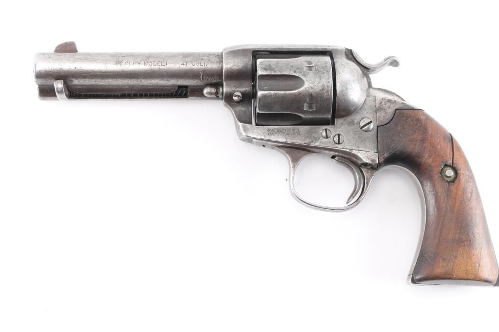 1st generation Colt Single action army revolver manufactured circa 1906. Features 4 3/4" barrel, fixed sights, vintage smooth grips, Bisley shaped grip & hammer. Bore is good with good rifling with some light scattered pitting. Charge holes are good condition. Original finish has turned a gray patina with many scratches/dings. Grips are fair with a 1 1/2" crack in the left panel, the grip frame is a little proud of the wood at the heel. Two line address on top of barrel. Markings are crisp. Bisley Model, .41 Colt." on left of barrel . All the serial numbers match. 917 assembly number on loading gate. Action is smooth with good lock-up. Comes in a vintage brown suede holster with multicolored bead work on the front, lined with red felt, metal ornament attached. Very good condition, bead work intact.Condition is NRA Good. C&R Firearm.
