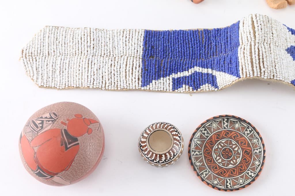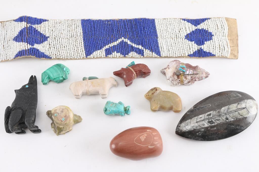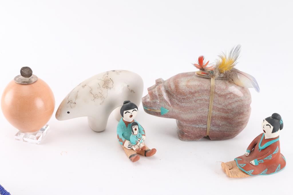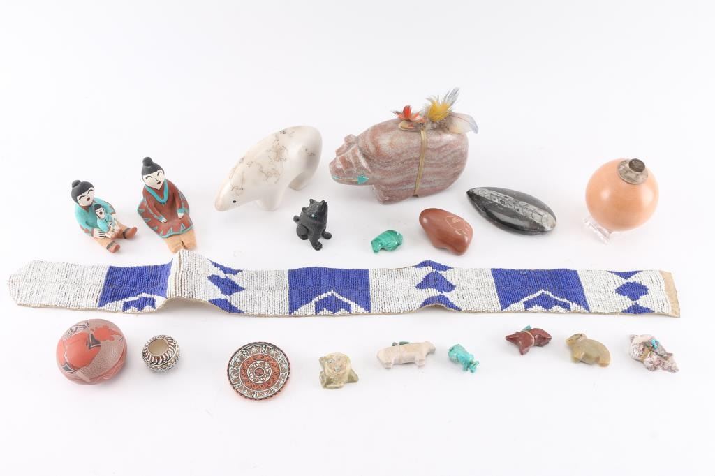 (1) Pink Limestone Bear with fetish, measures 3 1/2" tall by 6" long by 1 1/2" across. (1) White pottery bear, from Acoma, NM, maker marked, measures 3" tall by 5 1/2" long by 1 1/2" wide. (1) Small red pottery bear, 1 1/4" tall by 2 1/4" long by 1" wide, maker marked. (8) small fetishes including bear, buffalo, rabbit and frog measuring 3/4" to 2 2/3". (1) Egg shaped pottery on stand measuring 4 1/2" tall by 9" around, silver lid. (1) Fossilized Orthoceres from Erfoud, Morocco on stand, measures 3" tall by 4" long. (1) Small round pottery with mudhead design, maker marked, 8" around, 2 1/2" tall. (2) Tiny pottery pieces, plate 2 1/4" around and bowl, 1 1/4" tall, both maker marked. (2) Storyteller pottery pieces, the largest measuring 3 1/2" tall by 3 1/2" long, both maker marked. (1) Blue and white beadwork on old leather, 28" long.