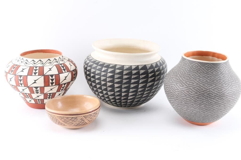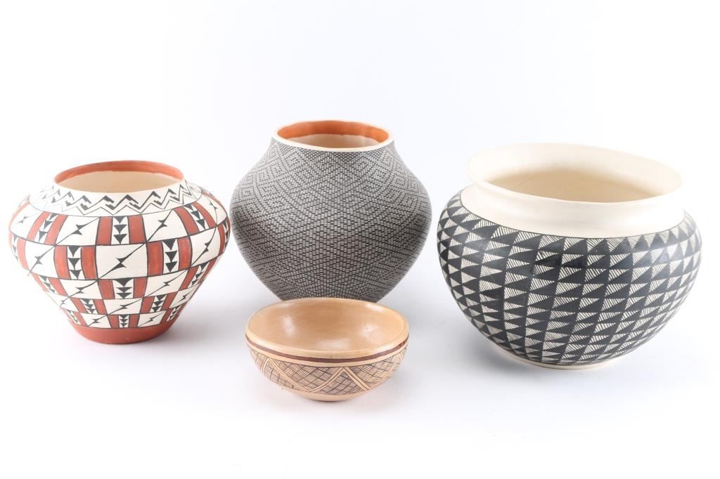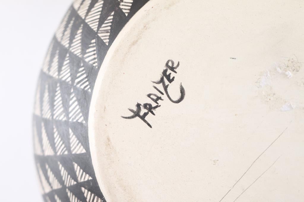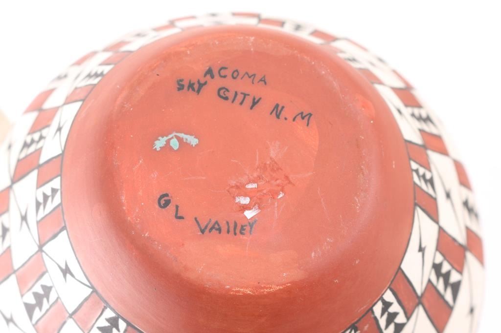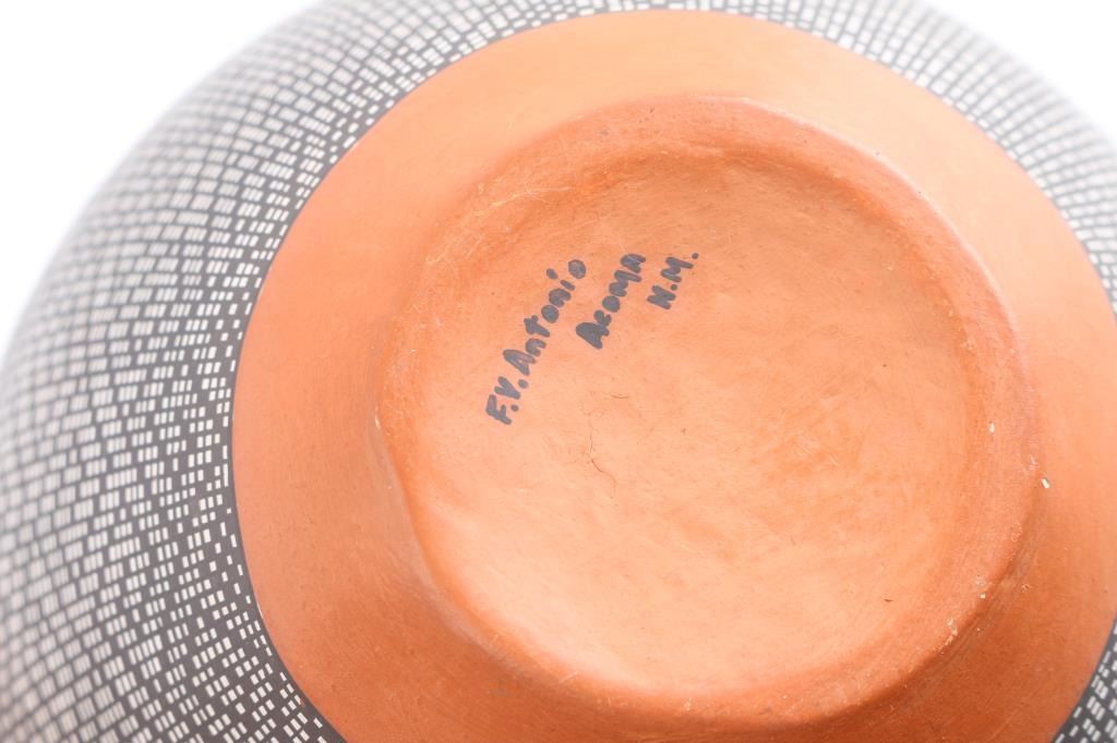 (1)Acoma signed FV Antonio signed on base with black and white geometric design 8"x8"(1) Small polychrome bowl signed PCH measures 5"x3"(1)Acoma Pot signed Sky City NM GL Valley 9"x7"(1)Black and White Geometric Pot signed on bas Frazier measures 10"x8"