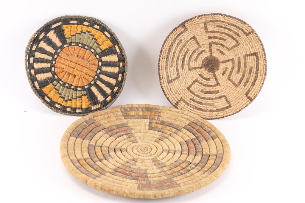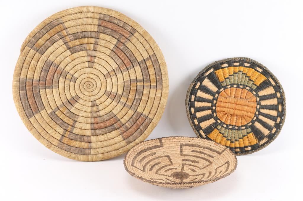 (1) Hopi thunderbolt pattern basket, faded. Measures 12 1/2" around. (1) Hopi basket in orange, green, yellow and black. Measures 8" around. (1) Pima basket in good condition, measures 8 1/2" around.