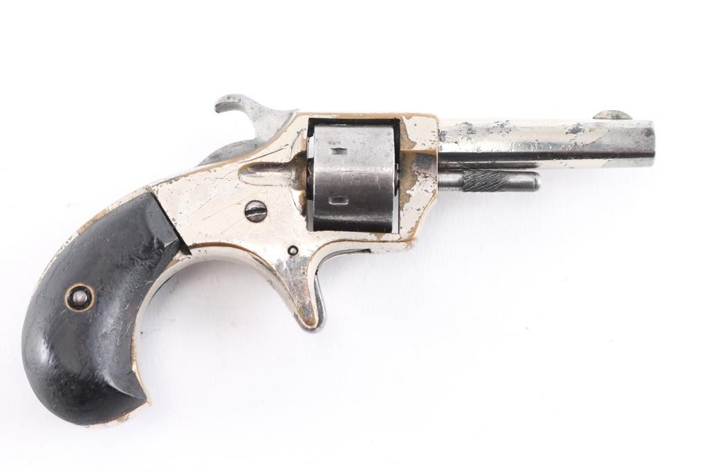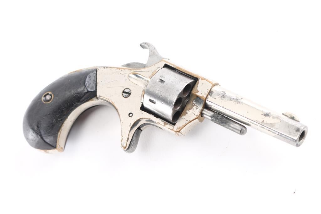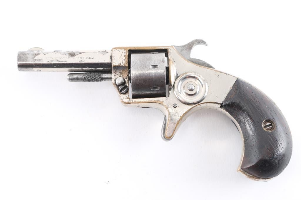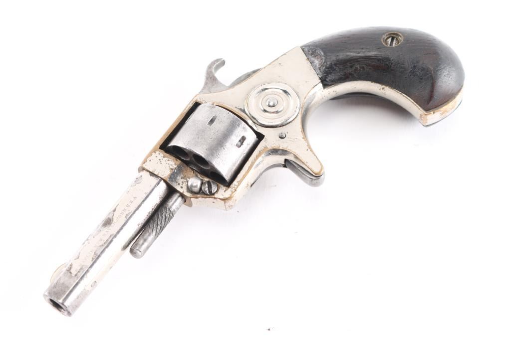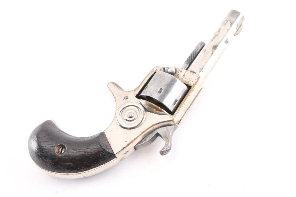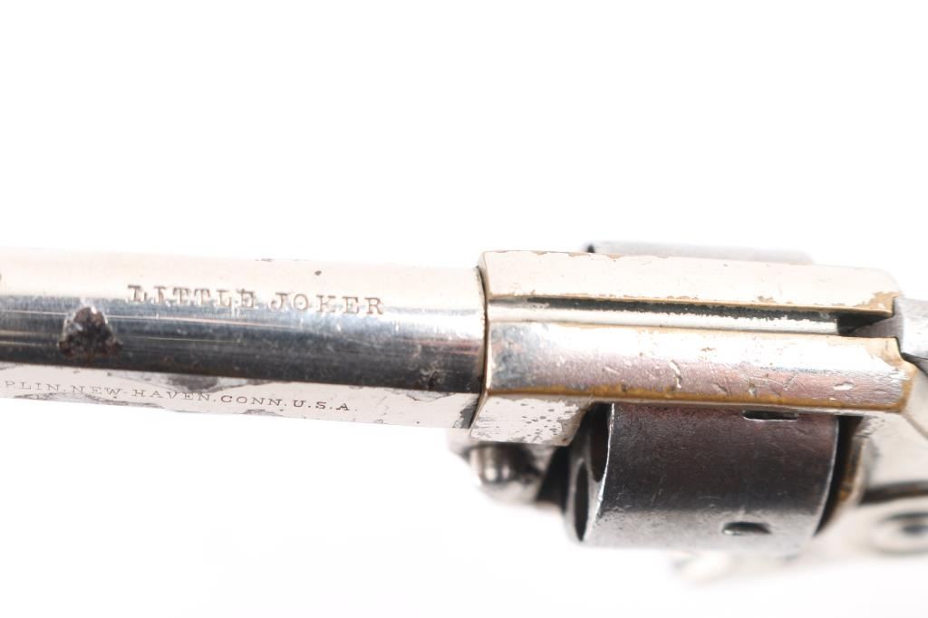 Marlin 22 cal spur trigger revolver marked "Little Joker", #7203. Fifty percent nickel finish remaining with some erosion where nickel has lifted. Grips replaced and cylinder pin also. A period handmade replacement. Works well and markings well defined. Condition is NRA Good***Antique Firearm***