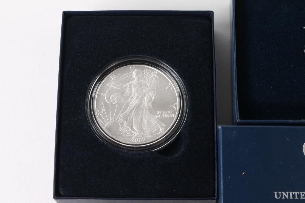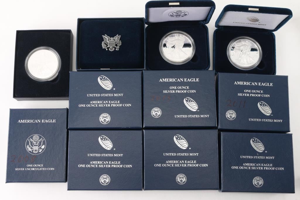 Eleven total. 2007 & 2008 - uncirculated; 2010, 2011, 2012, 2013, 2014, 2015, 2016, 2017 & 2018. All $1 American silver eagles. 1 oz. silver in blue OGP w/COA.