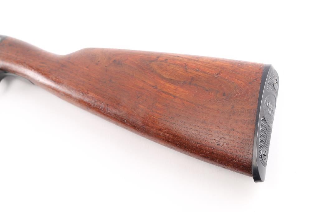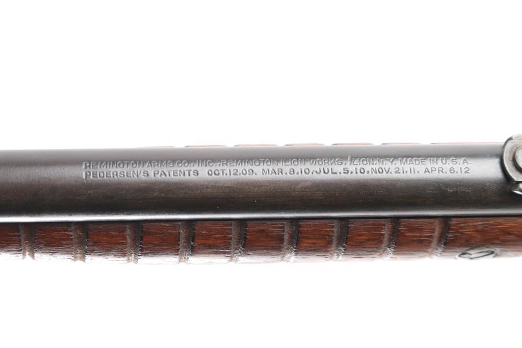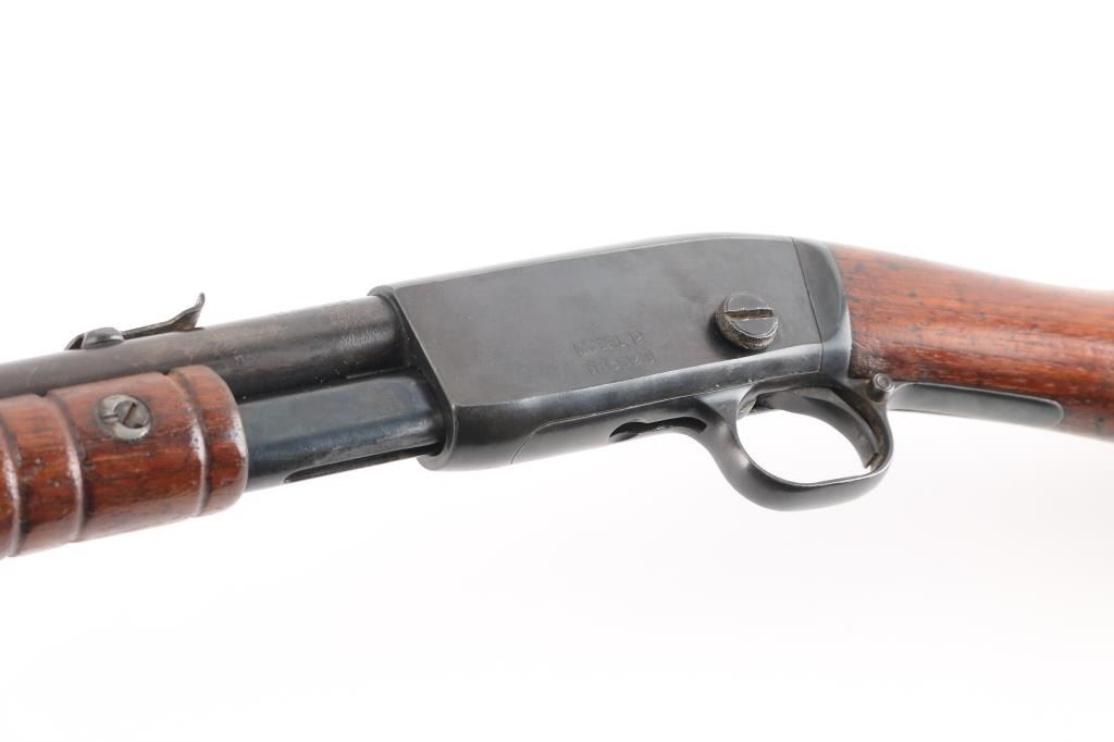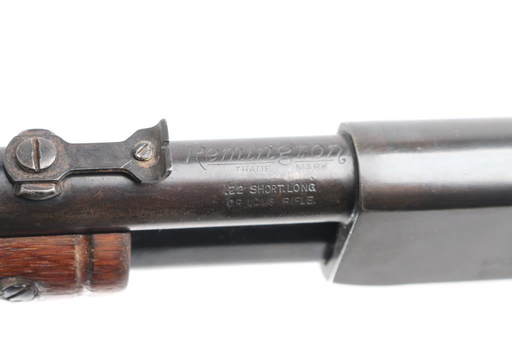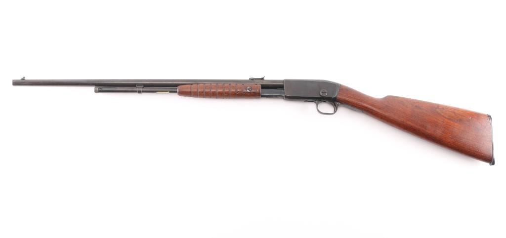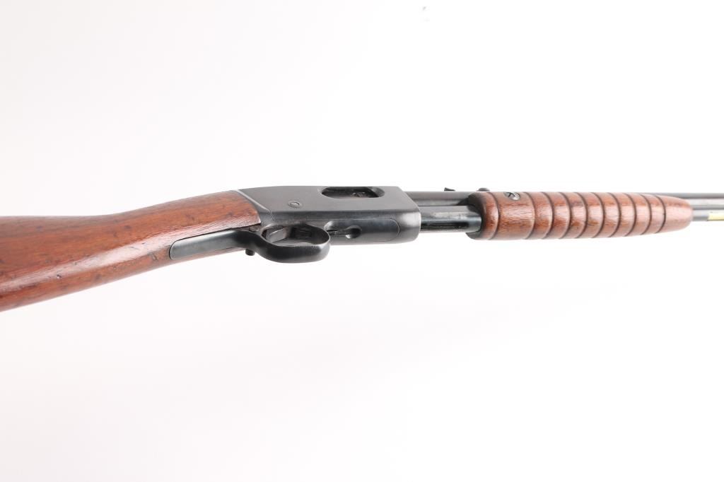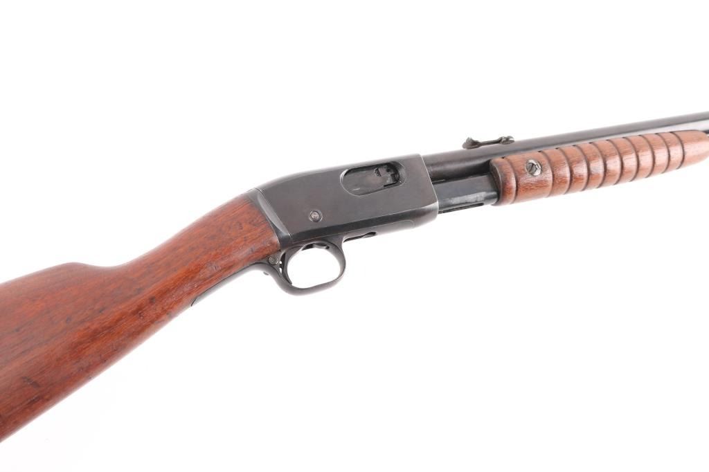 Vintage take-down slide action repeating rifle chambered for .22 Short, Long or Long Rifle. Manufactured pre 1920. (No date code) Features a old reblued finish, 22" round barrel, dovetailed blade front sight with bead, adjustable rear sight, 2/3 length tube magazine, smooth trigger, concealed hammer, push button safety, take-down steel receiver, grooved walnut slide handle and smooth curved grip shoulder stock with Remington/UMC hard rubber butt plate. The plate is a replacement as the bottom is proud of the wood. Bore is good/bright with a couple of areas of light pitting. The reblued finish is overall very good with minor scratches/edge wear action is smooth. Wood is very good/sound, minor scratches. Markings are clear.NRA Condition-Good. C&R Firearm.