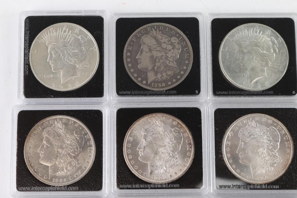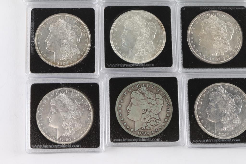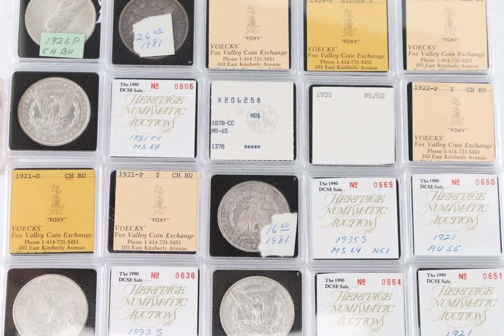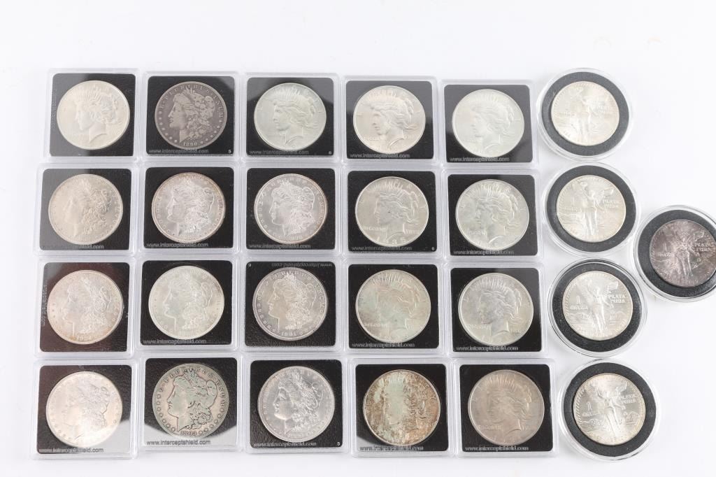 Total of ten Morgans, from 1878 to 1921; ten Peace, from 1921 to 1935 & five Mexico 1 Onza silver coins from 1982 to 1986. All in individual cases.