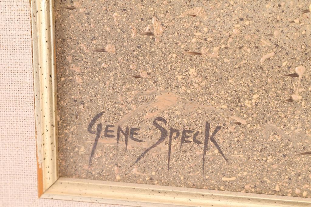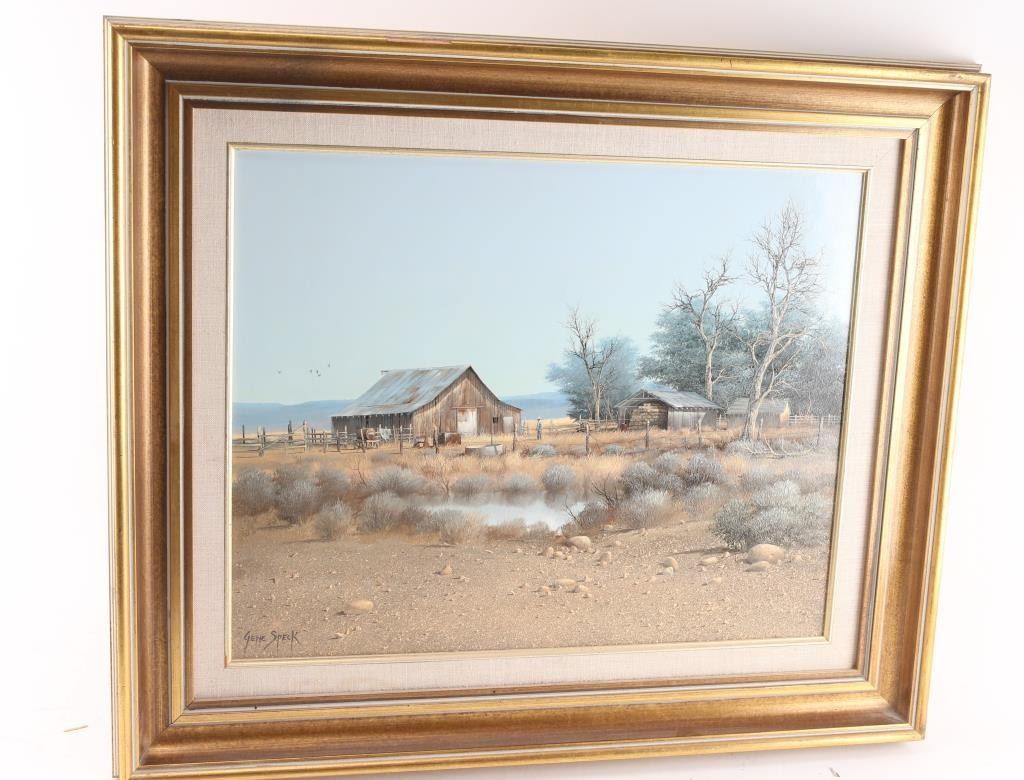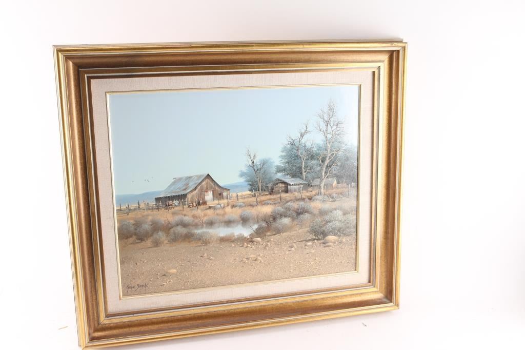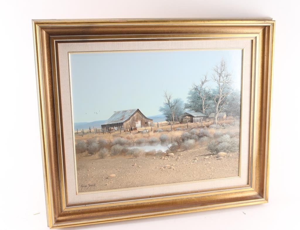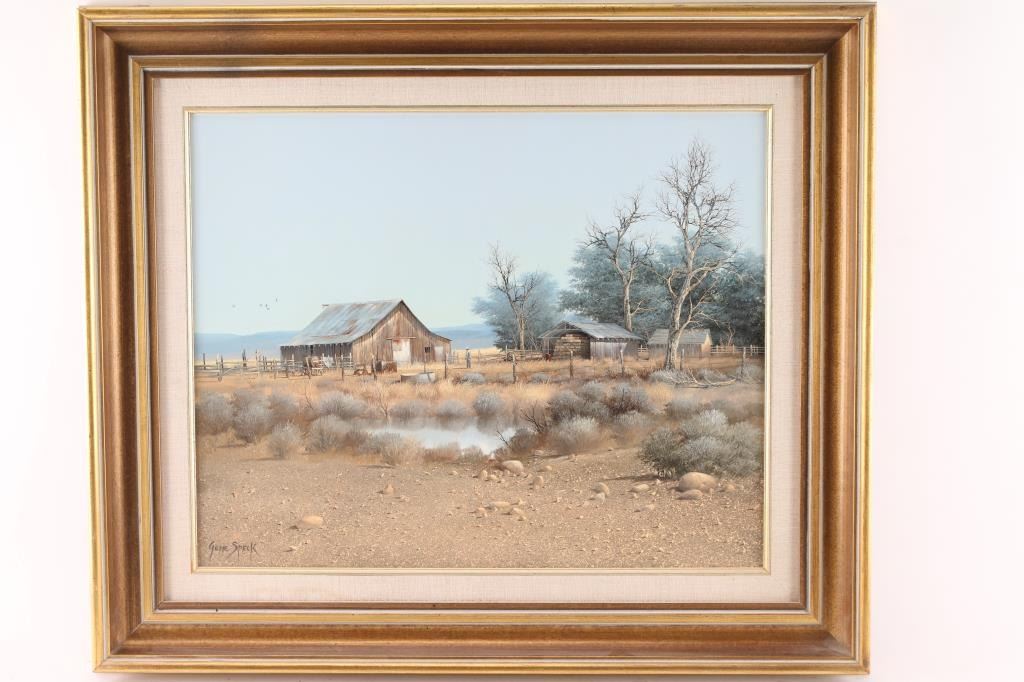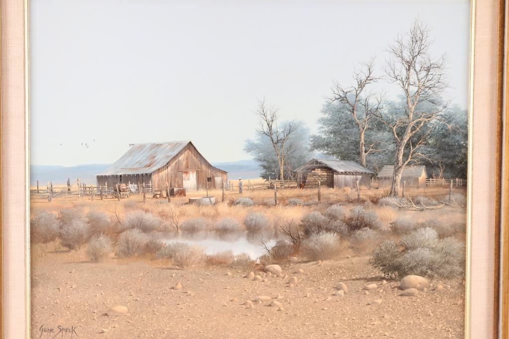 Titled "Nevada Ranch" signed. Gene Speck (Born 1937) is active/lives in Nevada, California. Gene Speck is known for Nostalgic mountain and plains painting, Indian encampments. 19-1/2" x 15-1/2"