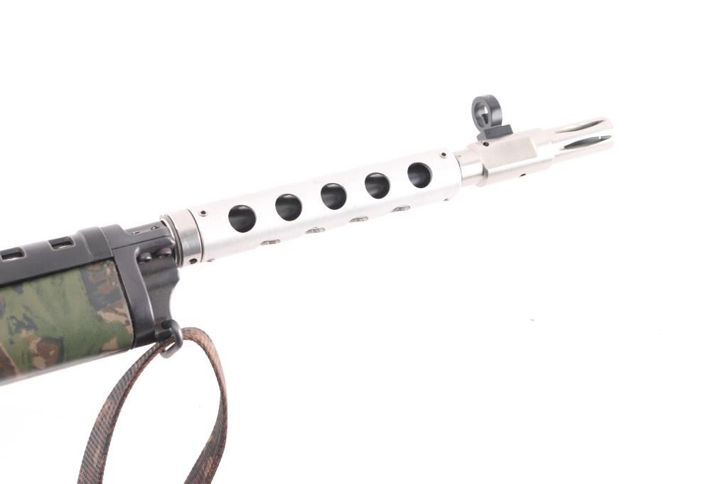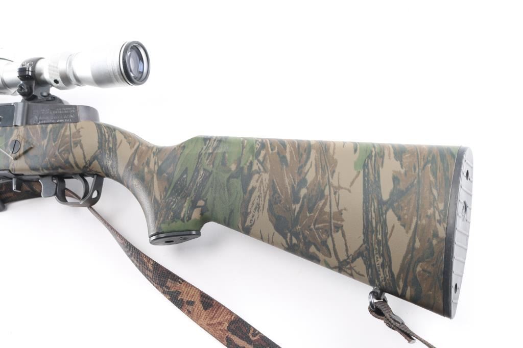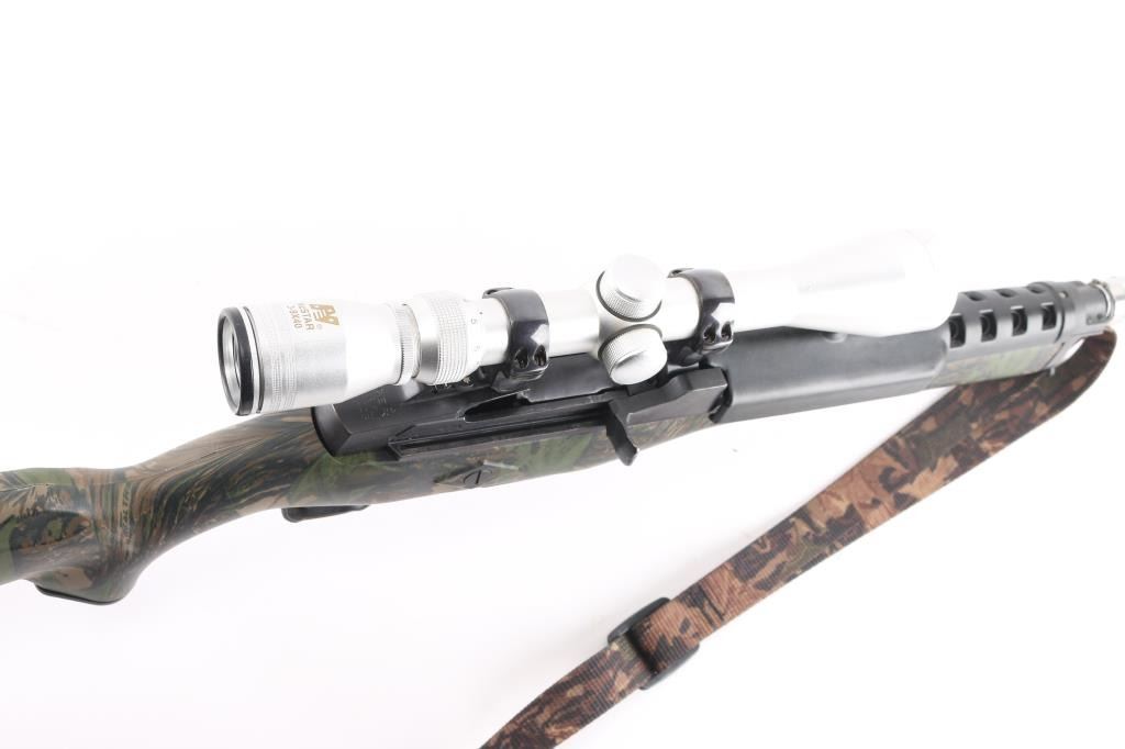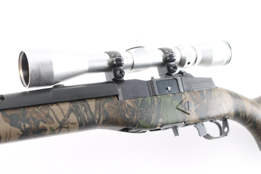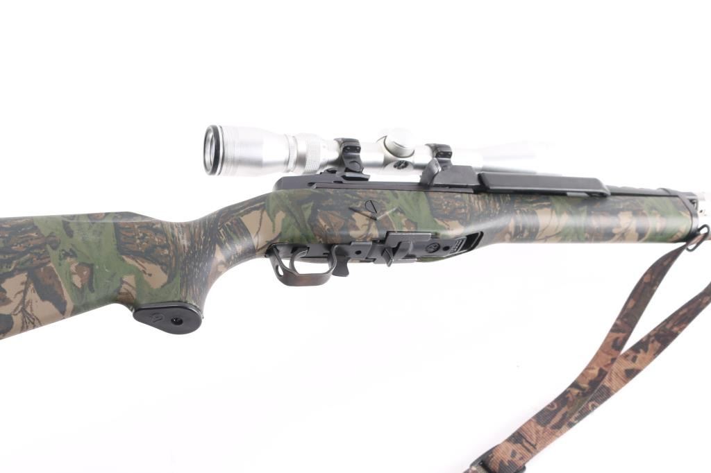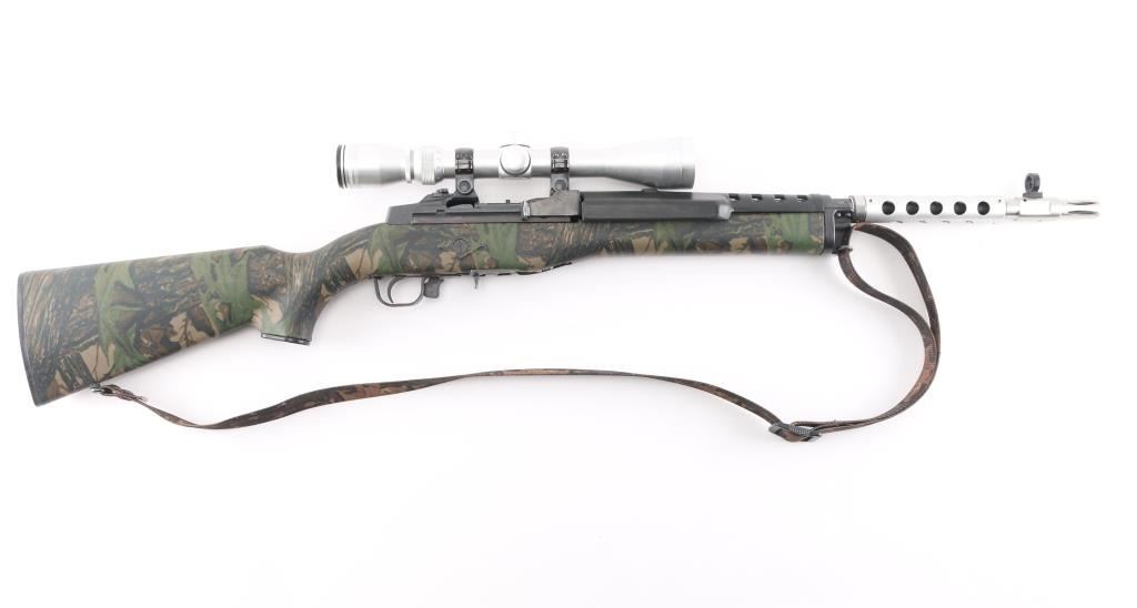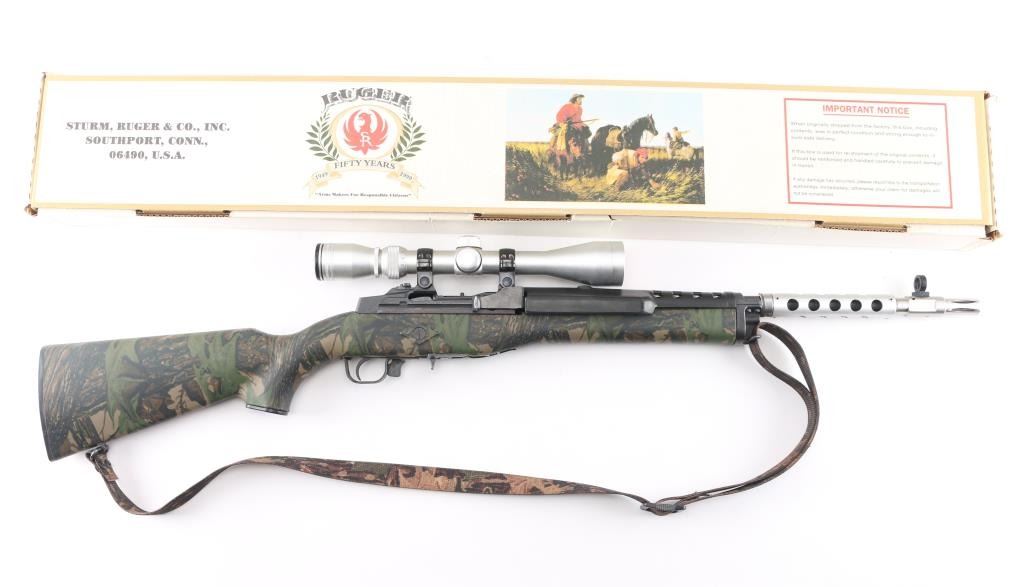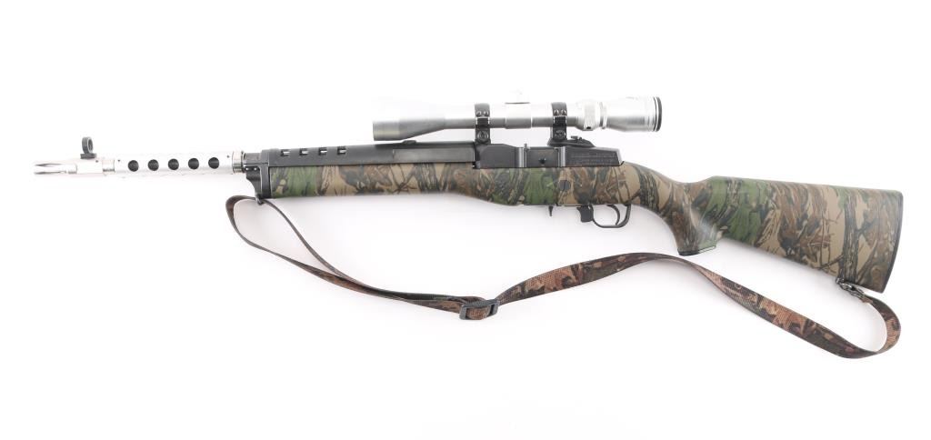 Custom semiautomatic rifle features blued 19" barrel with stainless steel muzzle brake installed, ring/post sight attached, folding adjustable leaf rear sight on receiver, 5.5" stainless steel ported barrel shroud installed, matte blue receiver, Realtree camo polymer stock with black plastic butt plate and grip cap, extended magazine release, vented black polymer handguard, manual safety, sling swivels. Camo nylon sling. Mounted with a NcSTAR 3-9X40 stainless finished scope, Mil-Dot reticle, clear optics. Bore is excellent/bright. metal finish shows minor scratches, rub spots. Stock is excellent. Includes (1) Ruger 5 round magazine. Comes with the original factory box with manual and the factory wood stock.NRA Condition-Excellent. Modern firearm.