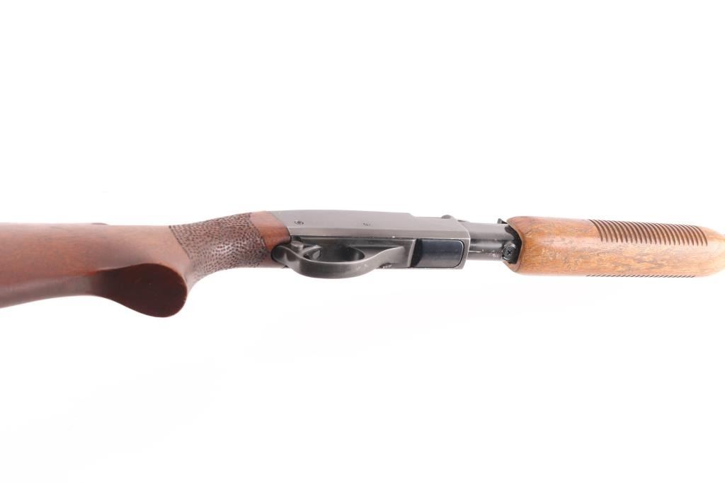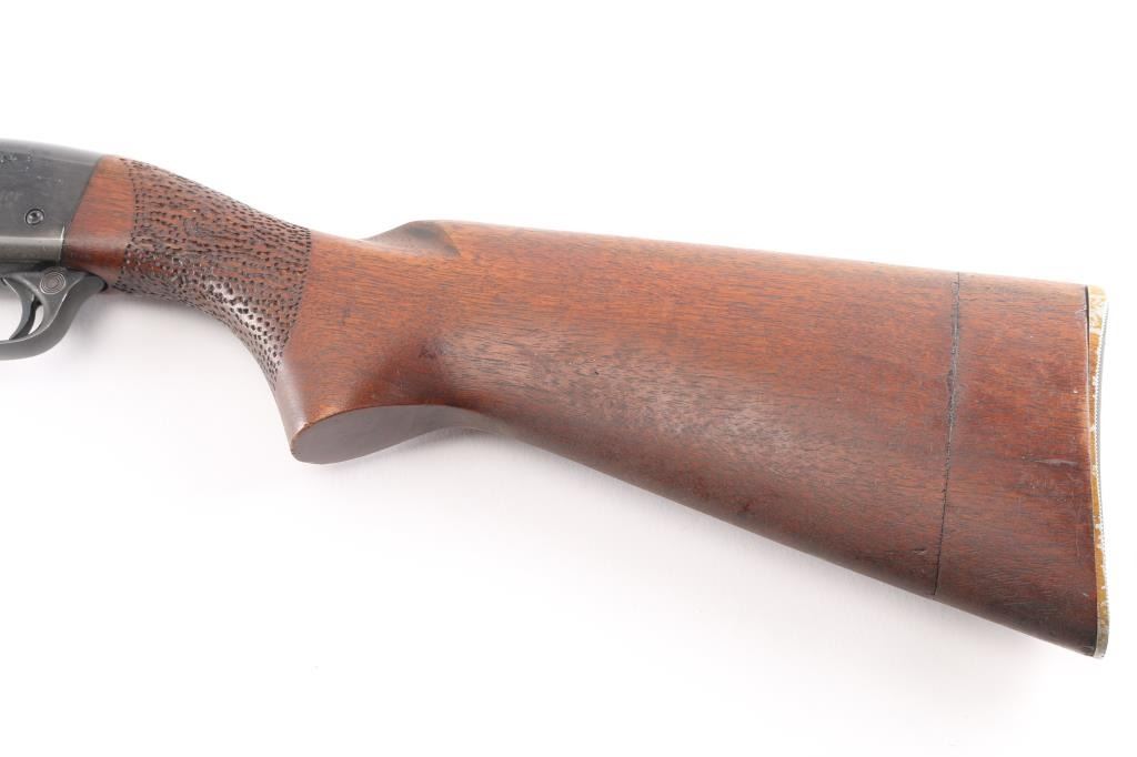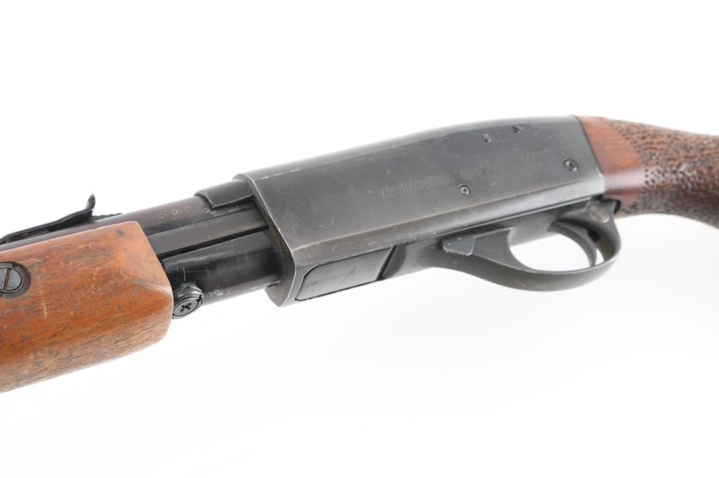 Fieldmaster Pump action rimfire rifle, with 1967 barrel date code (KP). Features blued finish, grooved walnut pump handle and stock with curved wrist,, someone has hand stippled the wrist for better grip, 19" barrel, magazine tube under barrel, blade front sight, sporting rear sight, push button safety and Remington aluminum butt plate. Bore is excellent/bright. Retains about 30% finish with edge/handling wear, scratches, scuffs, scattered patches of light pitting, mostly on the barrel/tube. The top and a portion of the left receiver has been painted black. Stock is sound with minor scratches/dings, handling wear to the pump handle, buttstock has been extended by adding a 2" piece of wood.Condition is near NRA Fair. C&R Firearm.