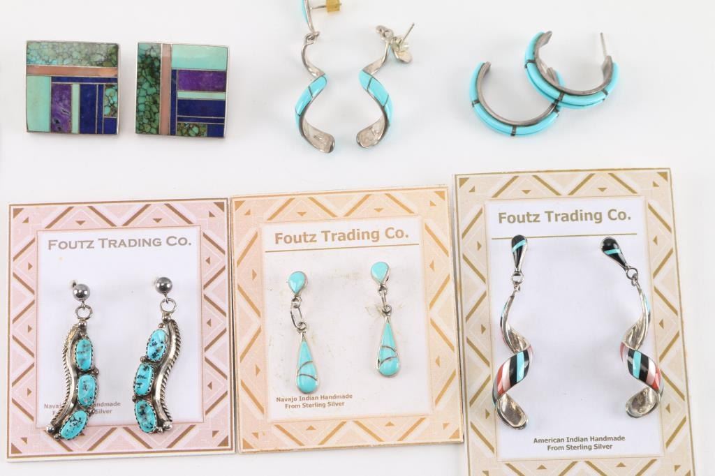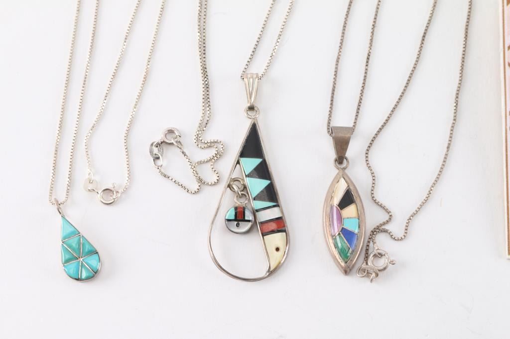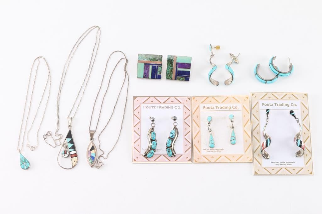 (3) Pendants on sterling silver chains. All Zuni inlaid, two maker marked. Measuring 9 1/2, 11" and 14" from drop.(6) Pair of pierced earrings. All with turquoise, some with other stones. Various styles including dangle and half hoop.