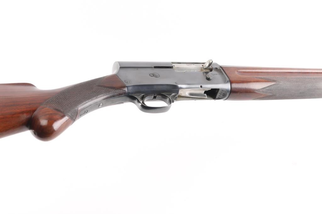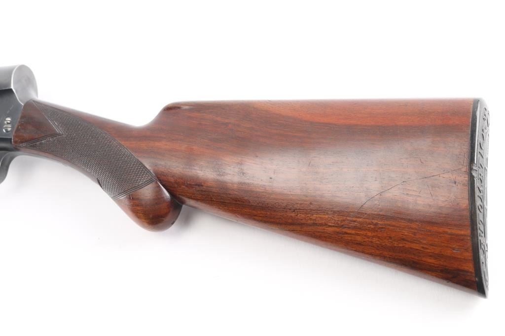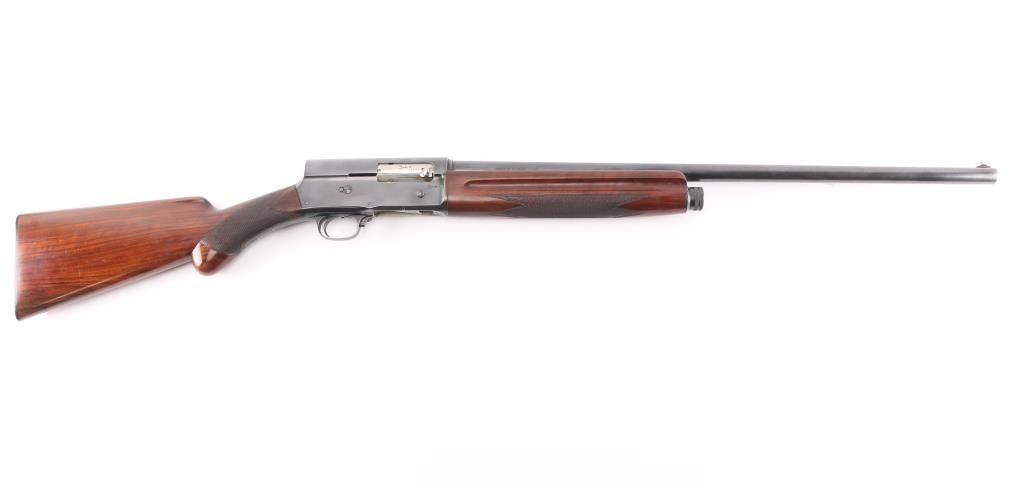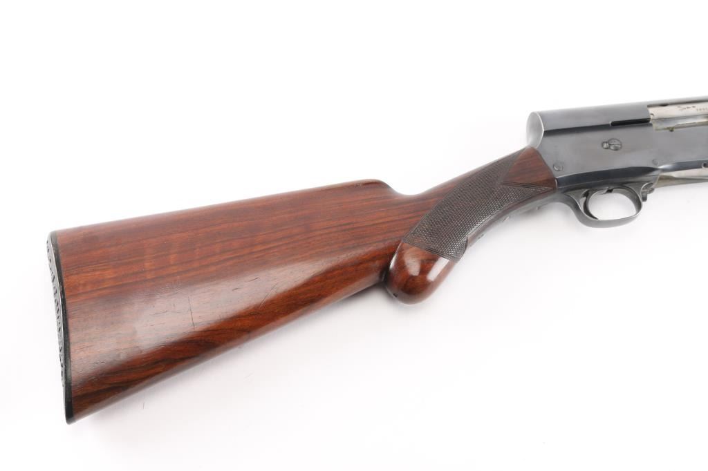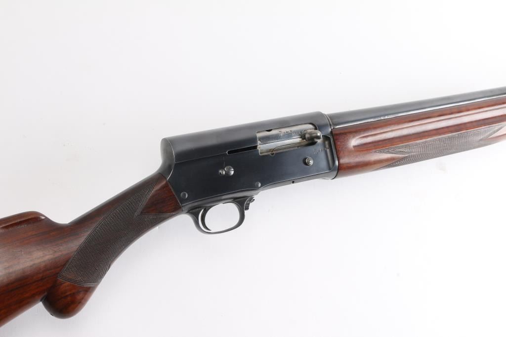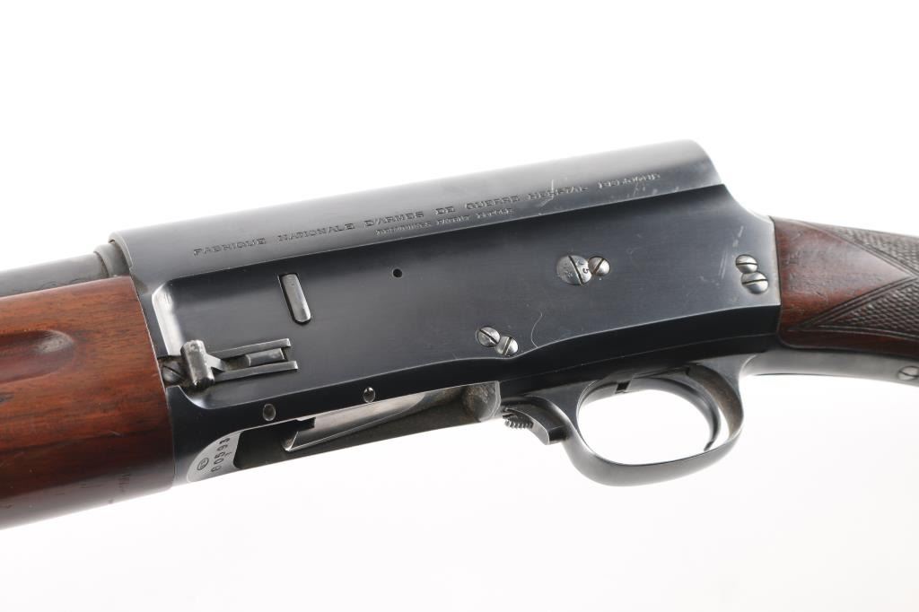 #80593. Belgian semiautomatic shotgun imported by Browning Arms, Ogden Utah. Manufactured pre1939. Accepts 2-3/4" shells. Features 25 1/2" round barrel with raised brass bead front sight, fixed modified choke, manual safety at front of triggerguard, checkered walnut stock & forend, Prince of Wales shaped grip, FN plastic buttplate,shell cut-off. Bore is execllent/bright. Retains 90%of original blued finish with thinning or bare metal at edges and where handled. Wood is very good condition with some minor scratches. Serial number matched on receiver, bolt and two larger receiver screws. Action is crisp/smooth. LOP is 14 1/4".Condition is NRA Near Excellent. C&R firearm.